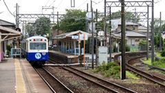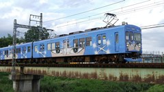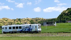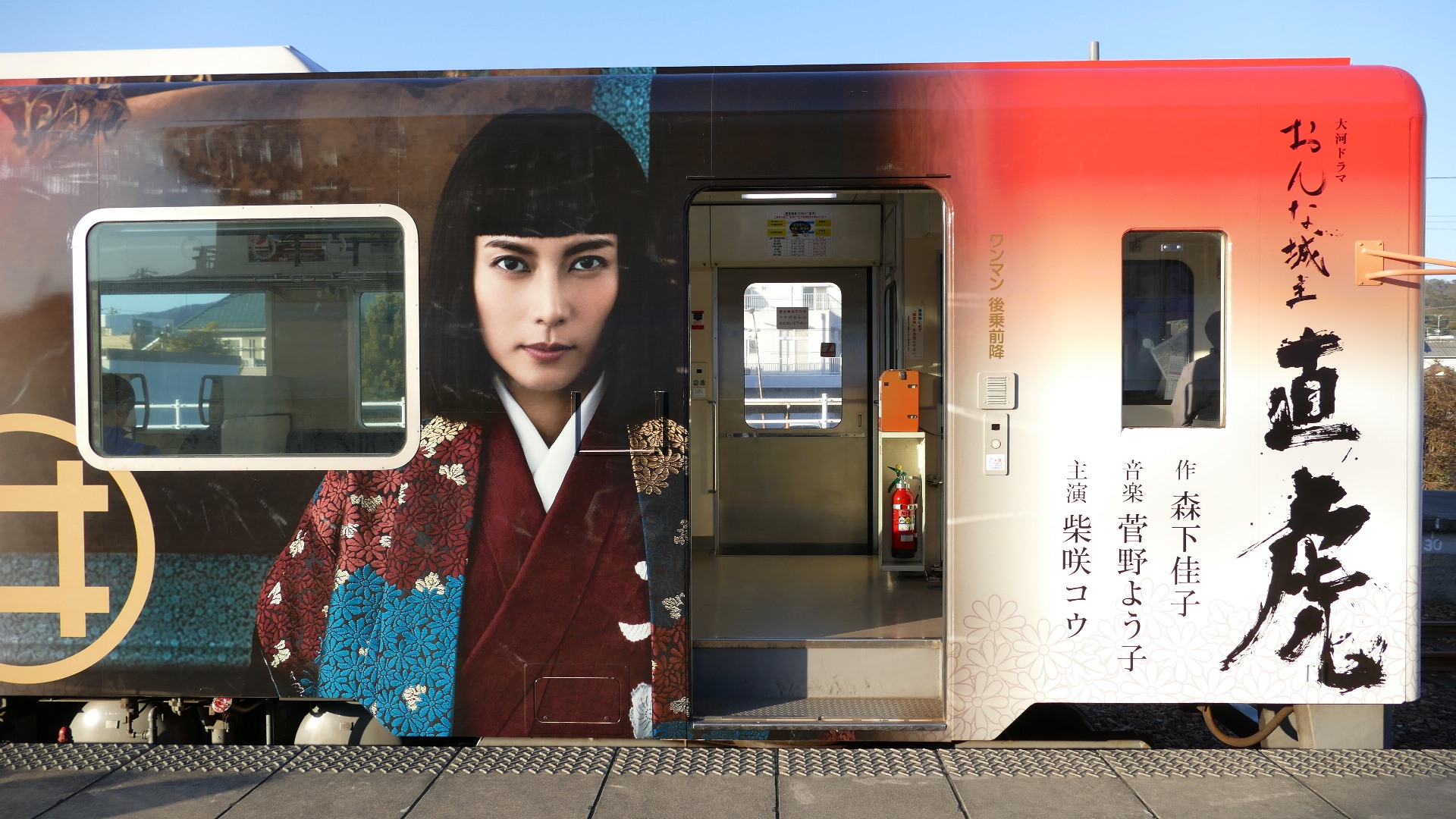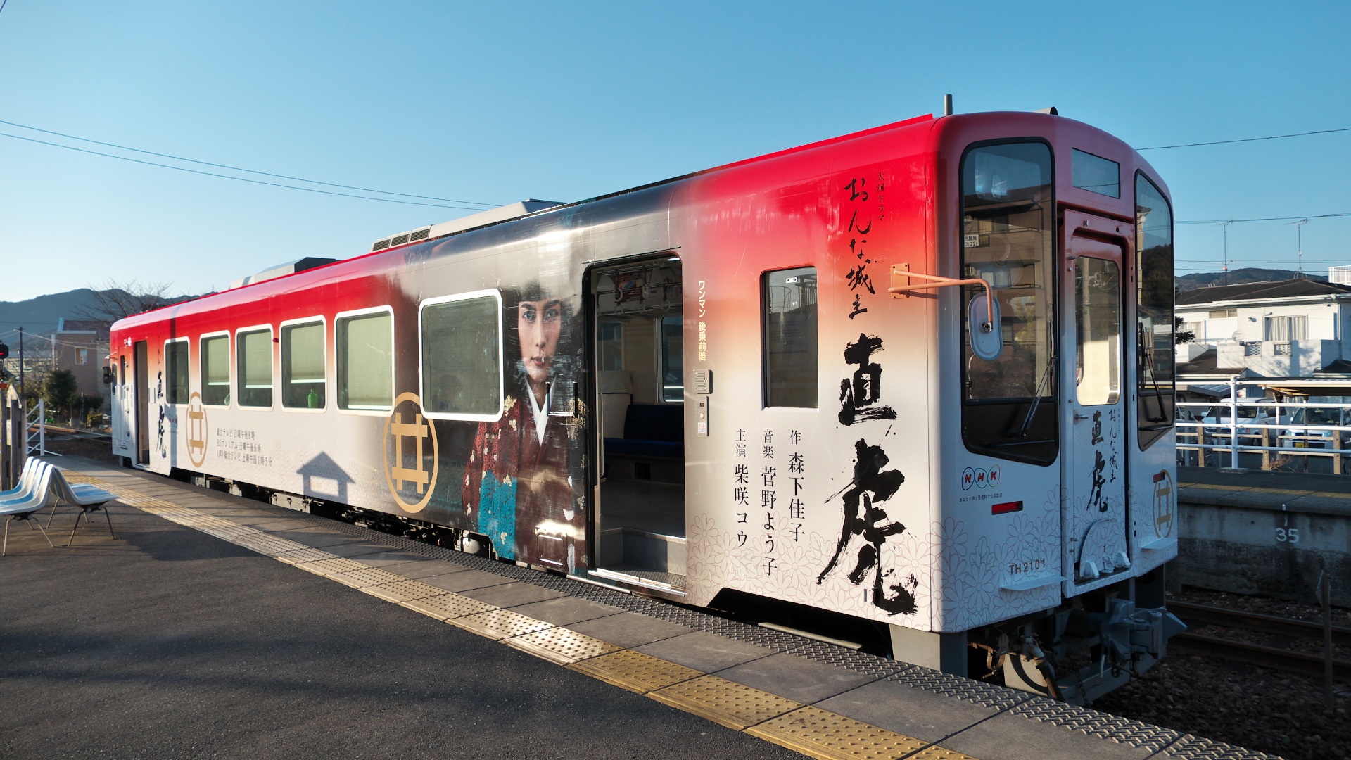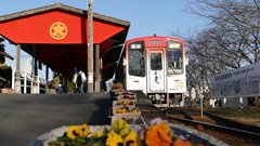 | 平成29年 大河ドラマ「おんな城主直虎」放送を記念してのラッピング。井伊家の家紋「丸に橘」のデザインが目を引く。 2016.9.18 | ラッピングいろいろ。 1000形「戦国BASARA」ラッピング 西鹿島駅 大河の直虎ラッピングは、1000形の他にも、タクシーや路線バスにも。 2017.2.19 |