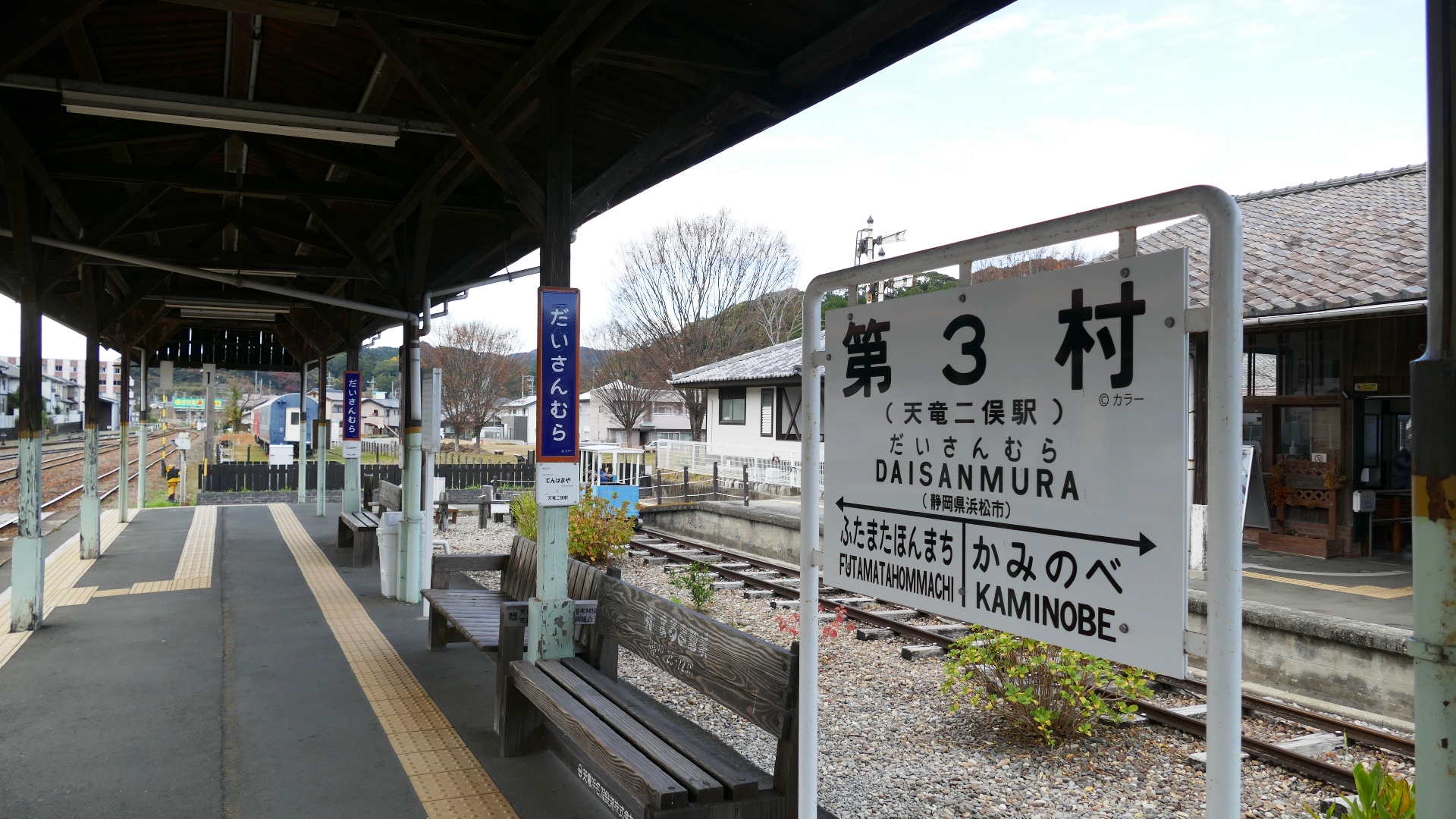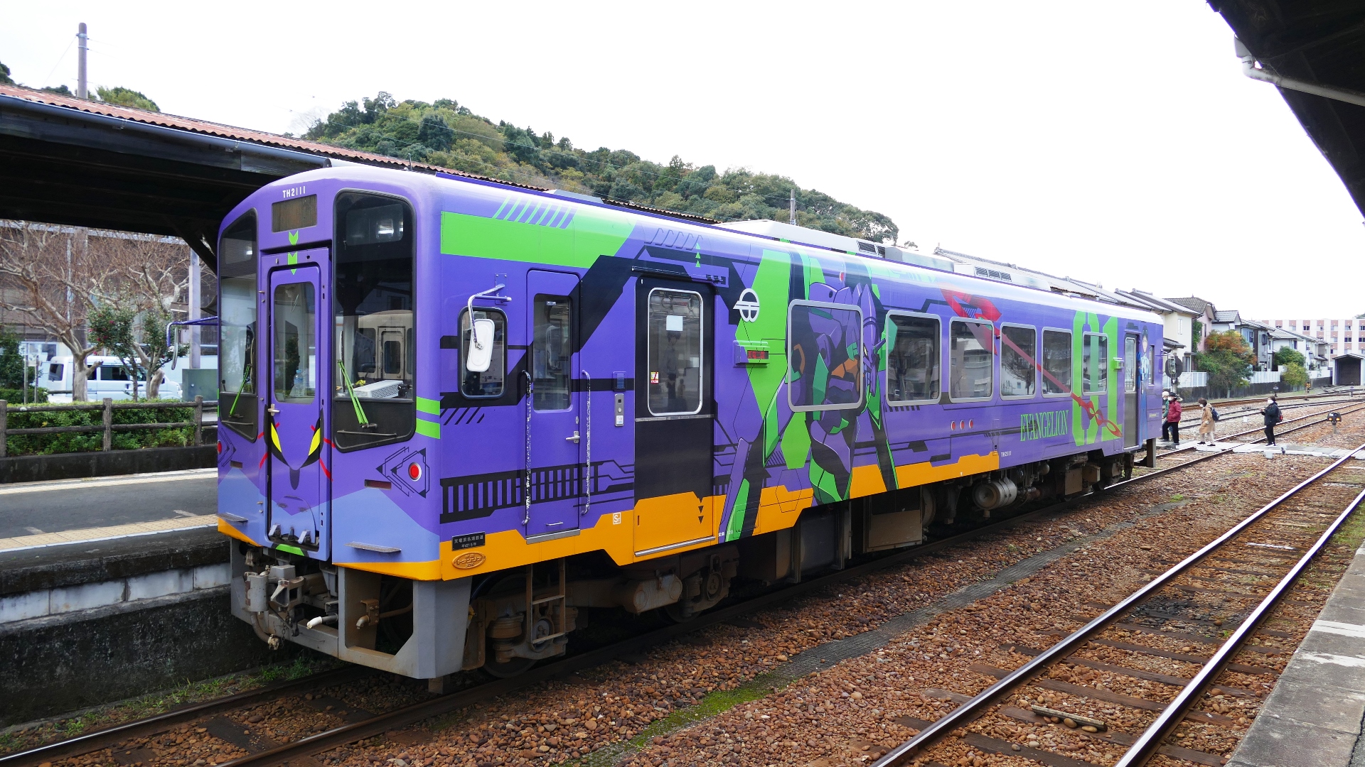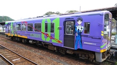 | EVANGELION 人類乗車計画 ラッピング列車が楽しい。 駅名表記が「第3村」 コラボが楽しい。 天竜二俣駅 2022.12 | |||||||