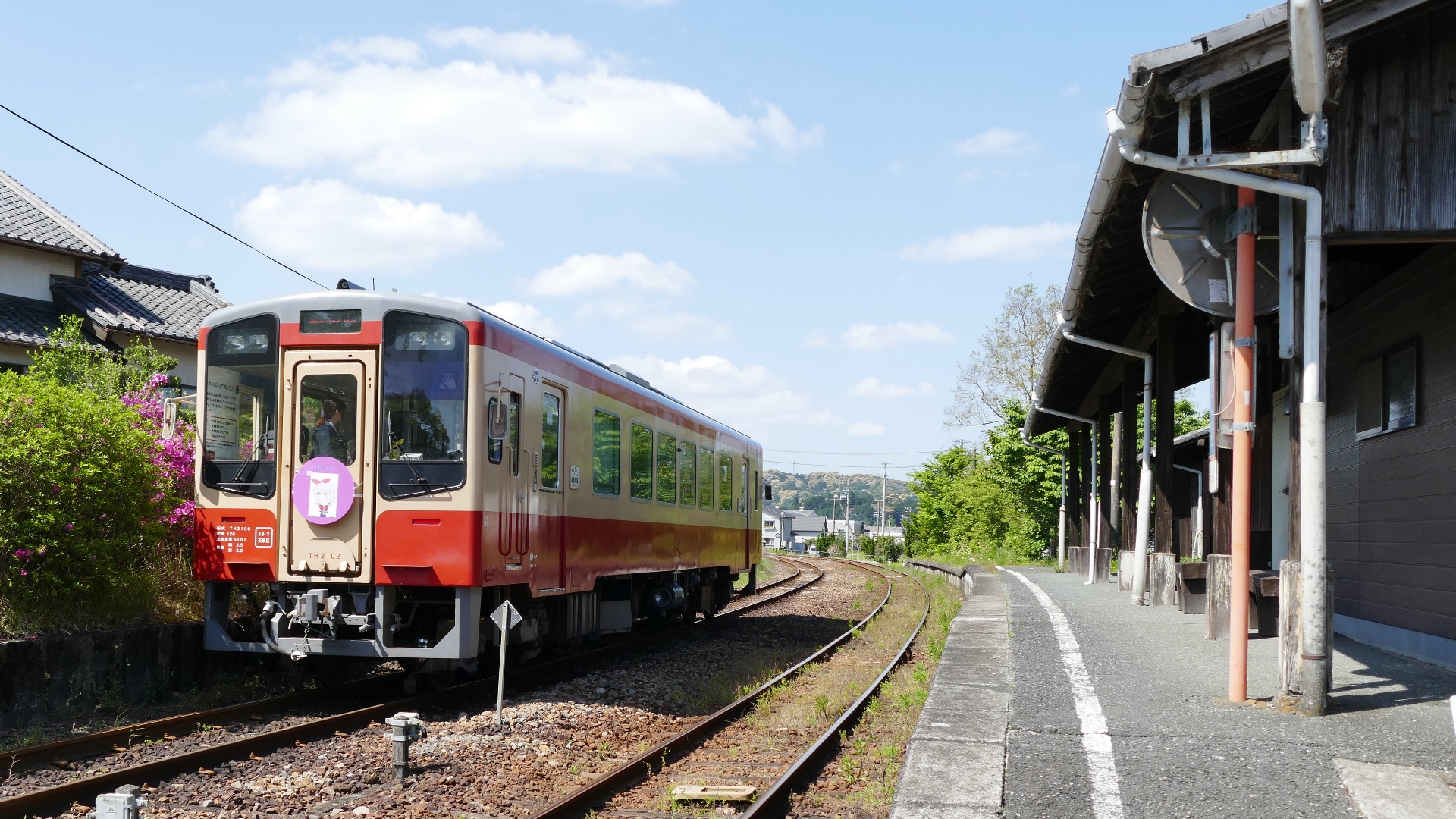 | キハ20色 塗装列車 遠江一宮駅 2023.5 | Re+(リ・プラス)ラッピング列車:懐かしの配色・湘南カラー 浜名湖が見える「寸座駅」 |
