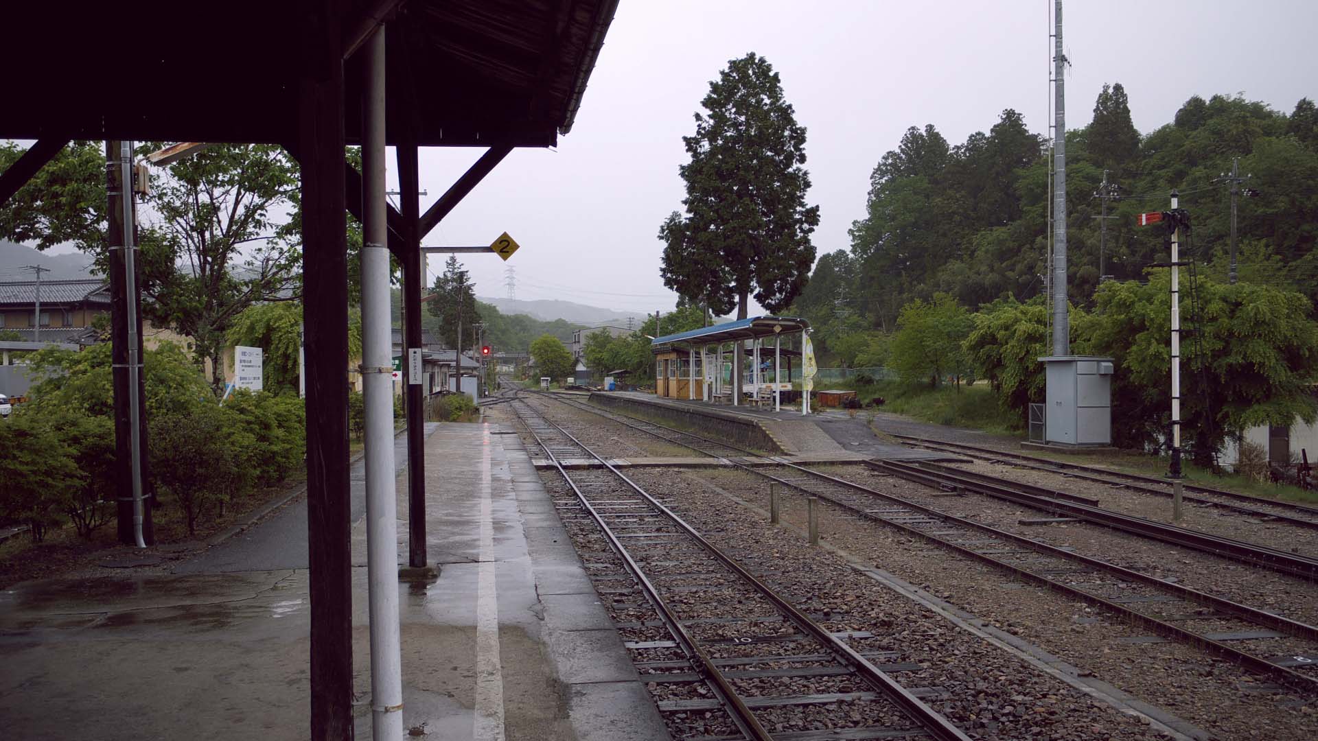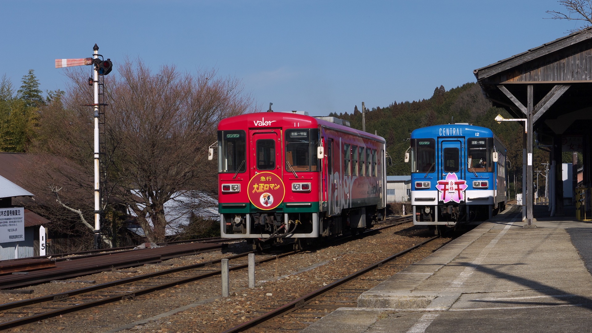 岩村駅 下り線ホームから。 腕木式信号機(復元)がある。 |