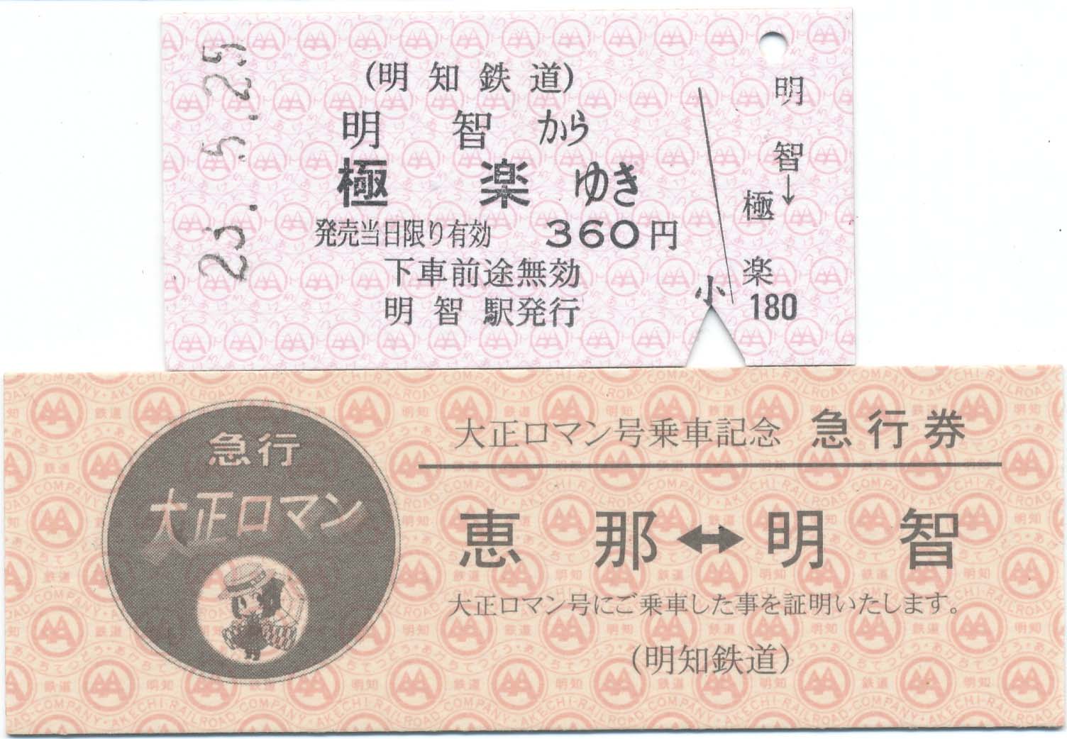 硬券「明智-極楽」を記念に購入したら 大正ロマン号の急行券がもらえた。 極楽駅は平成20年12/25に開業。 |
