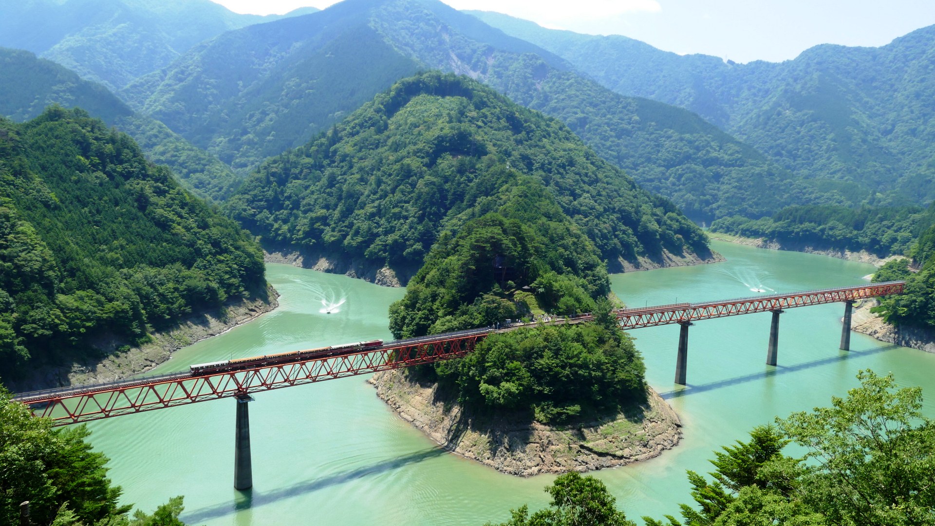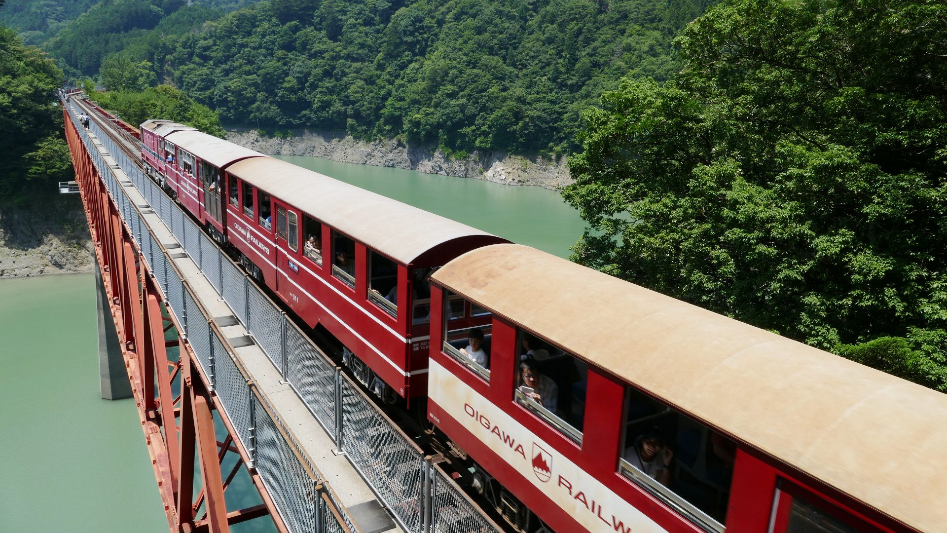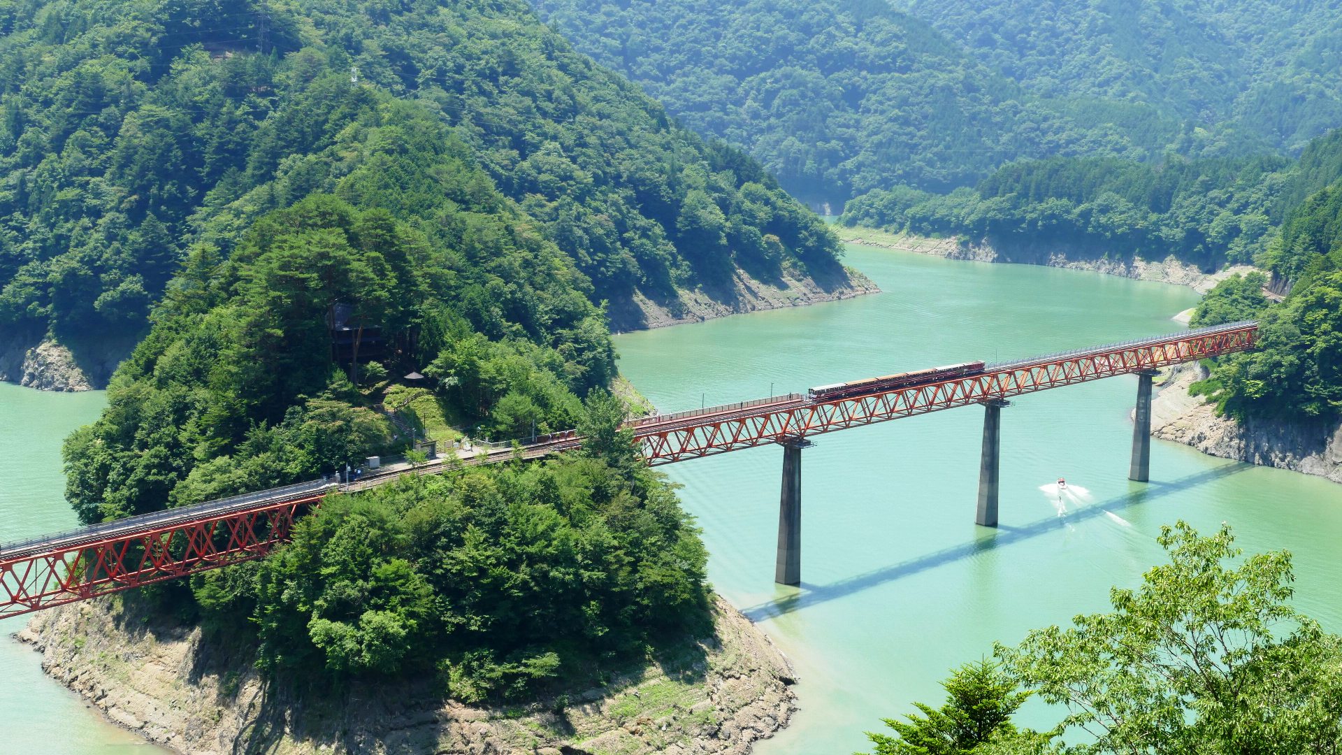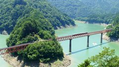 | 南アルプスあぷとライン(井川線) 「奥大井湖上駅」は長島ダムのダム湖である「接阻湖」に浮かぶ湖上の駅。そこに架かる橋は「レインボーブリッジ」という名で、東京港のレインボーブリッジより先に命名。 2018.7 |