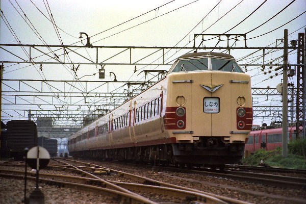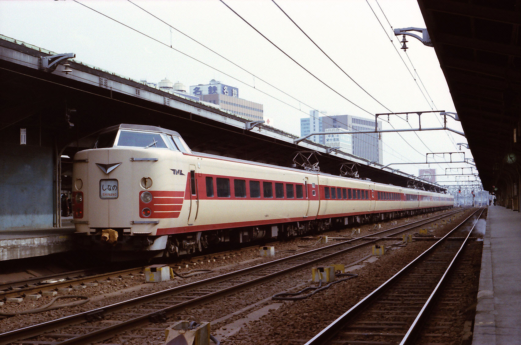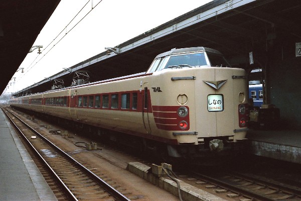 J 撮影:昭和51年頃 名古屋駅 お世話になった「しなの」381系。 行き先表示はすでに「長野」行き。 |