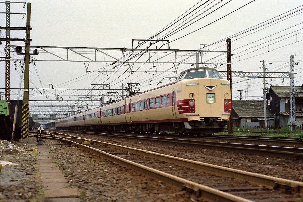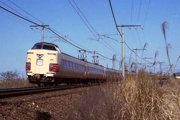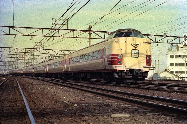 D 撮影:昭和53年1月頃 撮影場所不明 中央本線? 381系は屋根の上がスッキリしていて パンタグラフの背が高いです。 |