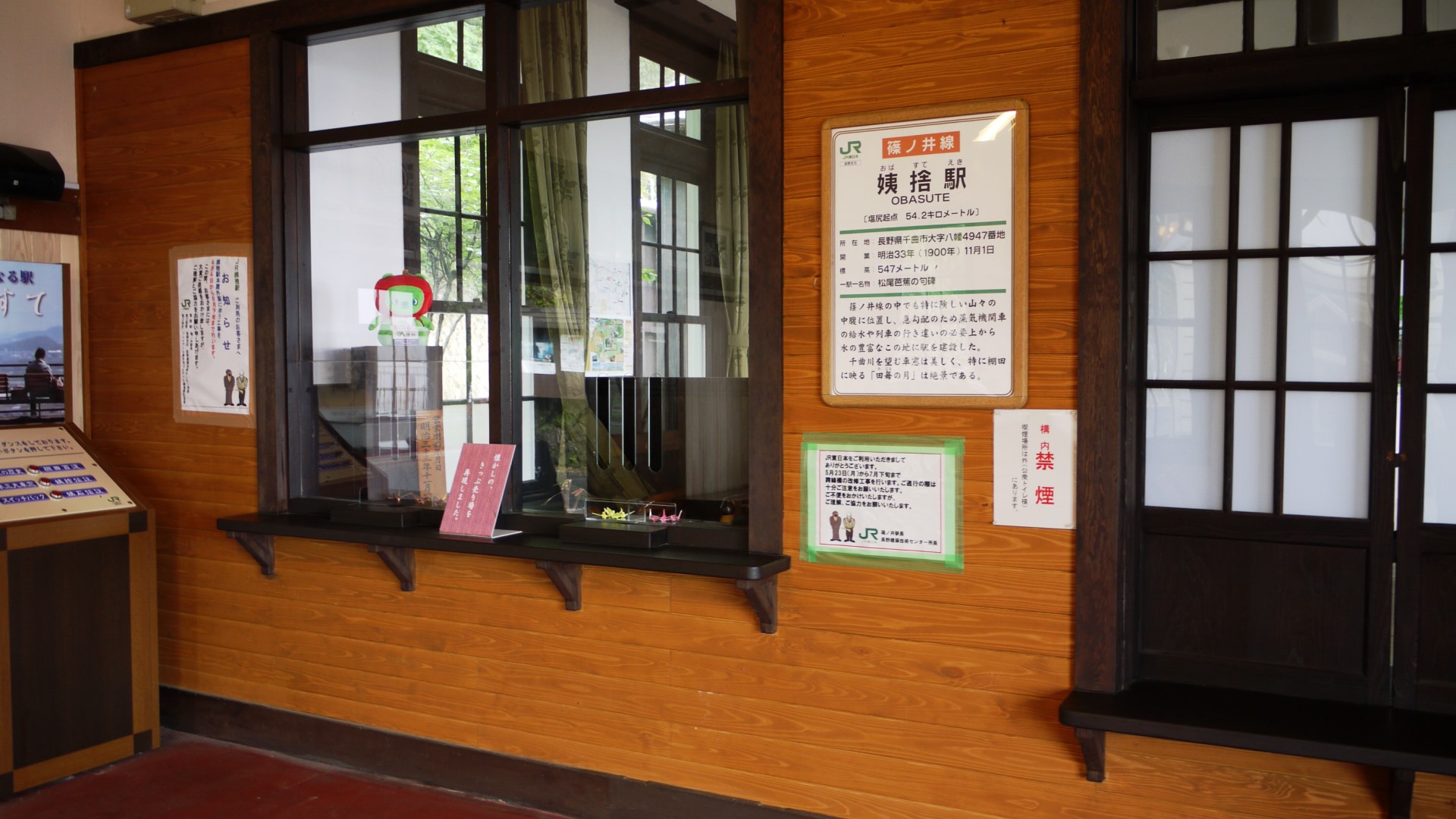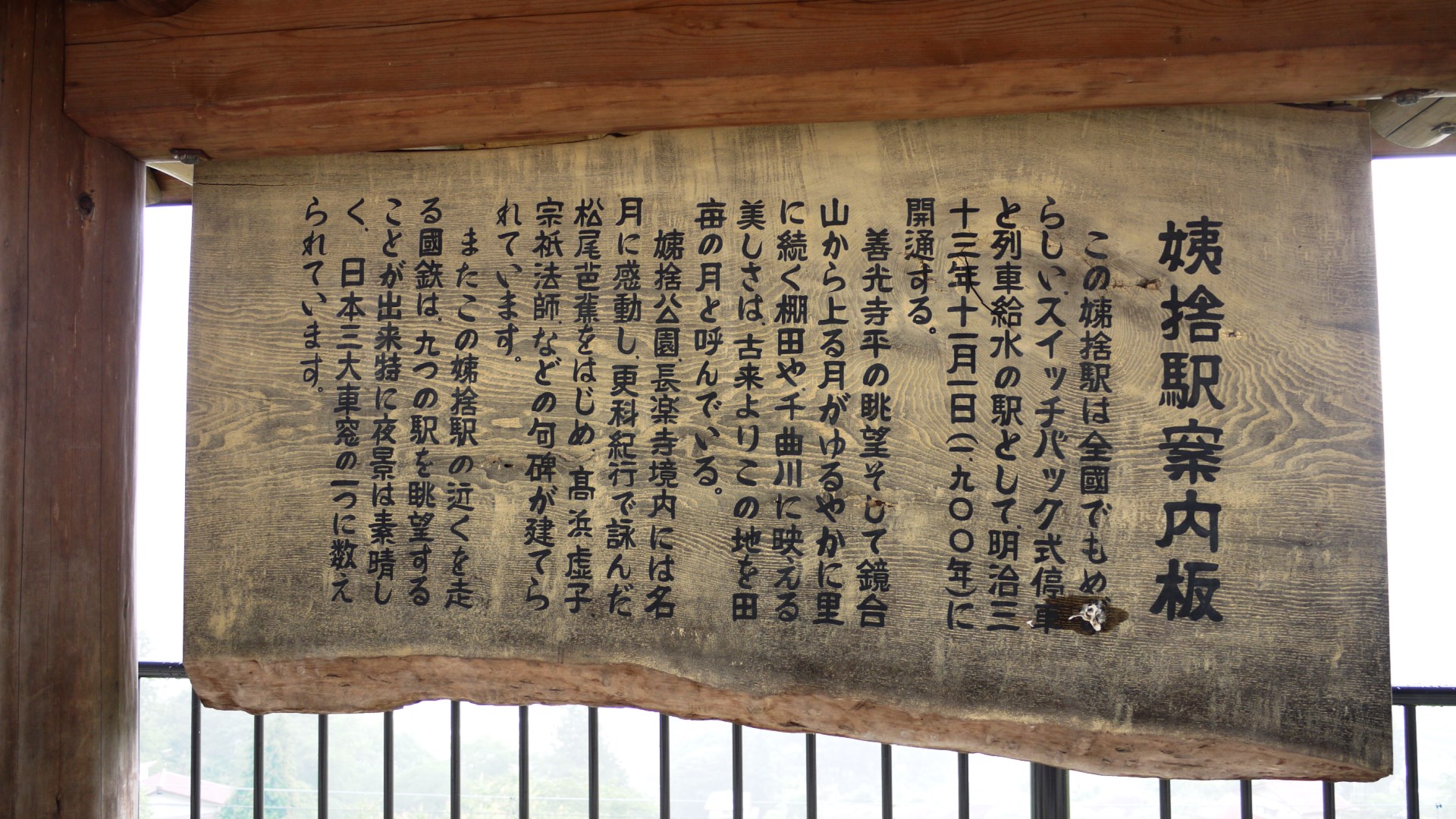 | 篠ノ井線 姥捨駅 駅看板 ホームから見下ろす善光寺平は日本三大車窓の一つ。またスイッチバック方式を擁する駅で有名。「足を延ばしても訪れたい駅」第2位。 2011.6 |