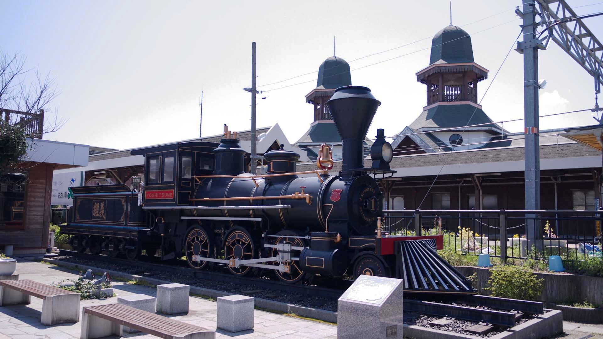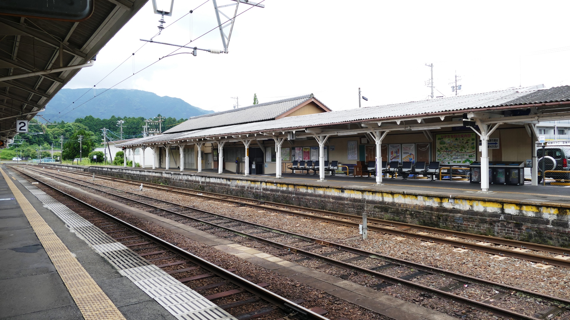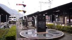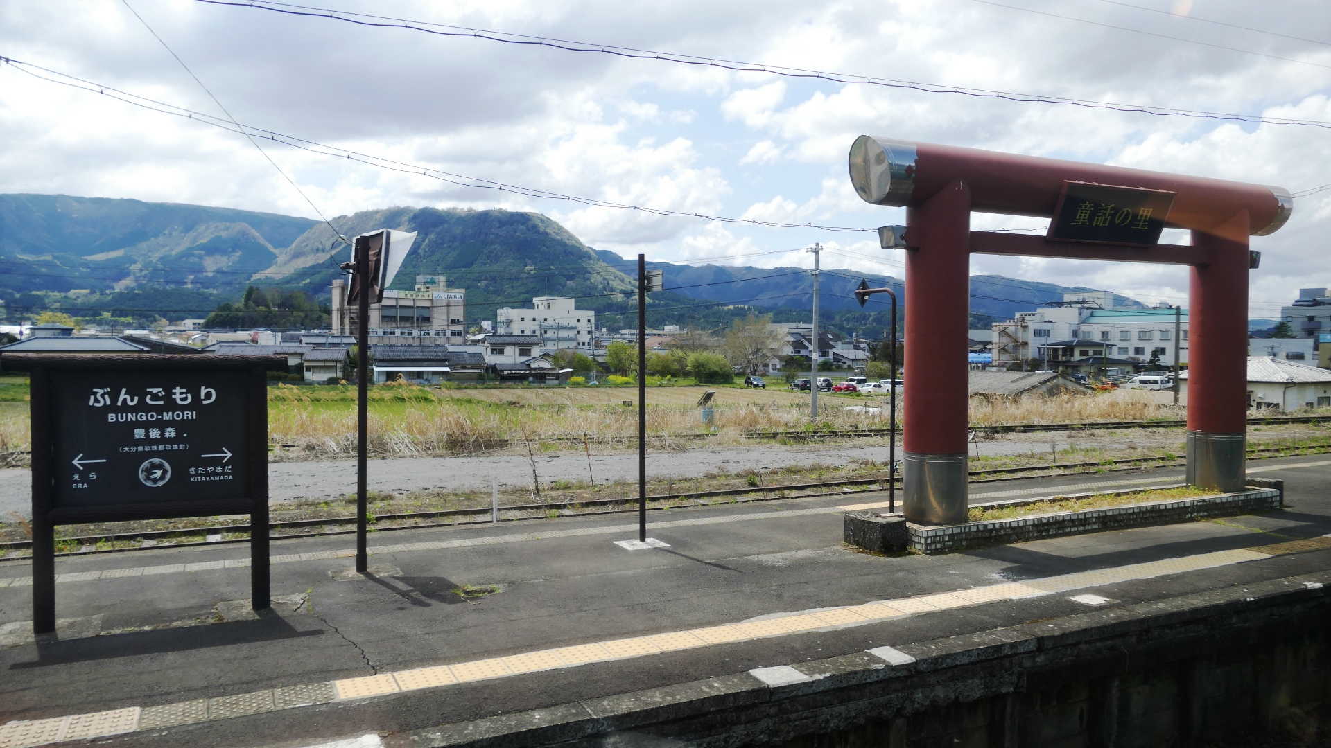 久大本線・豊後森駅 ホームの鳥居には「童謡の里」とあり「夕やけ小やけ」の童謡作家さんの生地。ゆふいんの森号から。 | ||||||