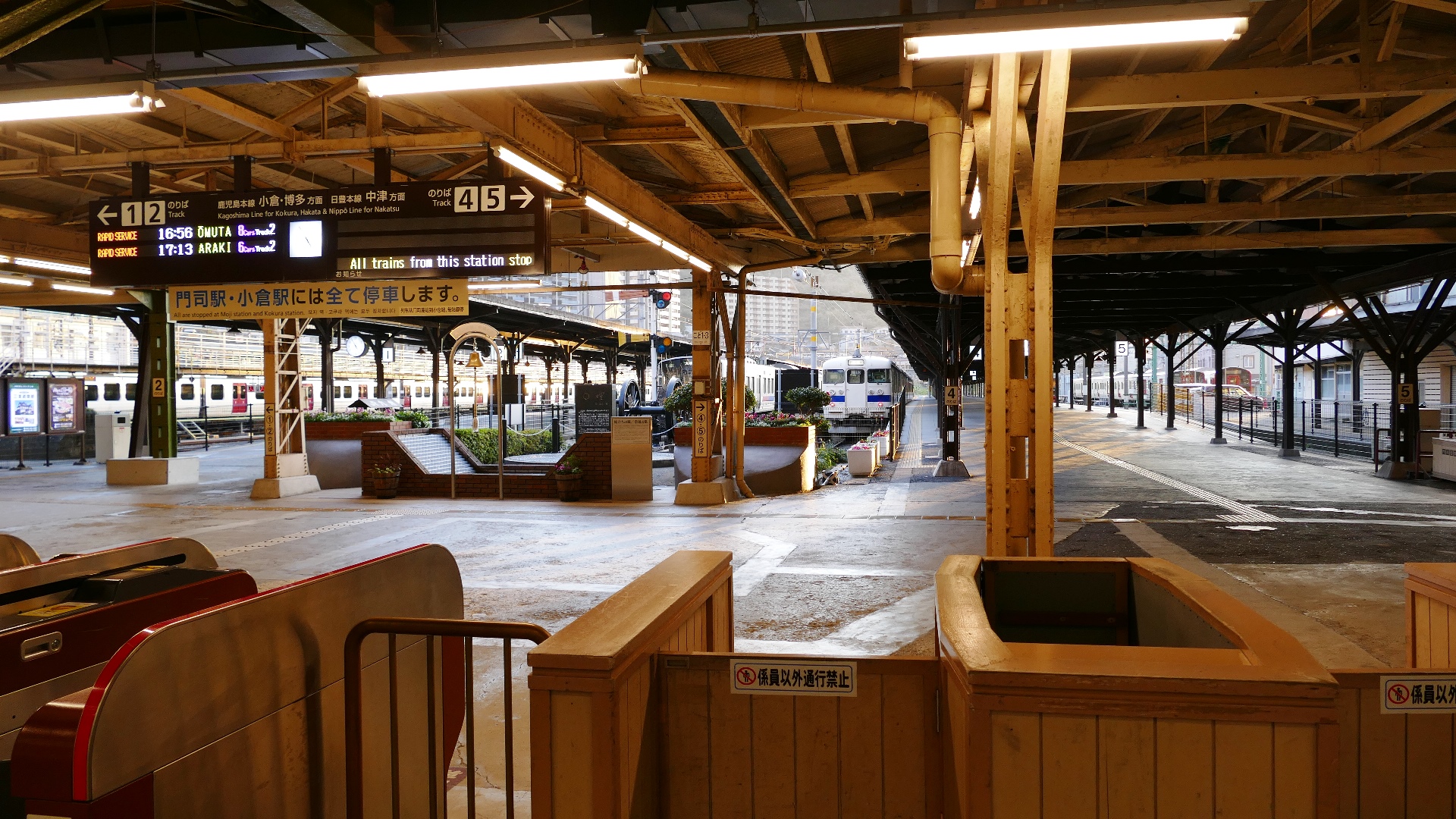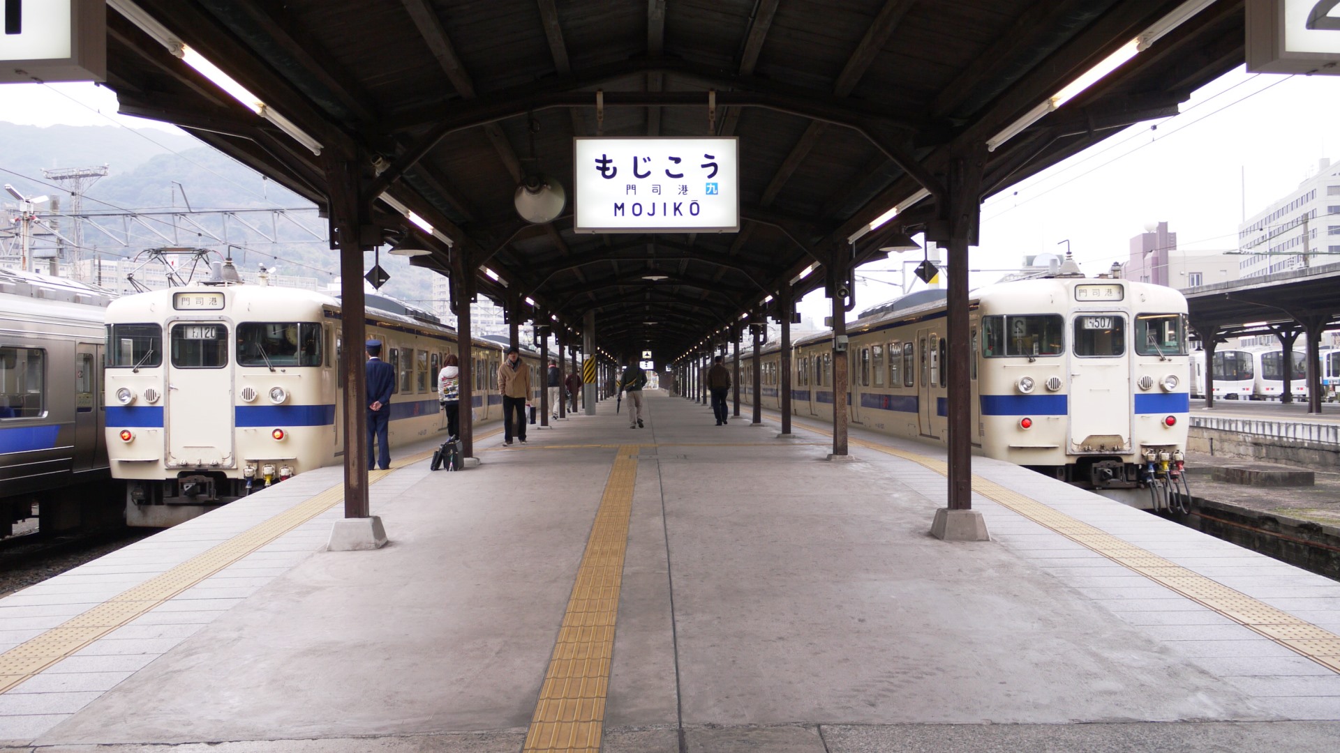 | 門司港駅 リニューアル前 趣のあるホーム、九州の鉄道の起点の記念石や関門連絡線通路跡など見所が多い。「足を延ばしても訪れたい駅」全高第1位。 2012.1 | |||||||