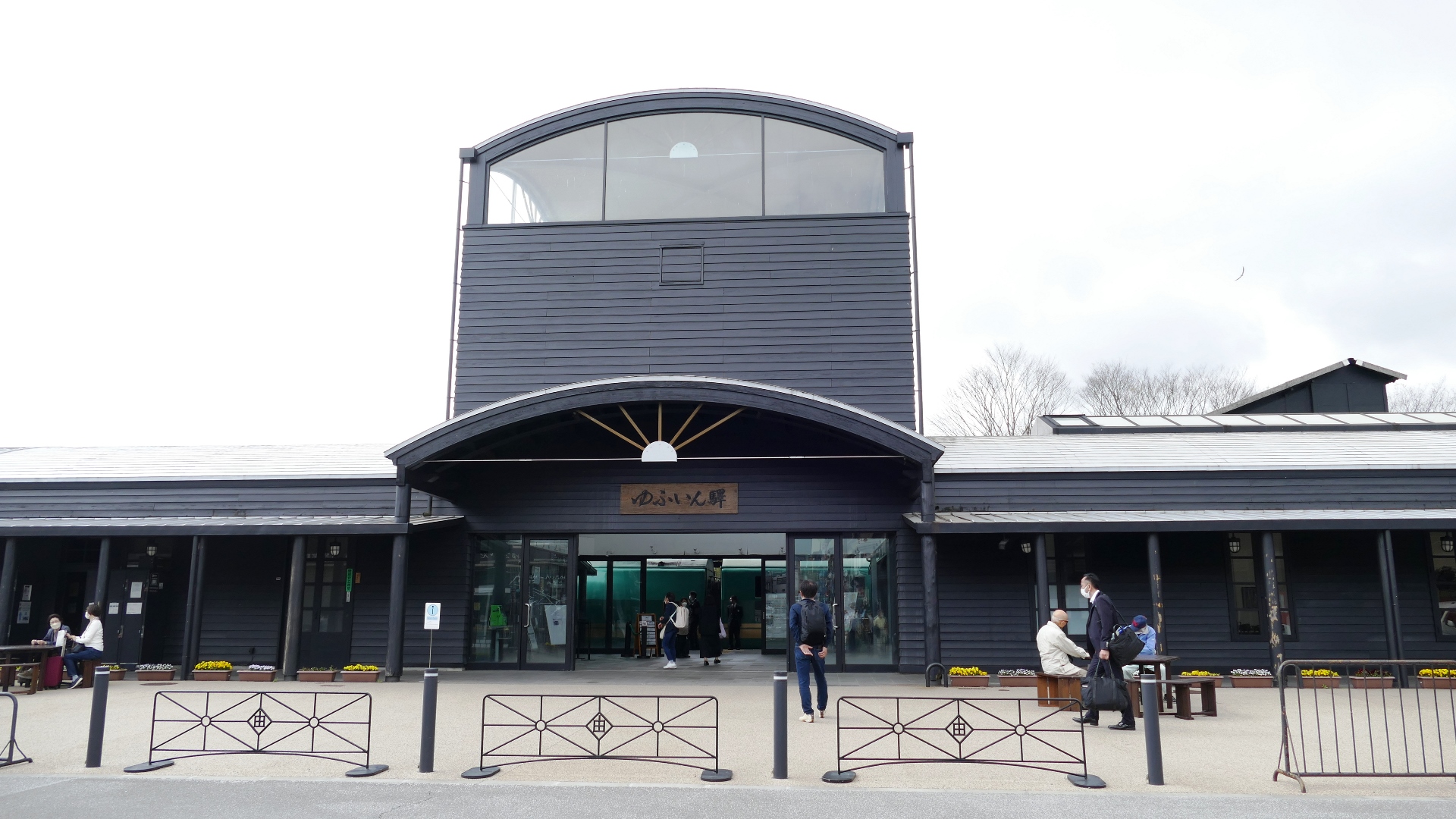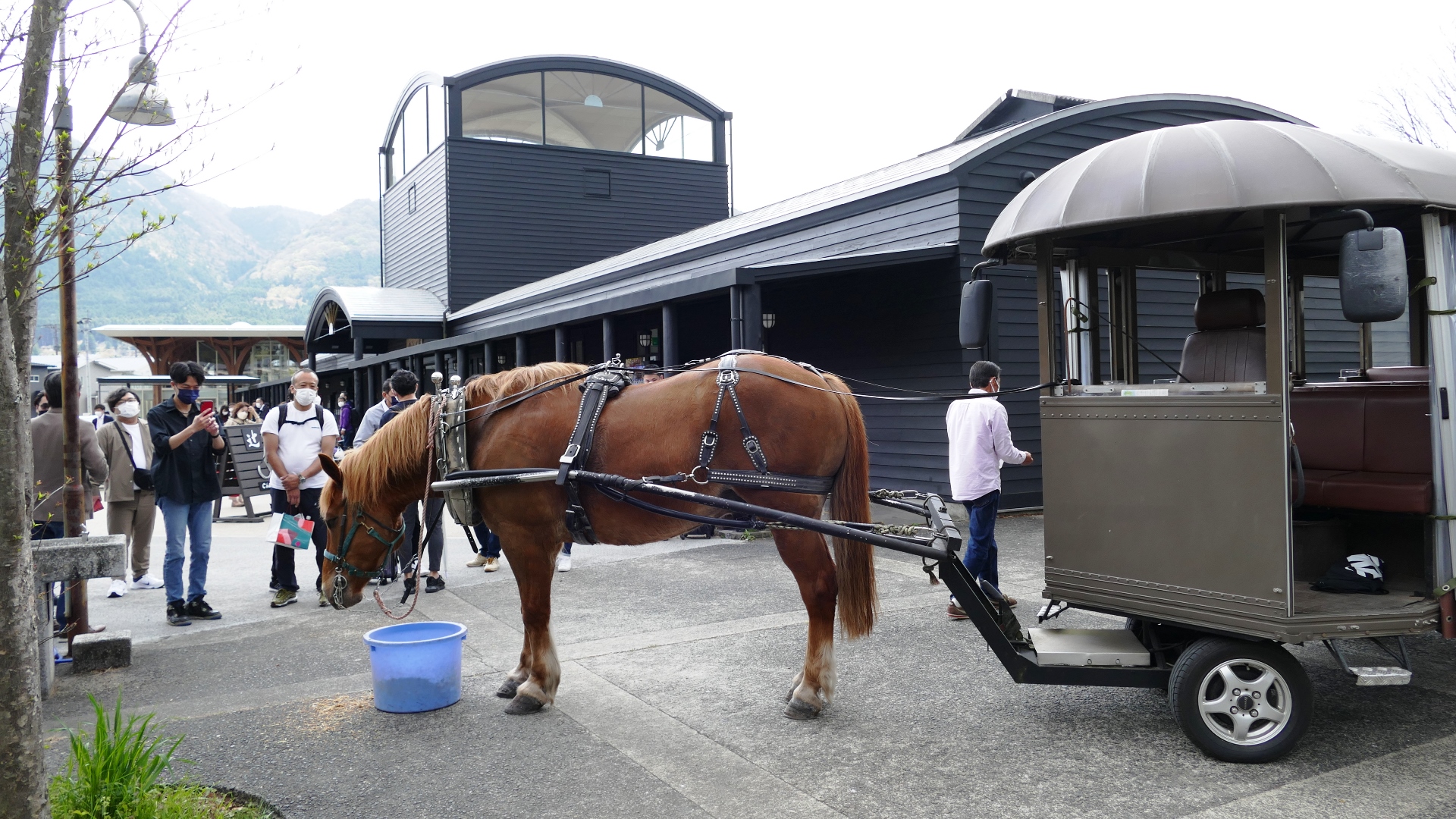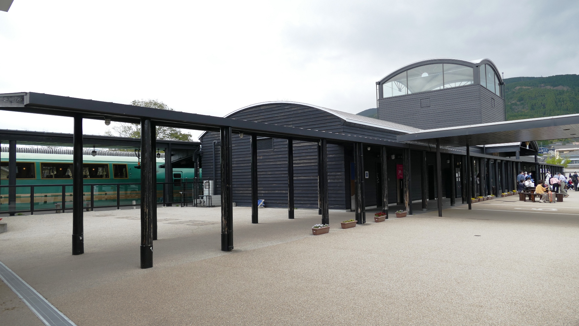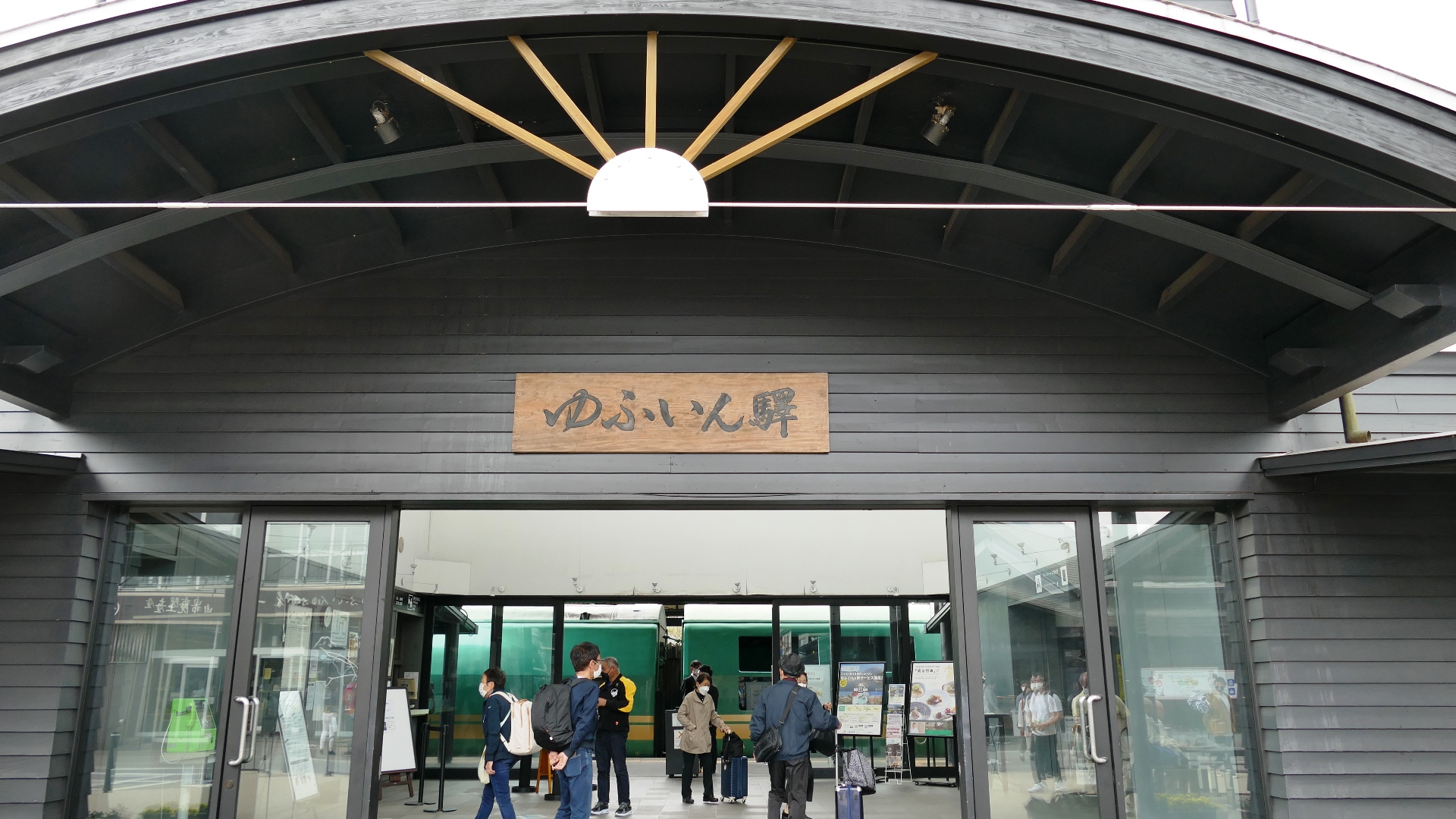 | 久大本線・由布院駅 住所は大分県由布市湯布院町 駅舎は1990(平成2)年建替えられた。木造黒塗りの外観や礼拝堂がイメージされた吹抜けのあるコンコースはモダン。辻馬車に乗っての観光もイイ 2022.4 |