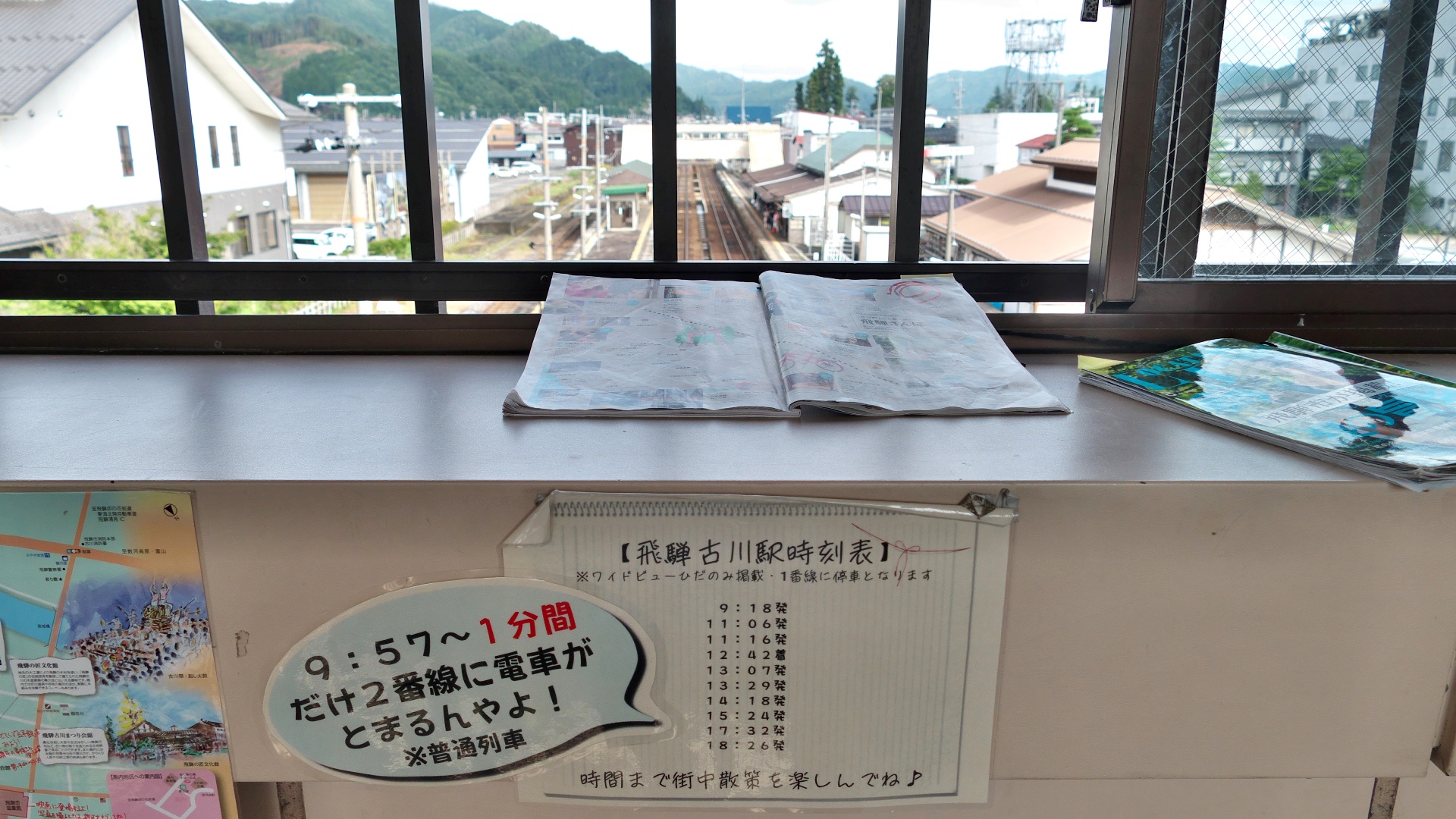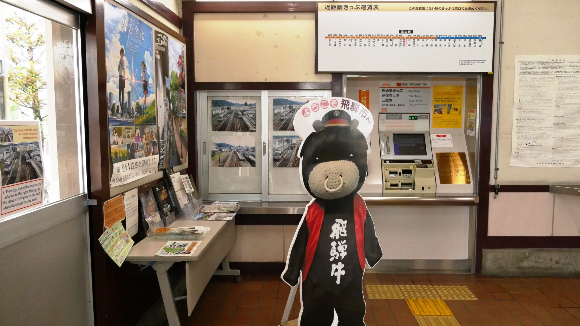 | 飛騨古川駅 飛騨牛のマスコットキャラクター「ひだくろ」 2017.7. 映画「君の名は。」ロケーション。飛騨古川駅を渡る北側跨線橋から見た風景。ここは親切に時刻表まで掲示してある。 |