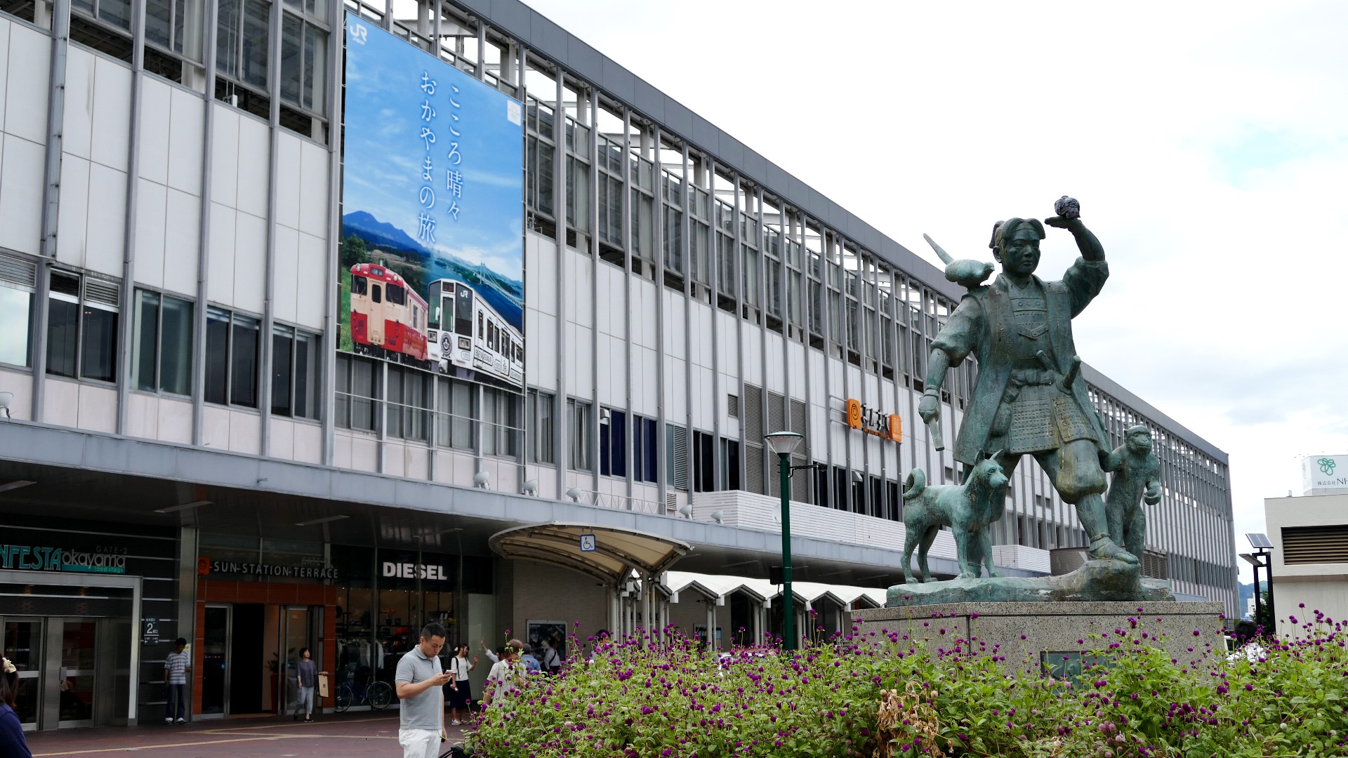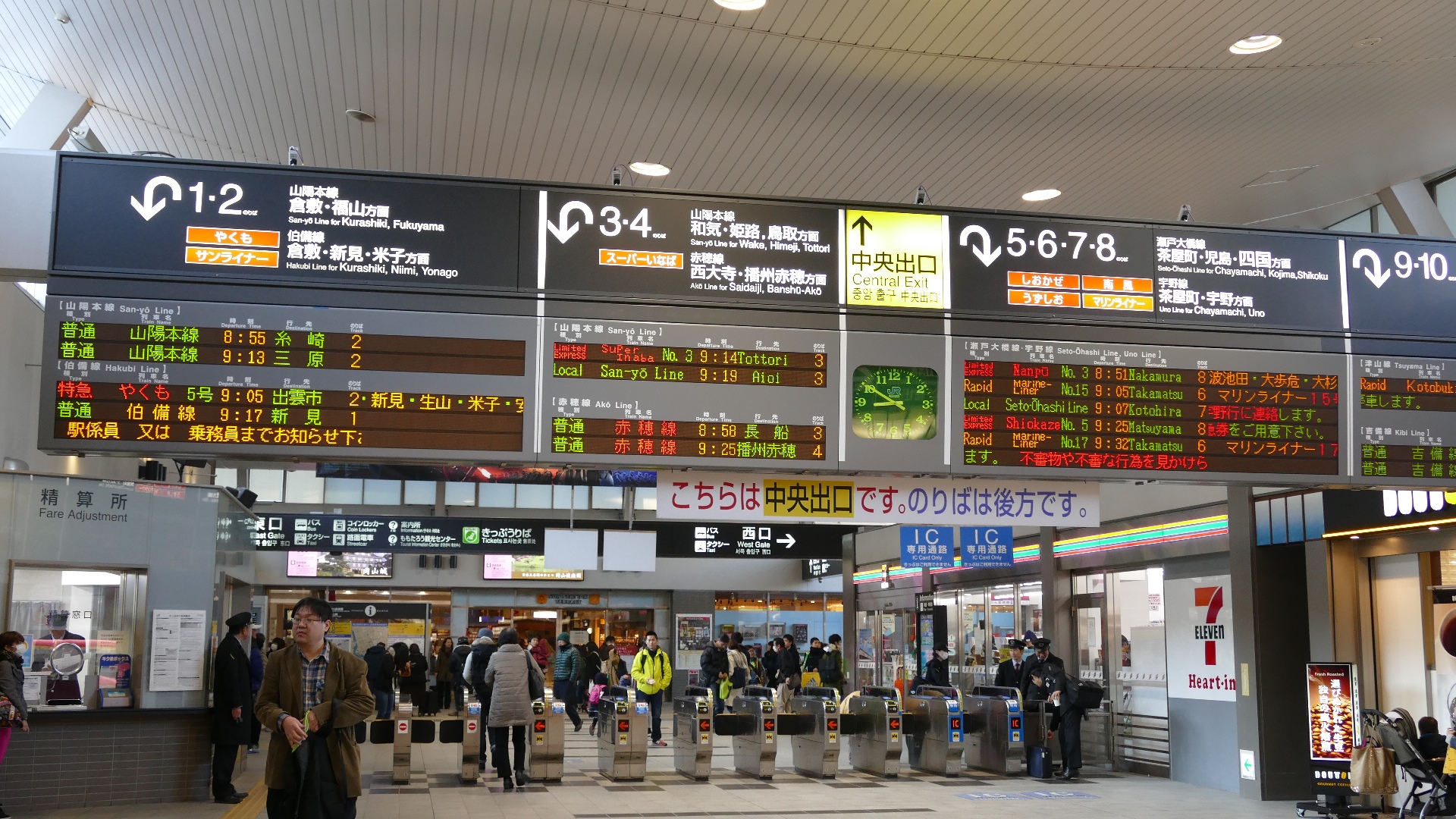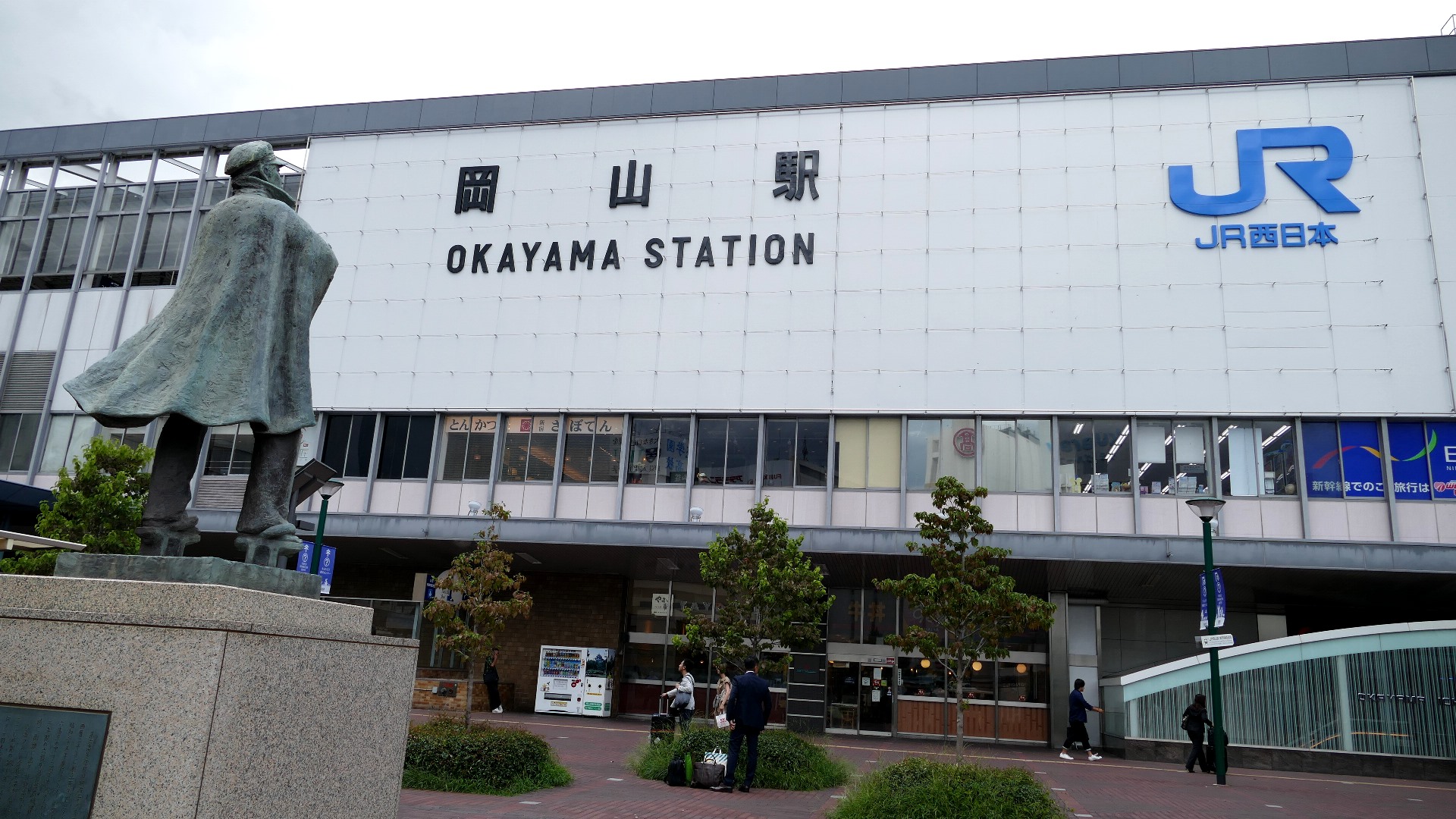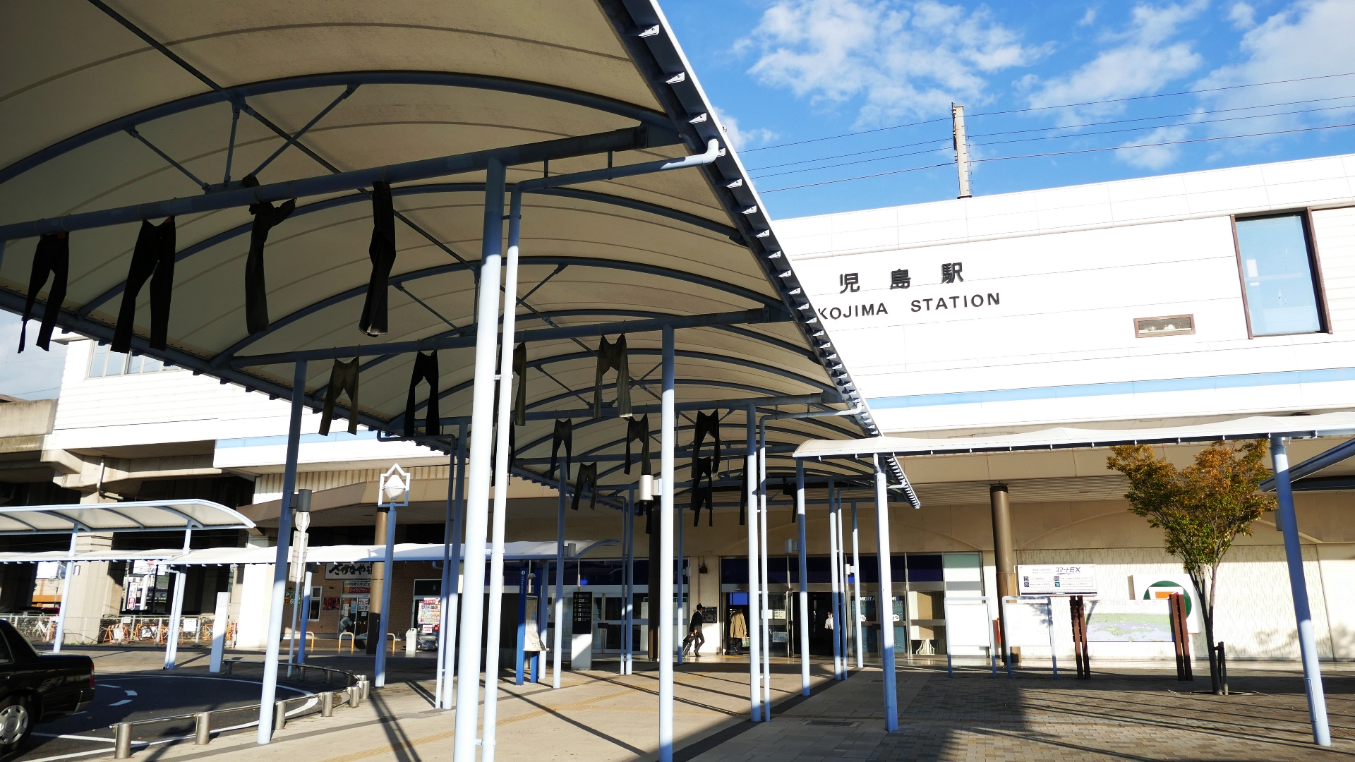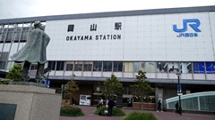 | 岡山駅 駅前には誰か分からない銅像と、有名な桃太郎像がある。 2016.9・2016.1 | 児島駅 JR四国との境界駅 倉敷市児島地区はジーンズで有名で、コインロッカーや自販機、階段もがジーンズラッピングされている。 2021.10 | ||||||
