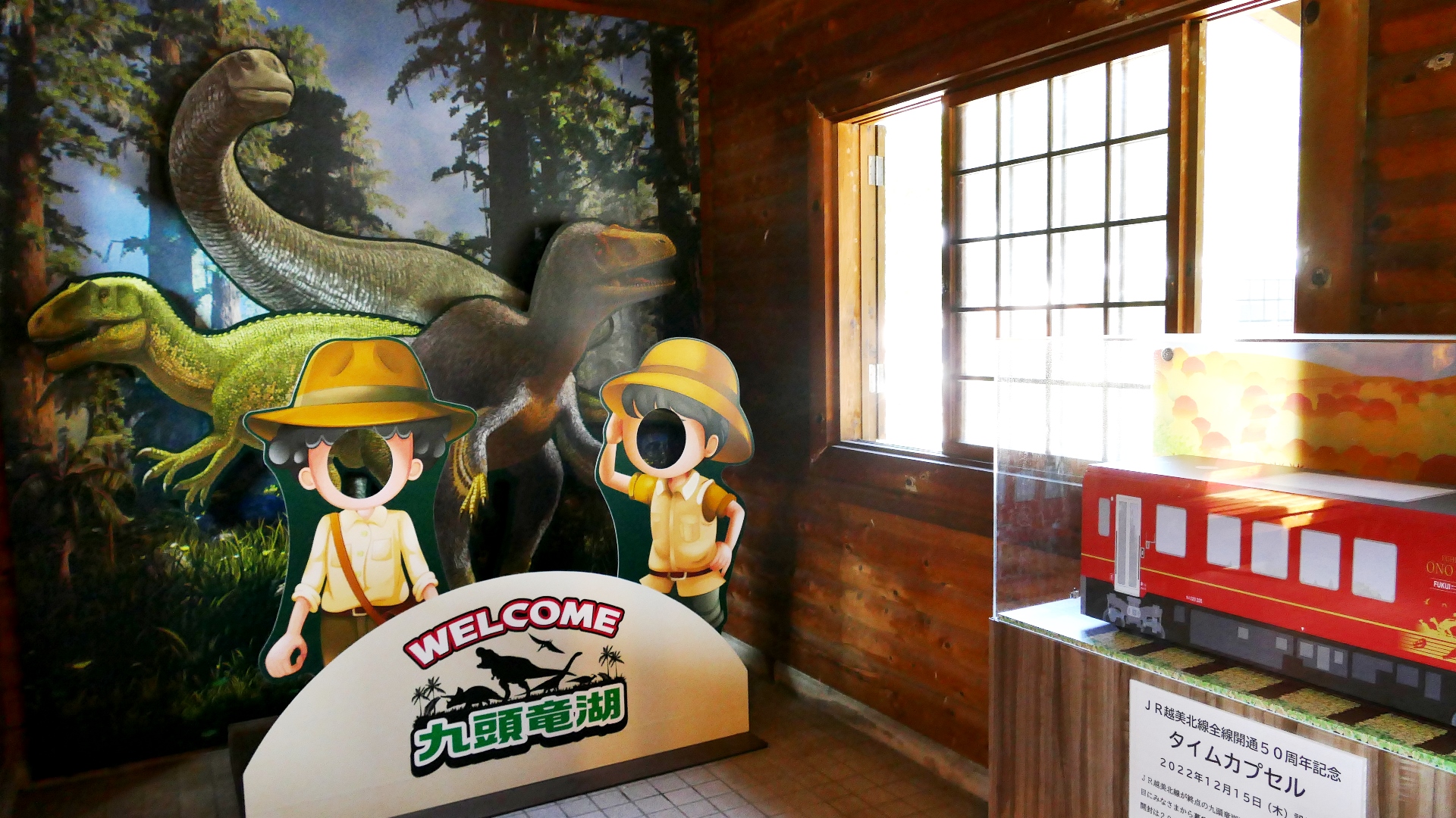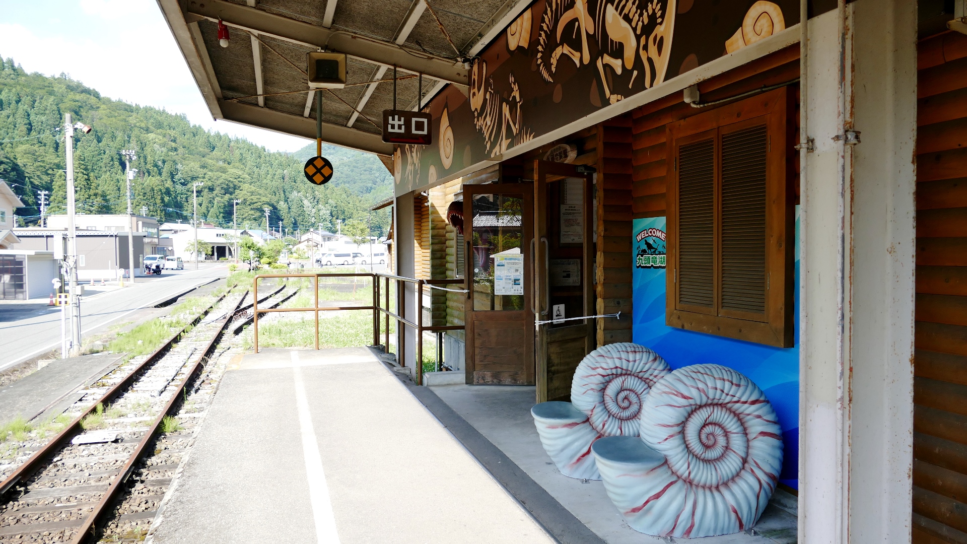 リニューアルされた九頭竜湖駅 2023.7 恐竜時代をコンセプトに。ベンチもアンモナイトに |
