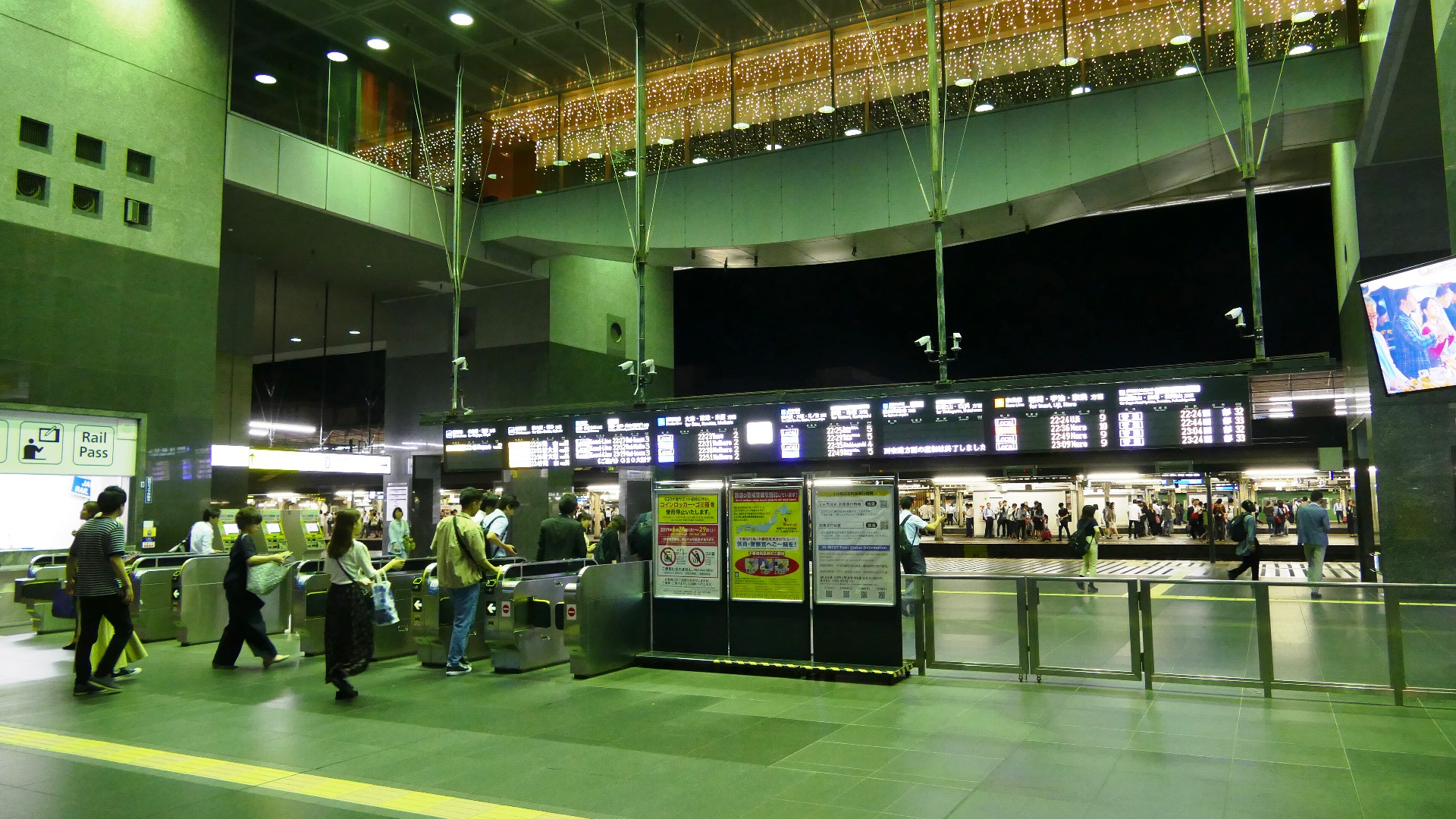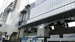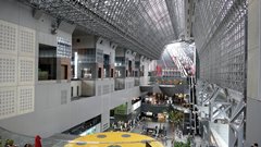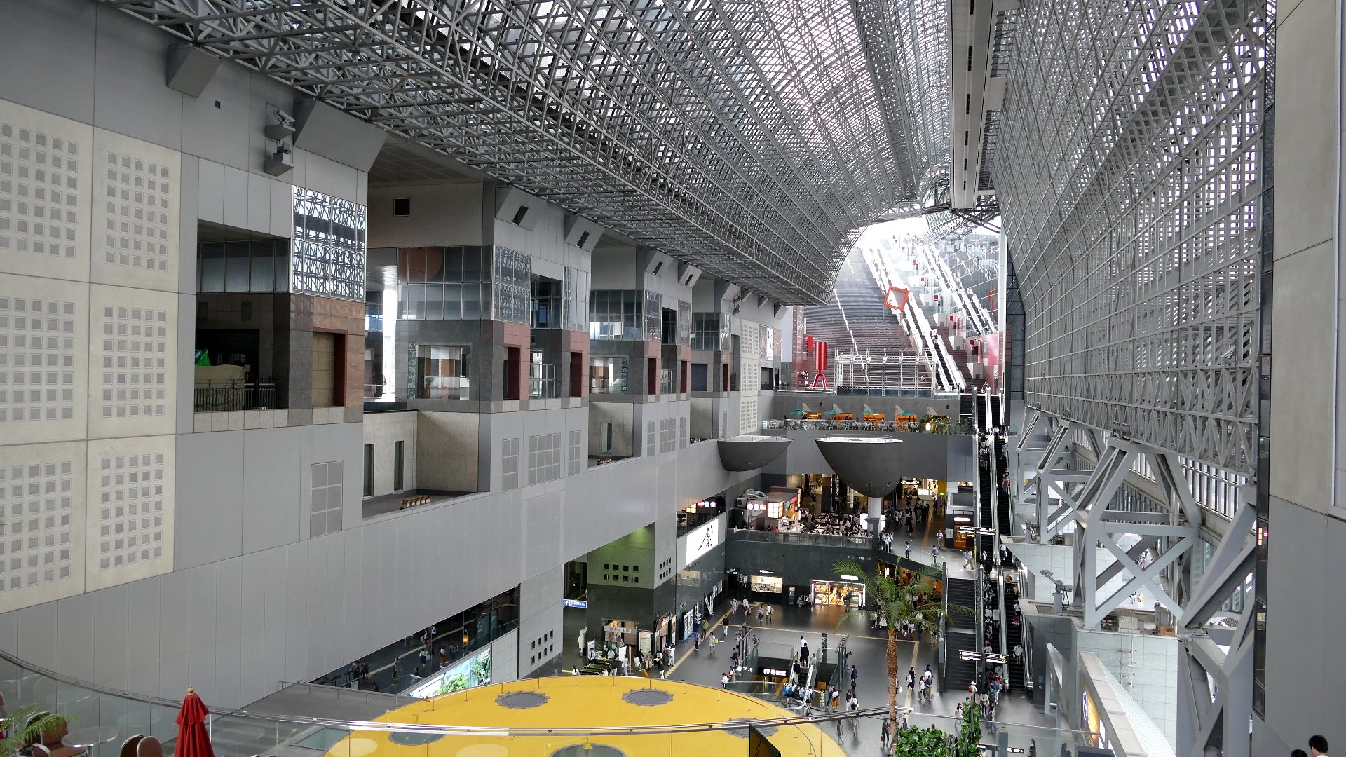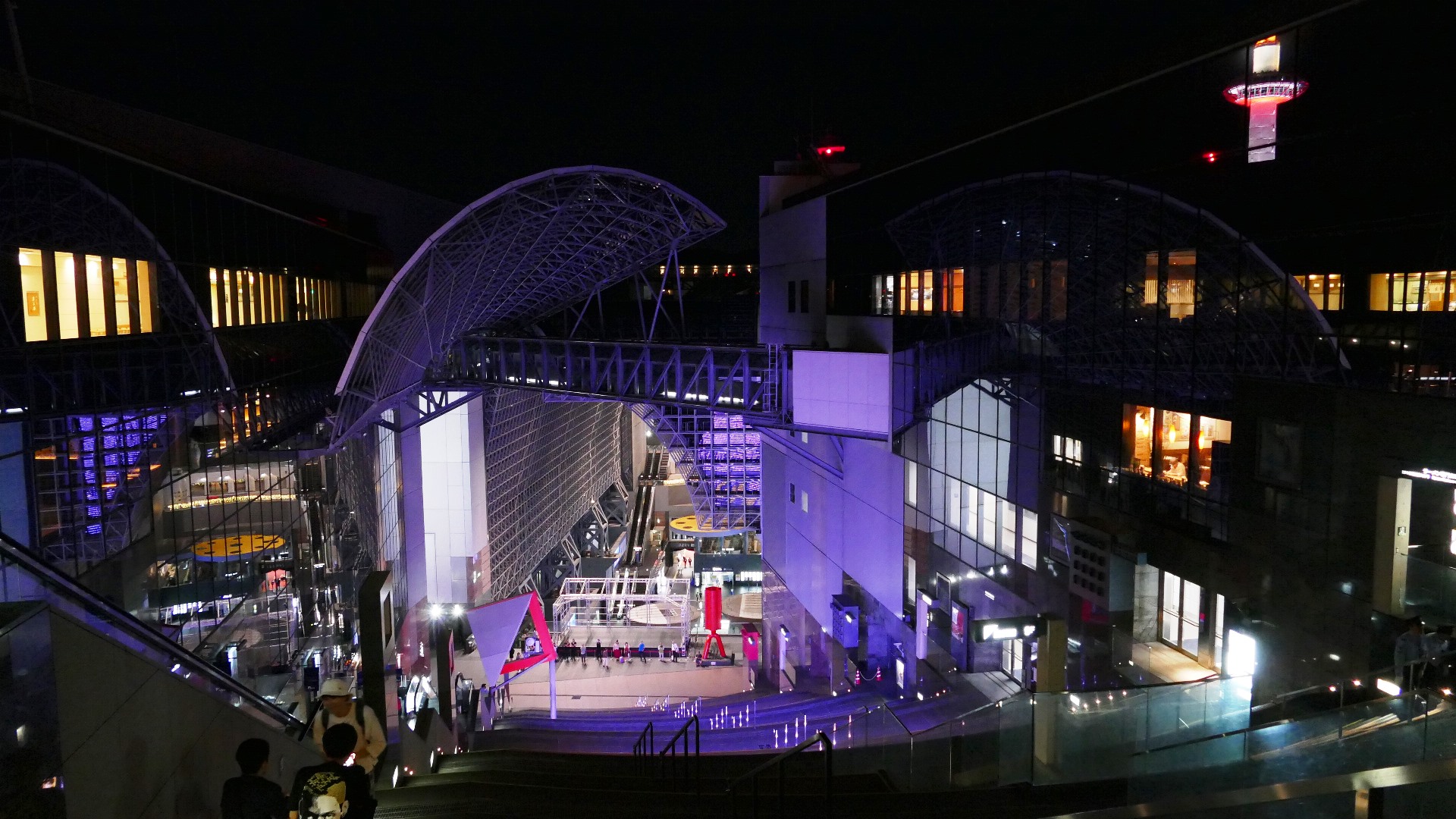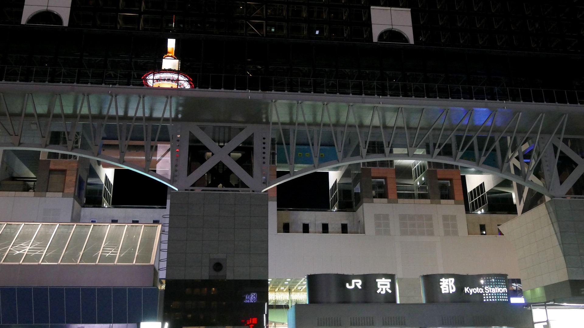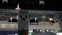 | 京都駅 京都の景観を邪魔しない近代的な駅ビル。段数171段、高低差は11階建てビルに相当する35m、全長70mある大階段は憩いの場となっている。2014.9 | 夜の京都駅。京都タワーが美しい 2019.6 | ||||||