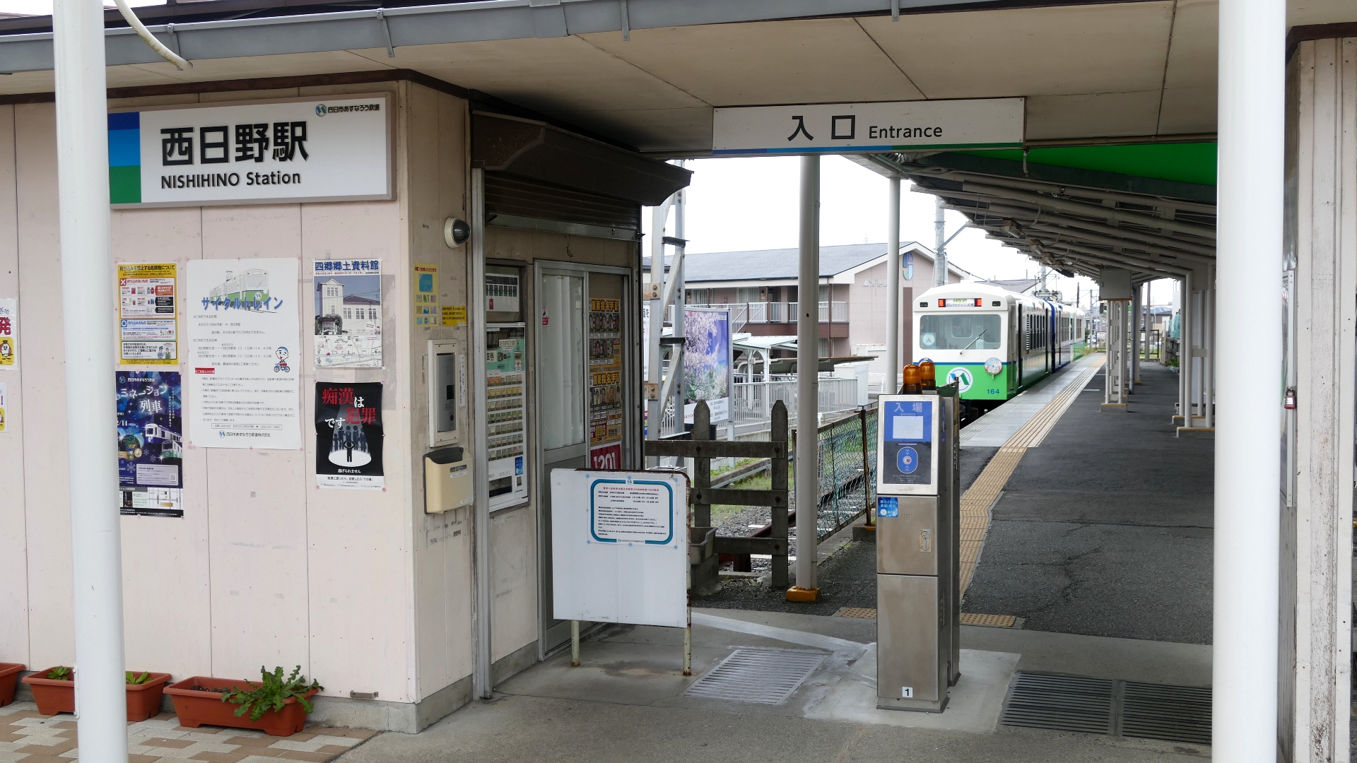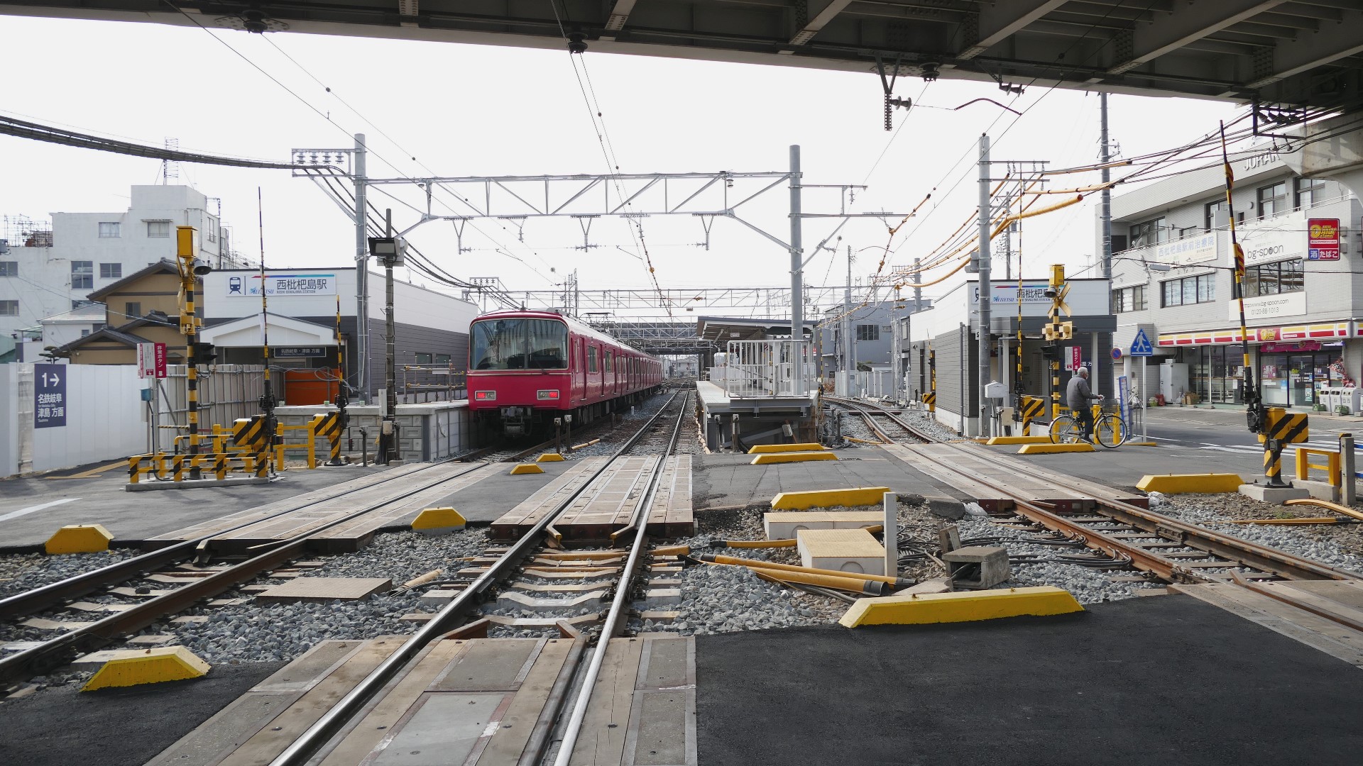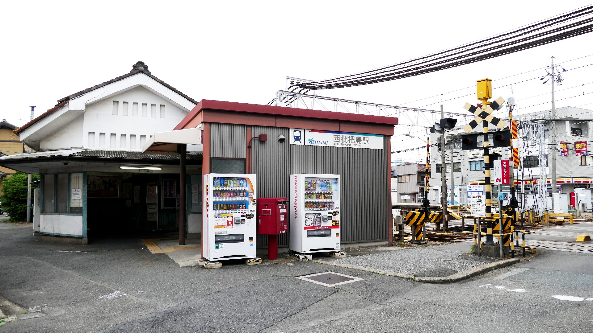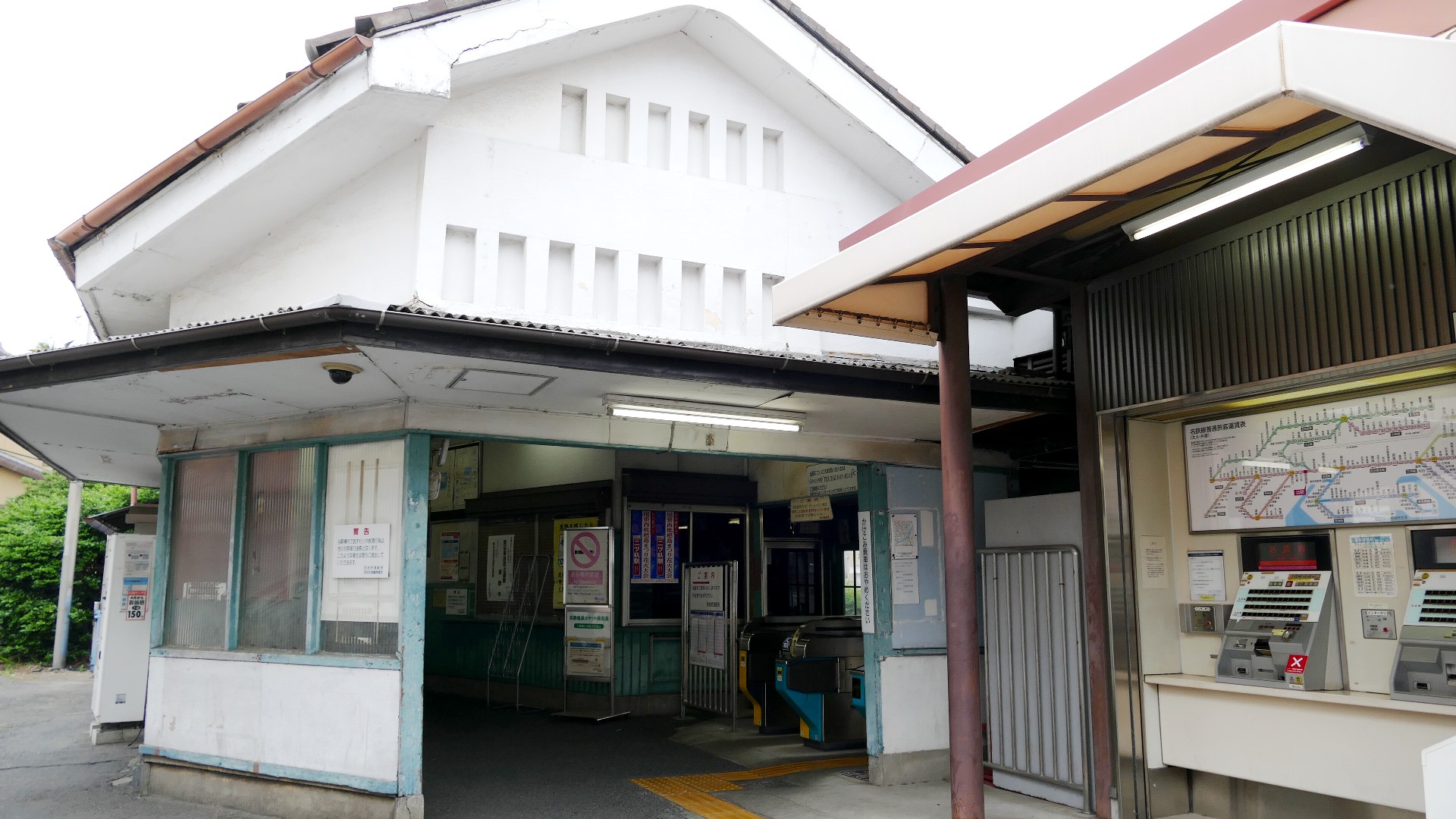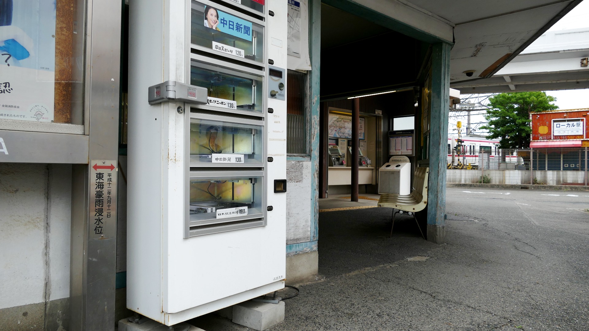 | 西枇杷島駅 2019.6.2 「超幅狭ホーム」だったので、電車が到着する直前まで構内踏切によってホームへ入れない駅として有名だった。また新聞自販機の傍らには東海豪雨の水位線がある。 |