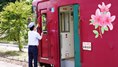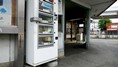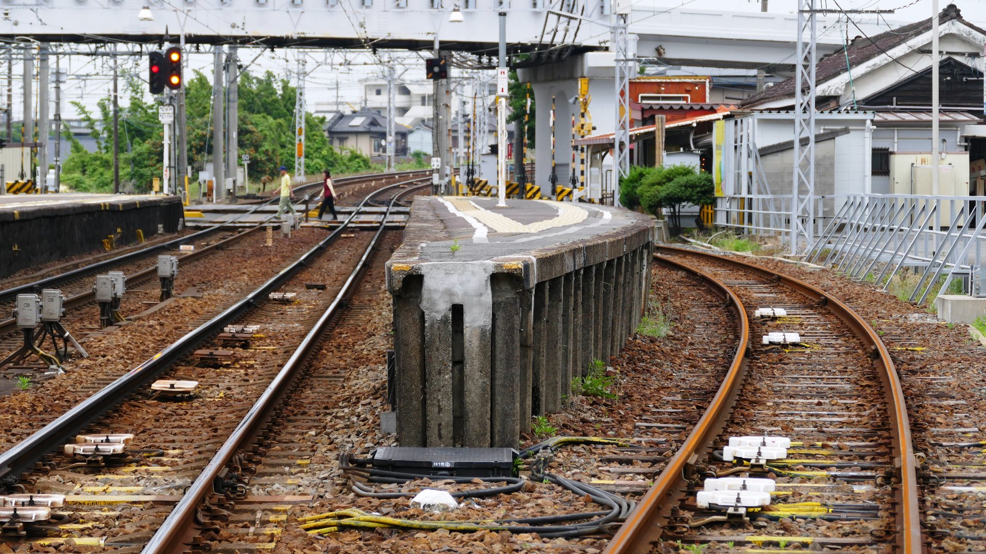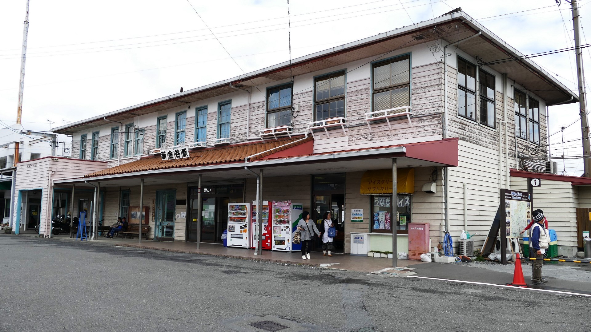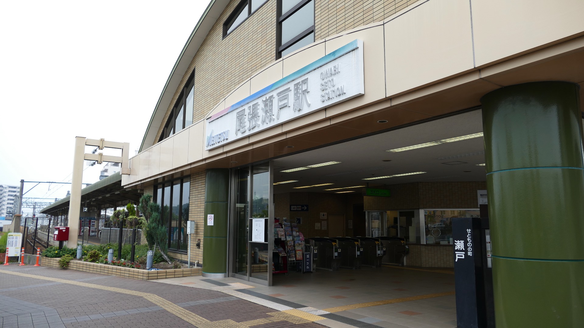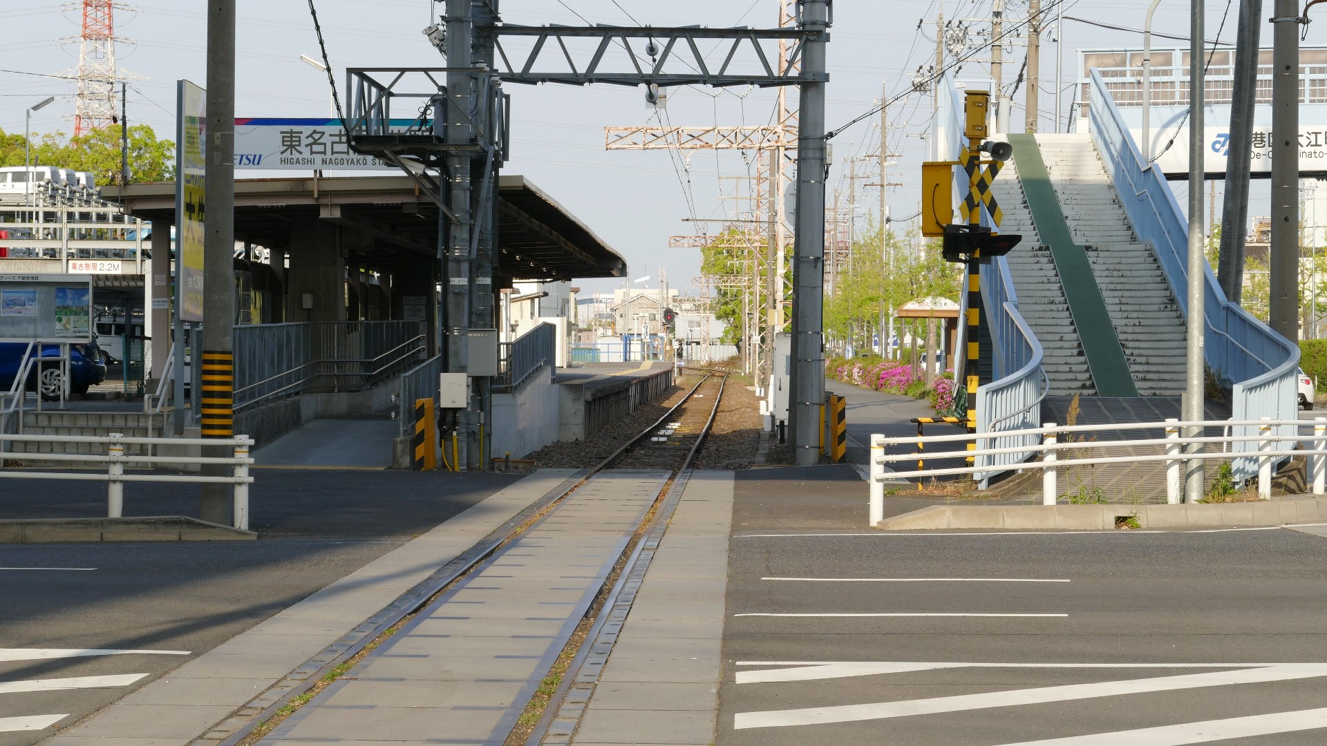 | 西枇杷島駅 2019.6.2 「超幅狭ホーム」だったので、電車が到着する直前まで構内踏切によってホームへ入れない駅として有名だった。また新聞自販機の傍らには東海豪雨の水位線がある。 |