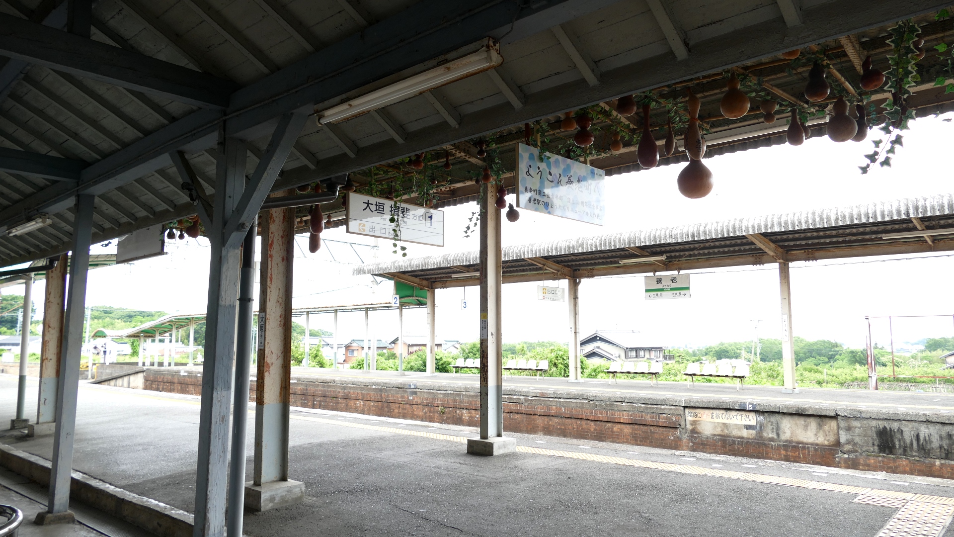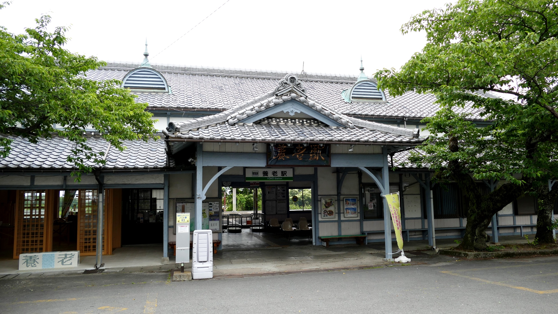 | 養老駅 駅舎は大正時代に建築されたモダンな洋風建築。入母屋の鬼瓦には養老の「Y」が刻まれている。またホームには養老の滝で有名な瓢箪が下げられている。 2022.6 | 揖斐駅 養老線の終着駅。以前は貨物輸送のため複数の線路があった、広大な構内はその名残。 2021.10 | ||||||