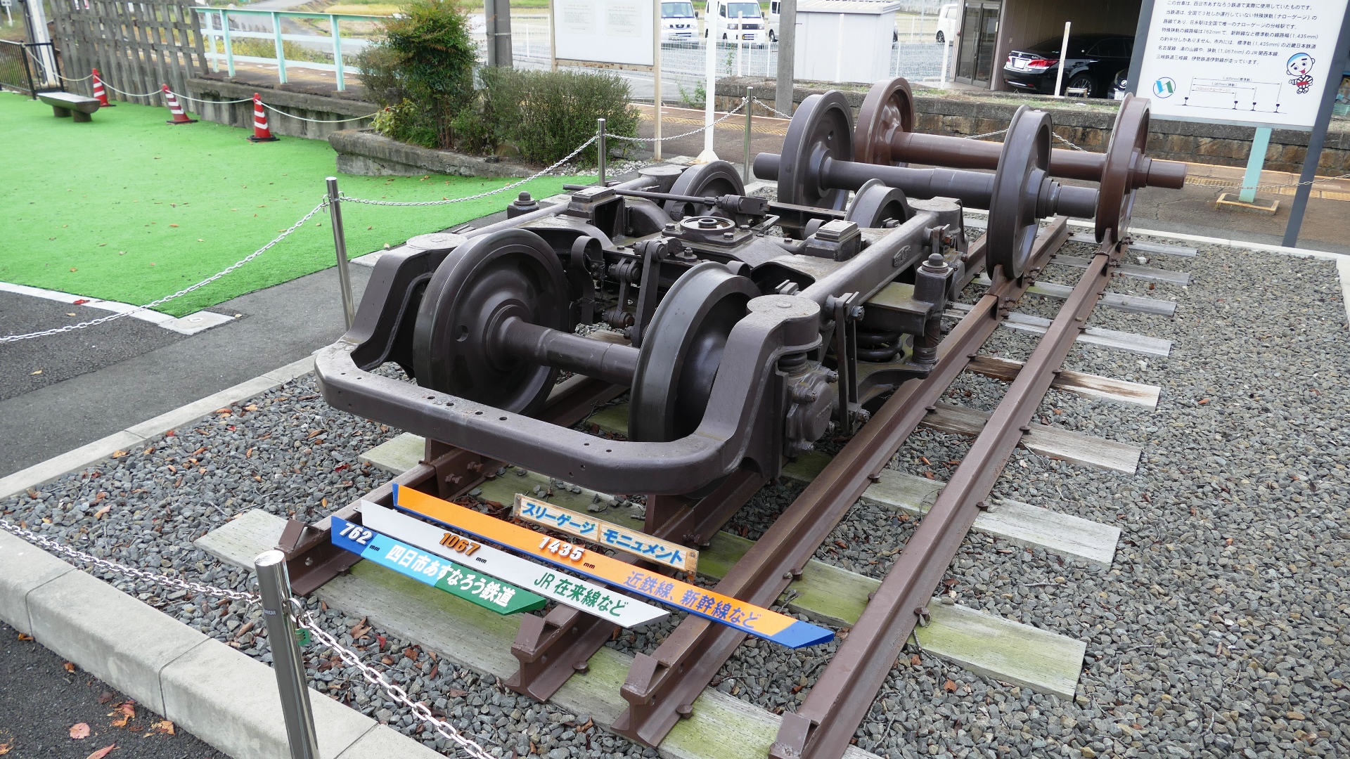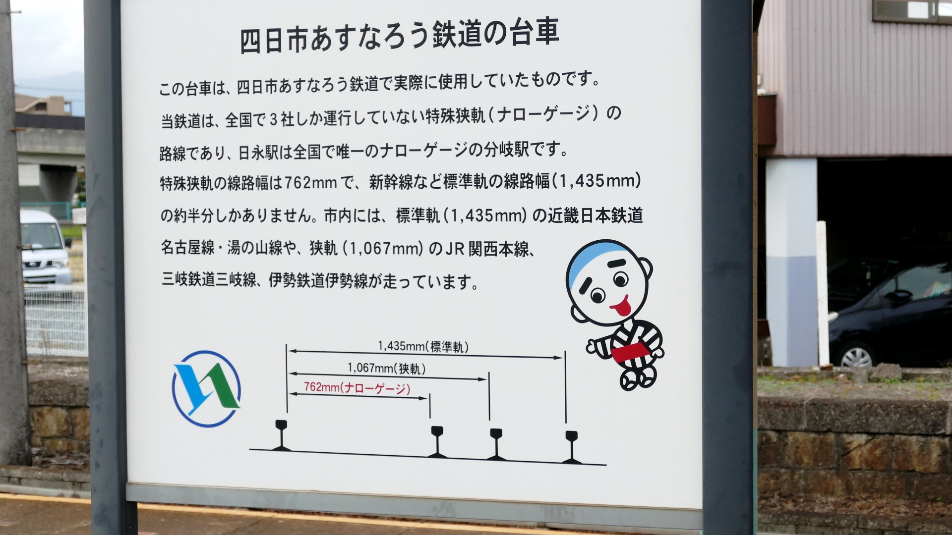 日永(ひなが)駅 八王子線・内部線の分岐駅 三角ホームが広い、その中に台車モニュメントが目を引く説明板 |