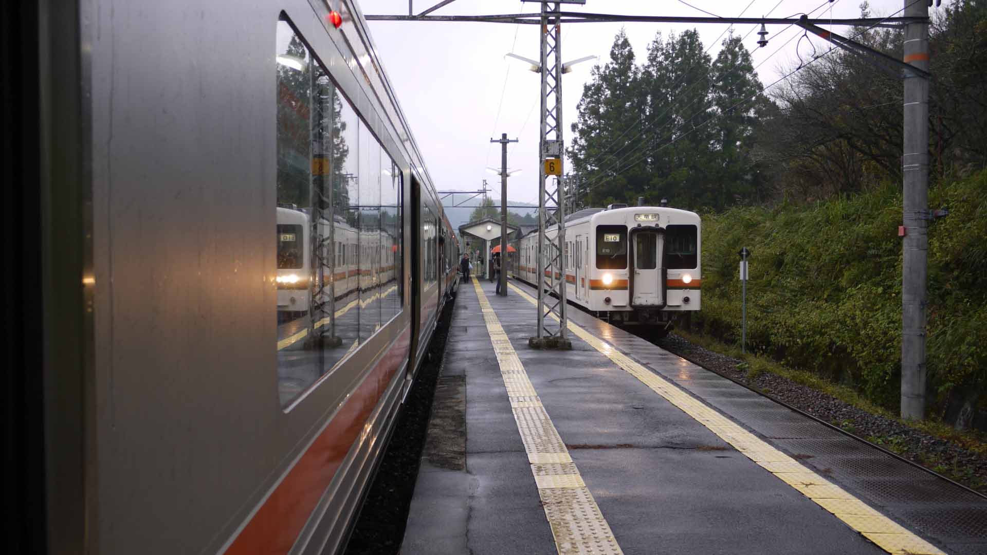 三河大野(?)ですれ違い 帰路途中、雨が降ってきた。 |