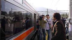 フィナーレ5号(キハ75)に乗車。 9:59中部天竜到着。 テレビカメラが来ていた。 |