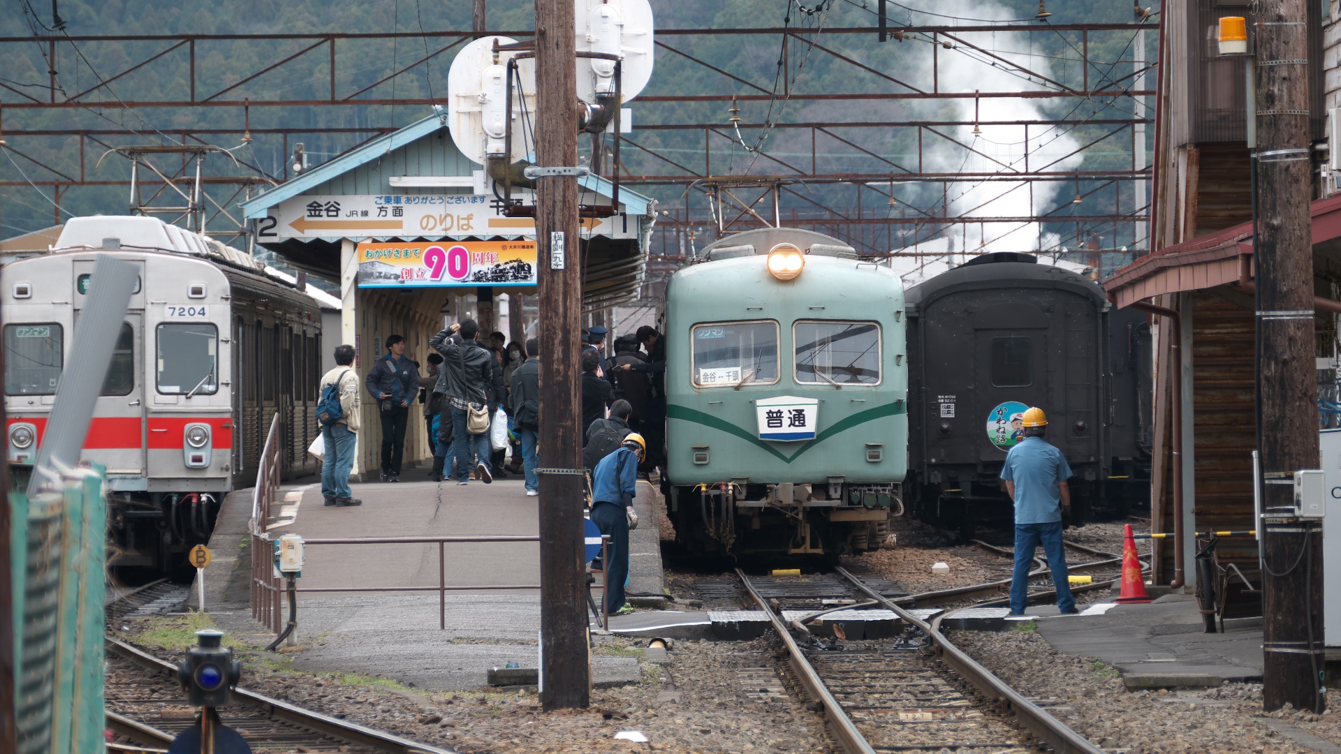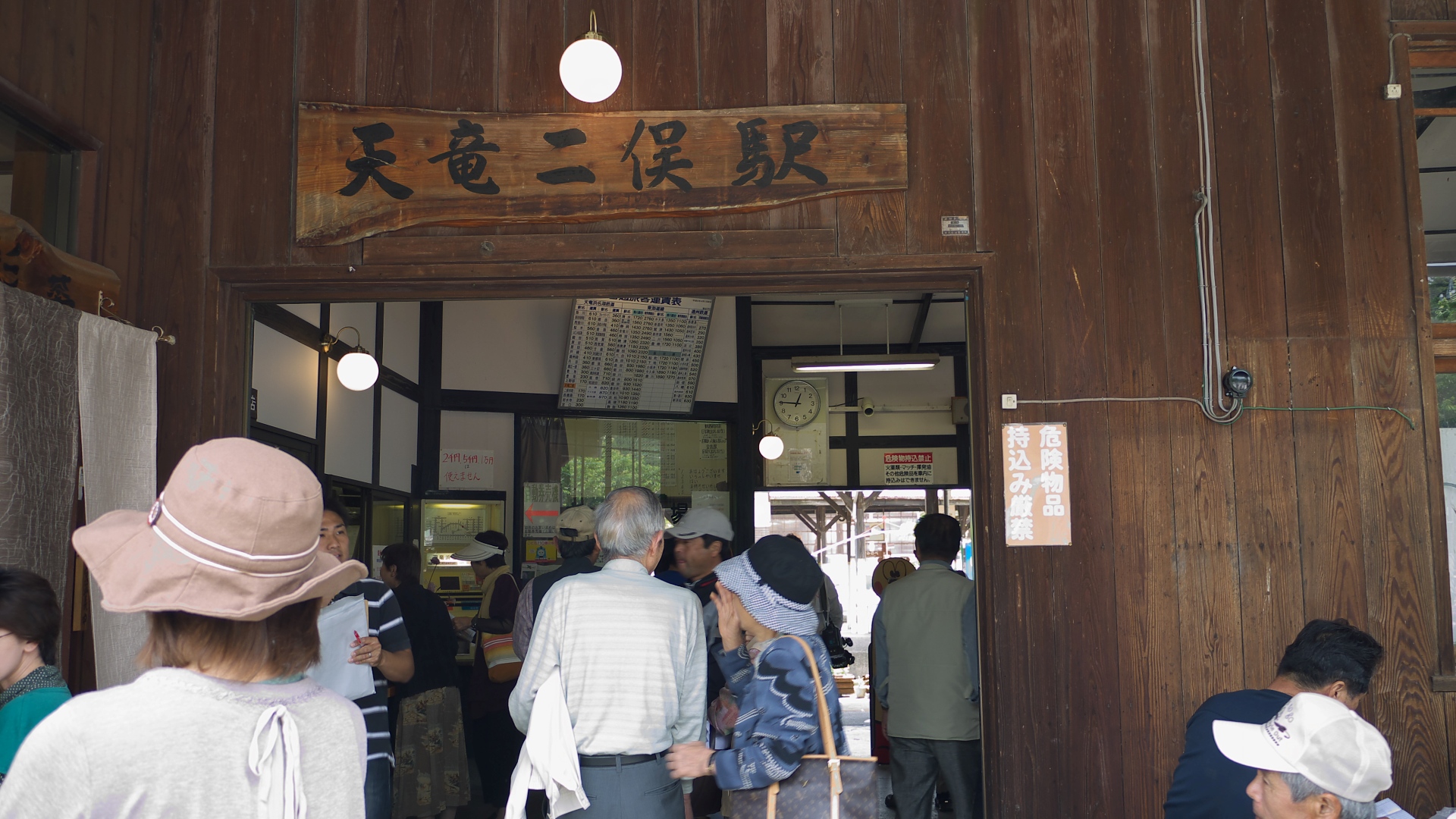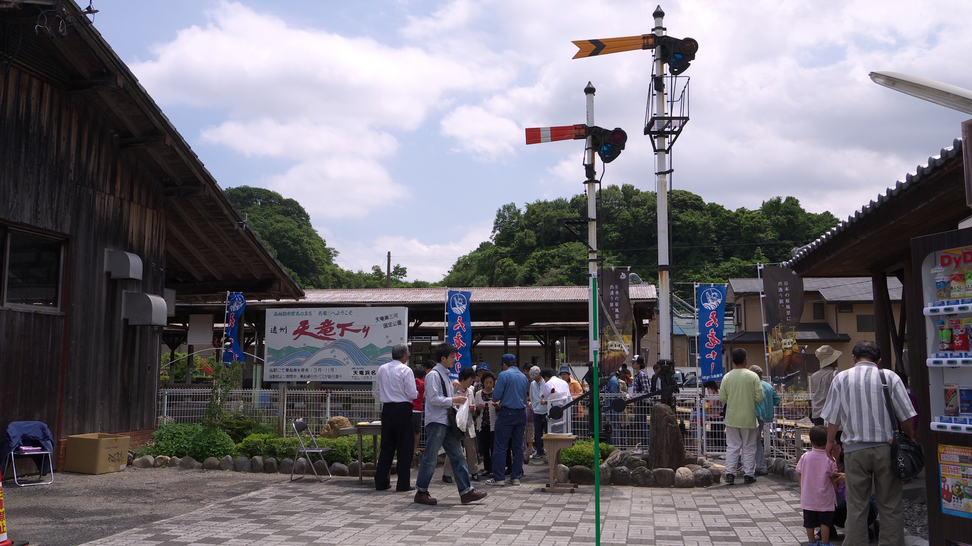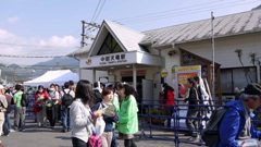 | 天竜二俣駅では大勢の人が下車。 | 天竜二俣駅臨時改札口。 腕木式信号機も展示してある。 |