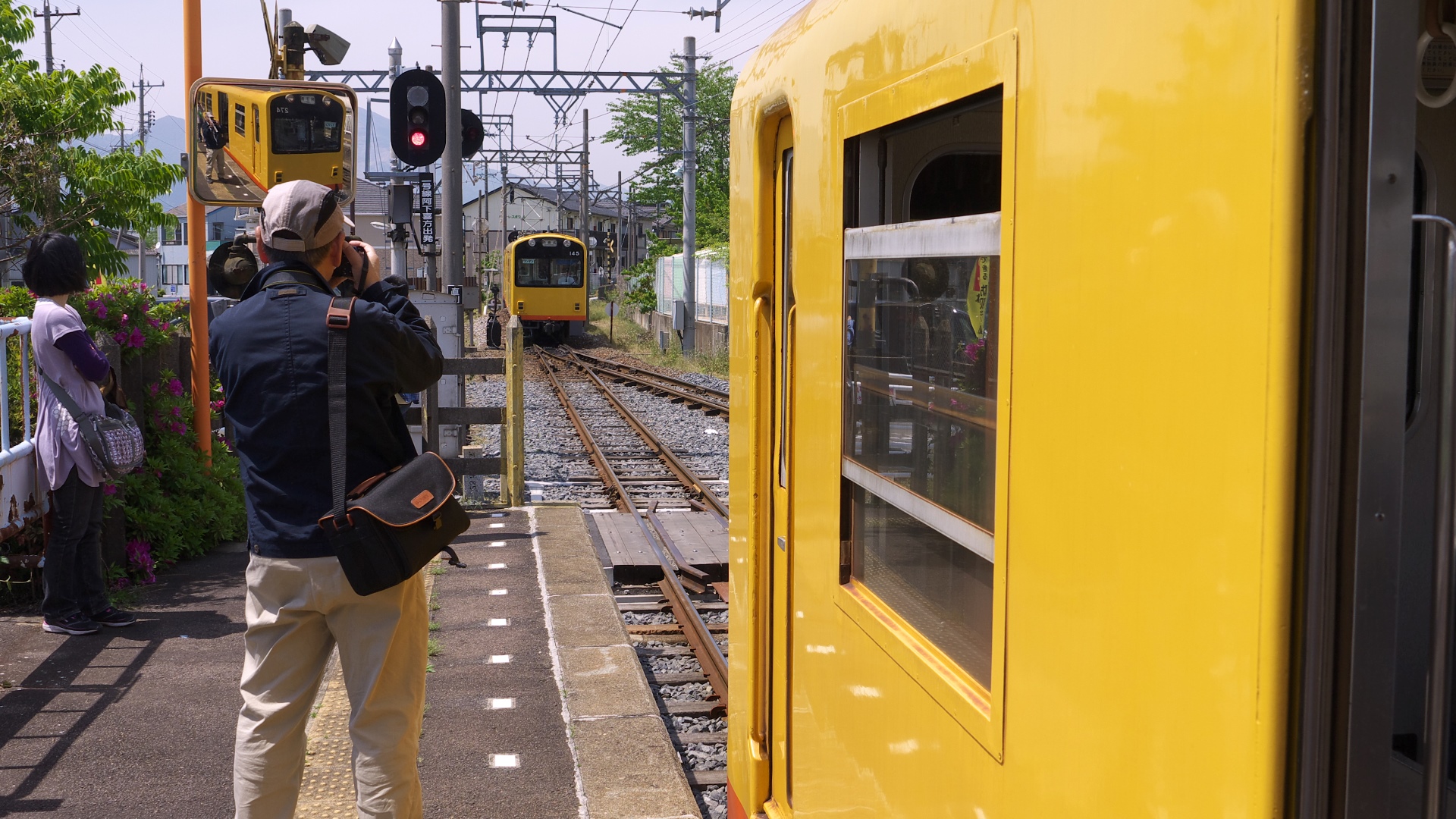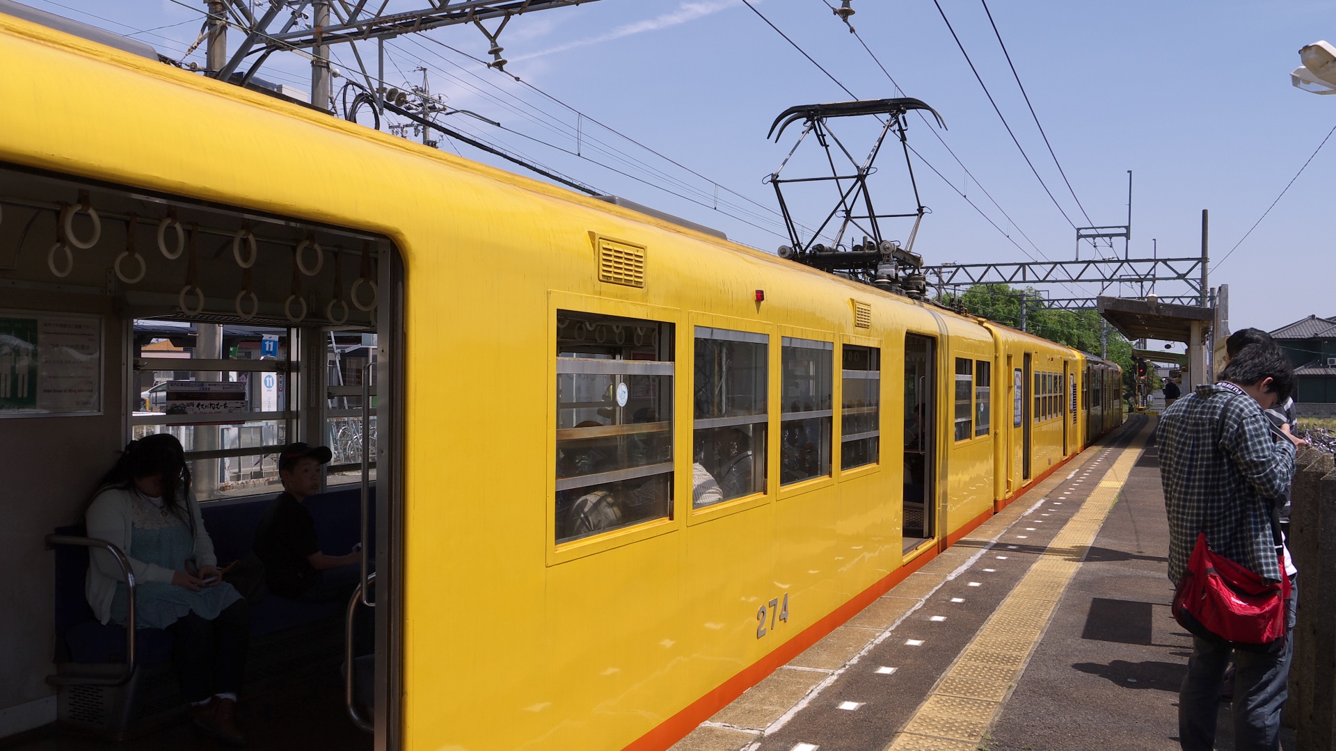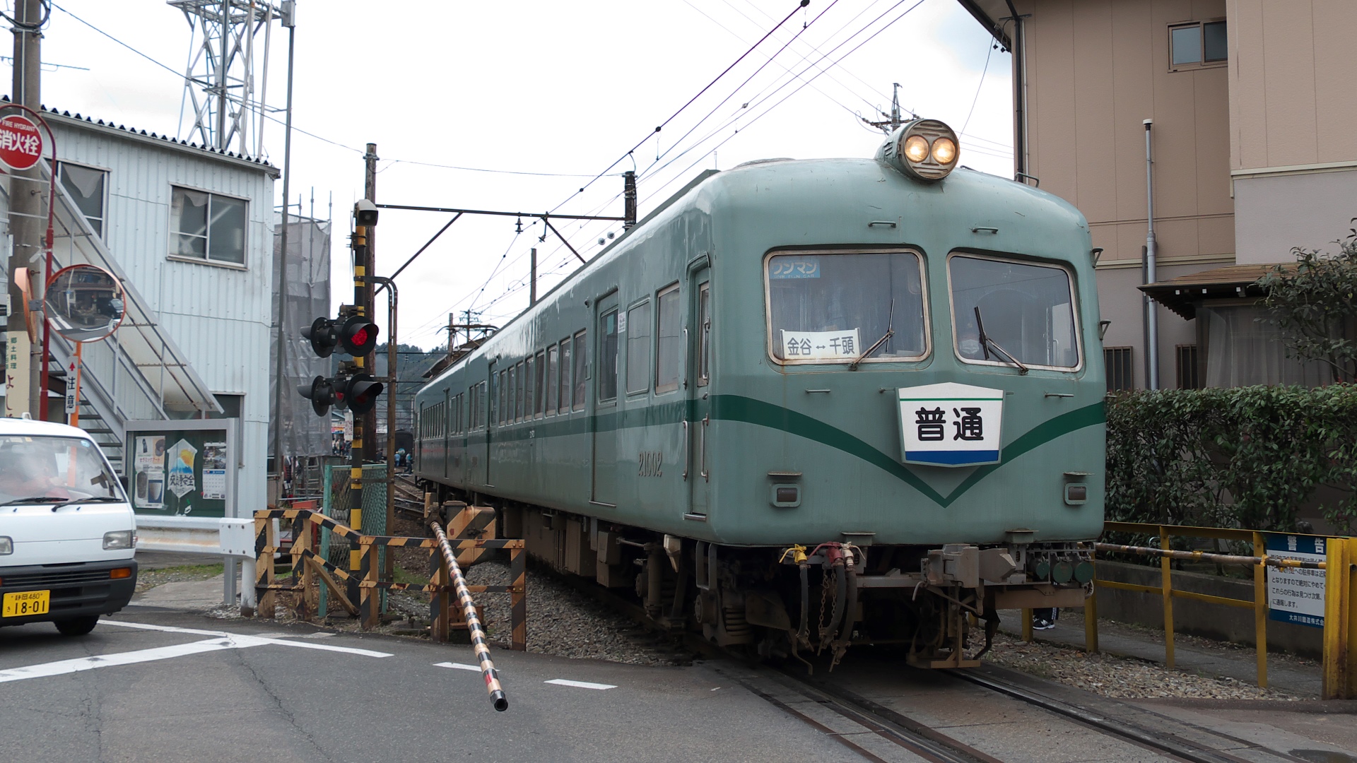 西院駅より。踏切信号。 | 併用軌道の山ノ内駅。 | 太秦広隆寺駅付近。 映画村の最寄り駅。 |