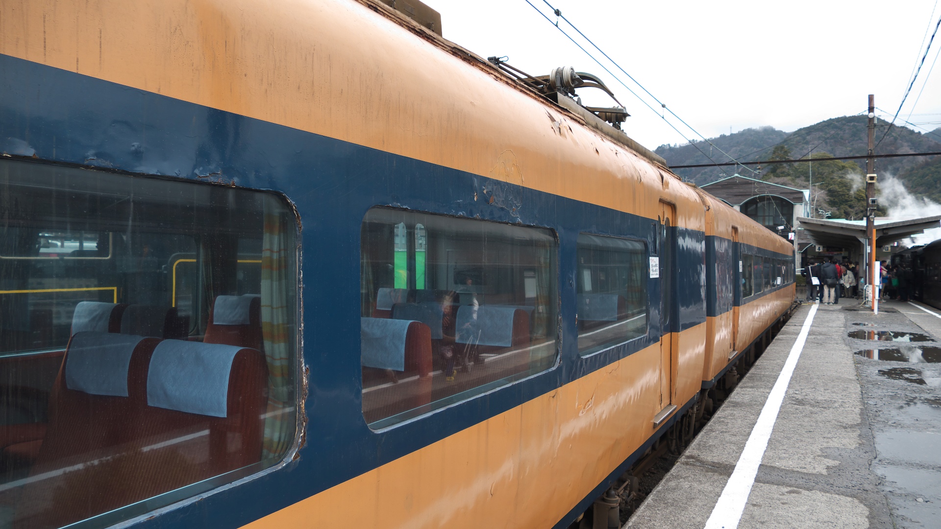 | 当日購入なのに指定席券は前日日付 | トロッコ嵯峨野駅に入線。 折り返し「嵯峨野7号」として乗車。 |