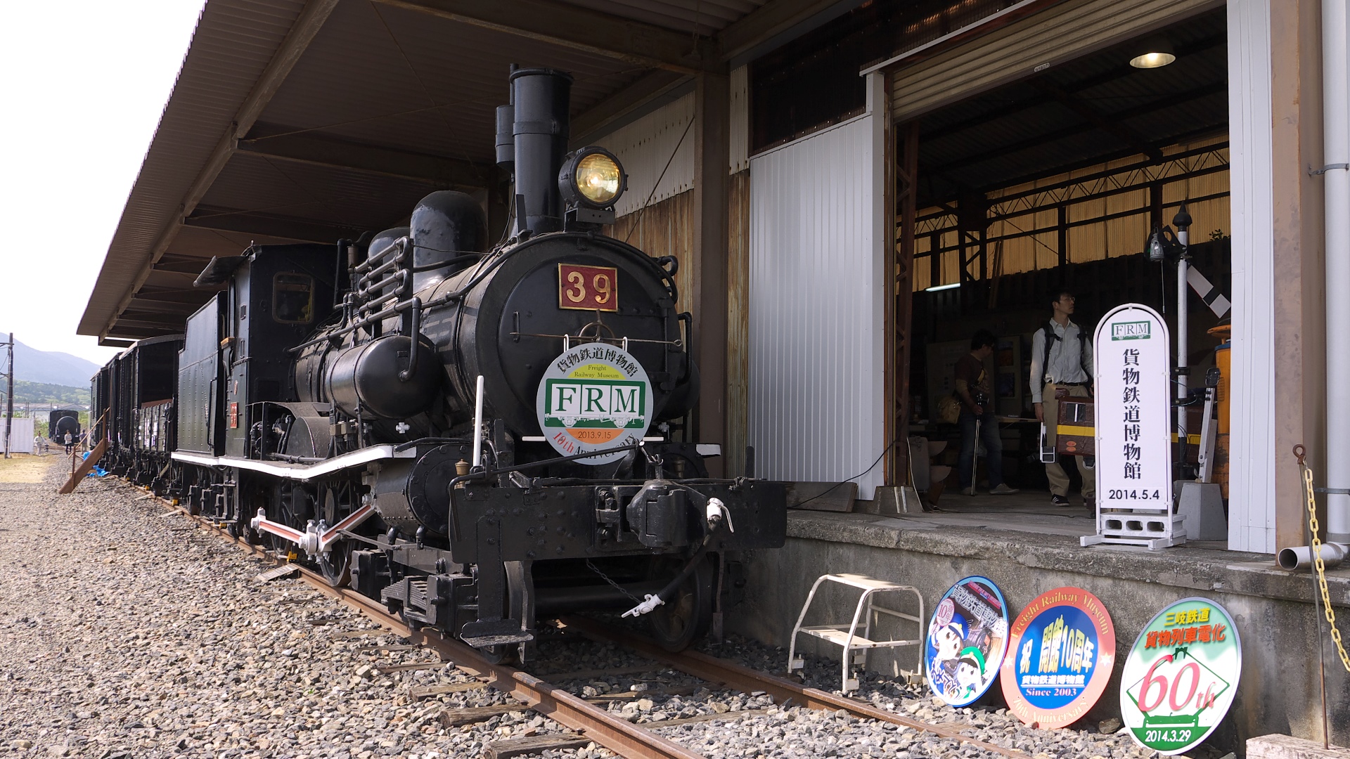 阿下喜駅にある「軽便鉄道博物館」屋外展示の「モニ226形」と三重交通カラーに復元された200系 | 転車台は実際に使われていたものを移設されたらしい。 | 博物館で配られていたステッカー 北勢線は地元ボランティアがスゴイ。 |