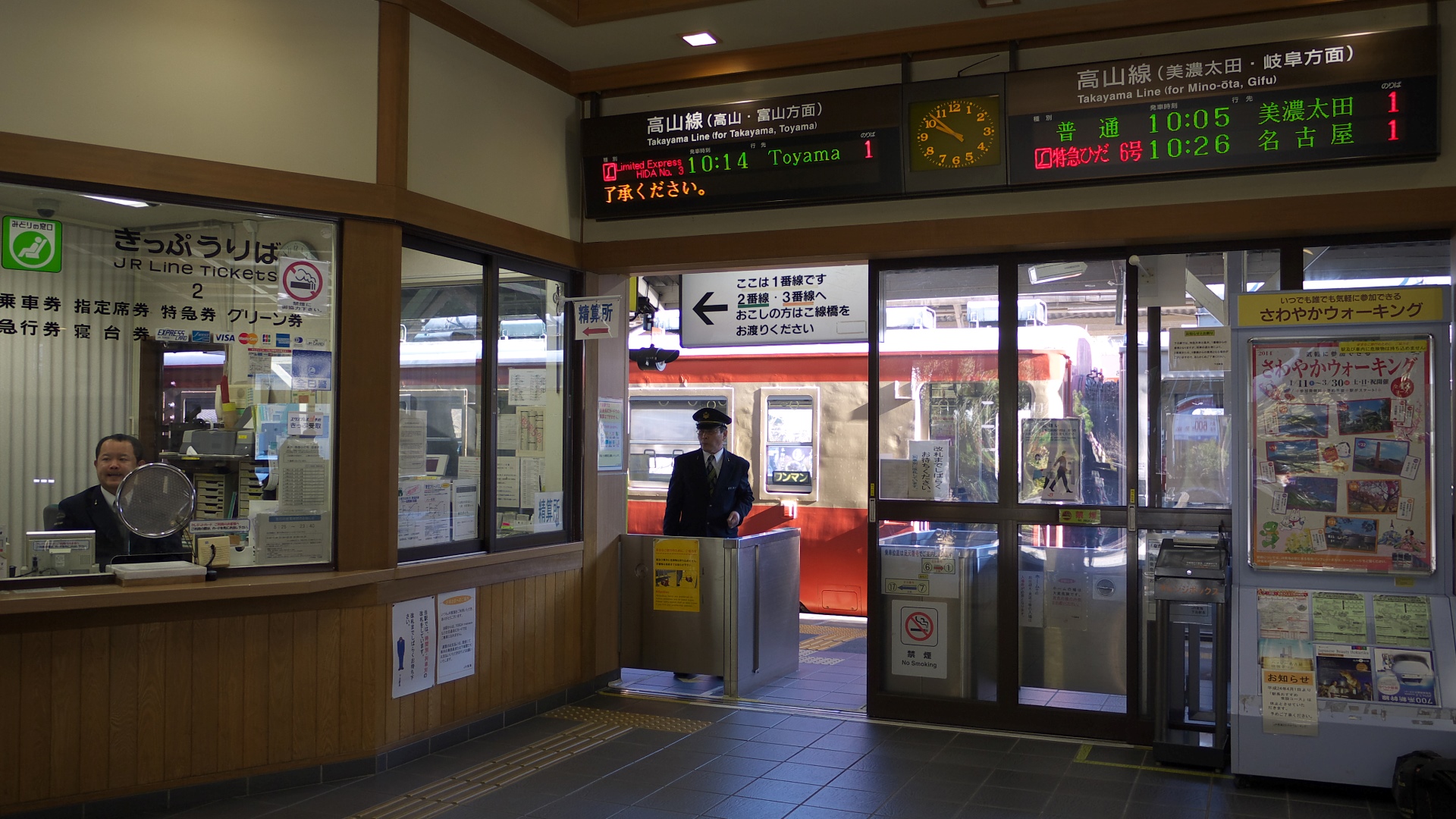 | 高山駅で乗車券と特急券を買う。 | 高山始発ワイドビューひだ10号は 行きと違って激混み |