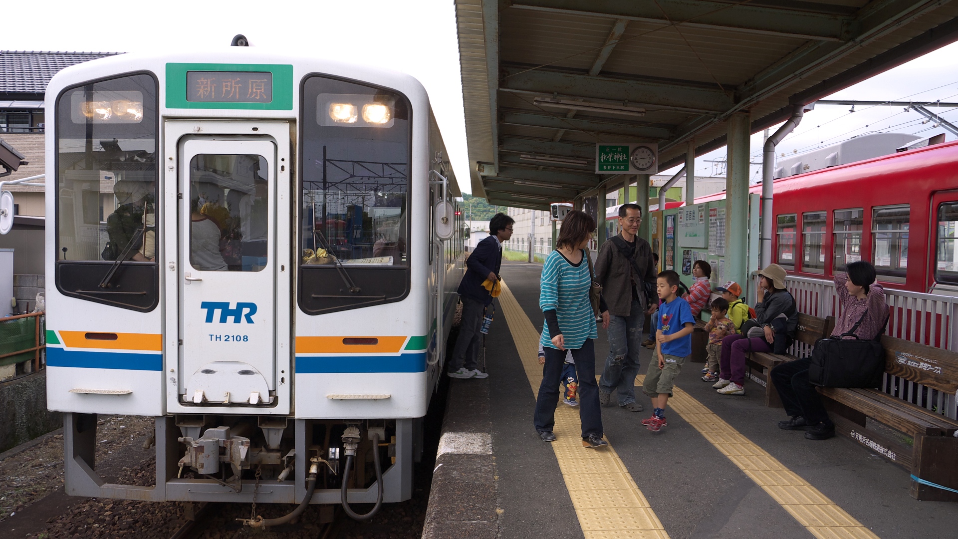 金指駅で交換待ち合わせ | 森の中を快走するTH2100形式 | TH2100形式の車内 | ||||