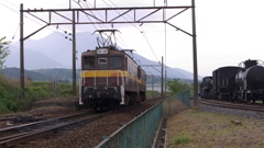 39号蒸気機関車 | 丹生川駅にて、ED45重連貨物と101系との交換 | 三岐線は狭軌1067mm。101系電車が大きく見える。 | ||||