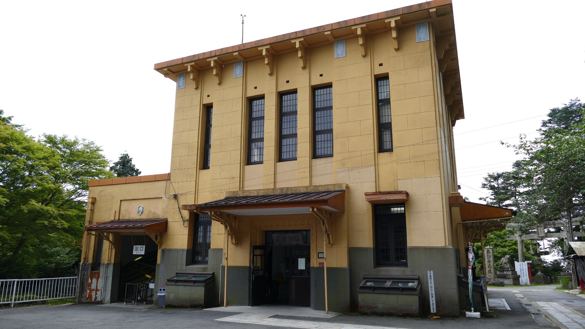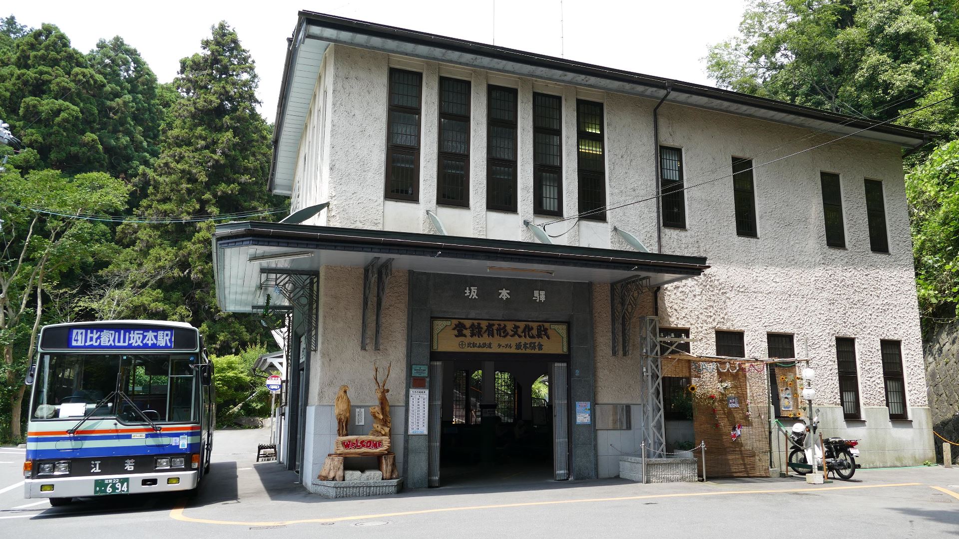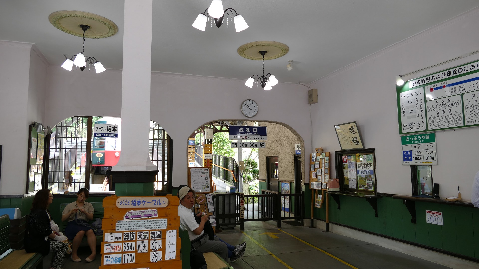 坂本ケーブル(昭和2年開業の日本一長いケーブルカー) 上段:ケーブル坂本駅・モダンな駅舎。パンタあるのに架線ない。 下段:ケーブル延暦寺駅・こちらもモダンな駅舎。 |