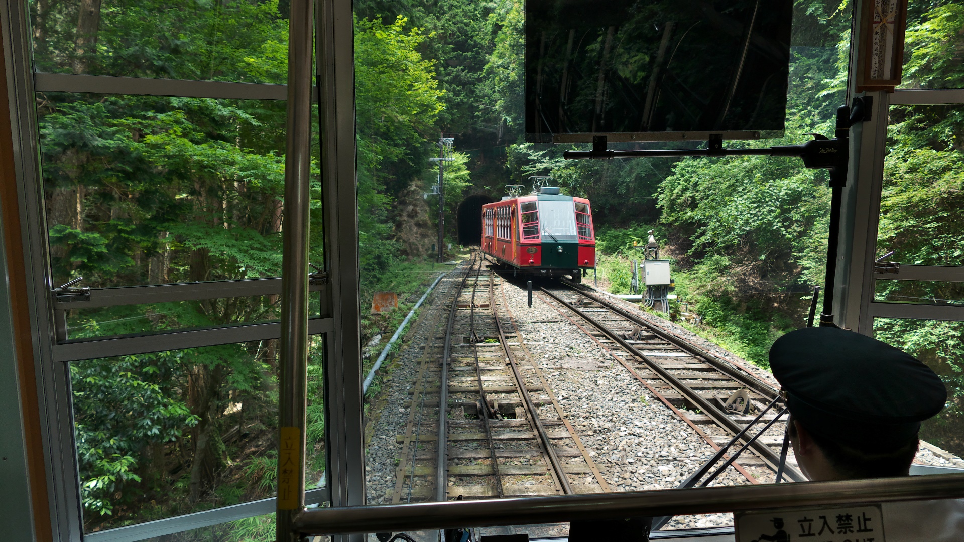 叡山ケーブル。(大正14年開業) 日本一の高低差561m。 こちらも現在は京福電気鉄道が運営。 |