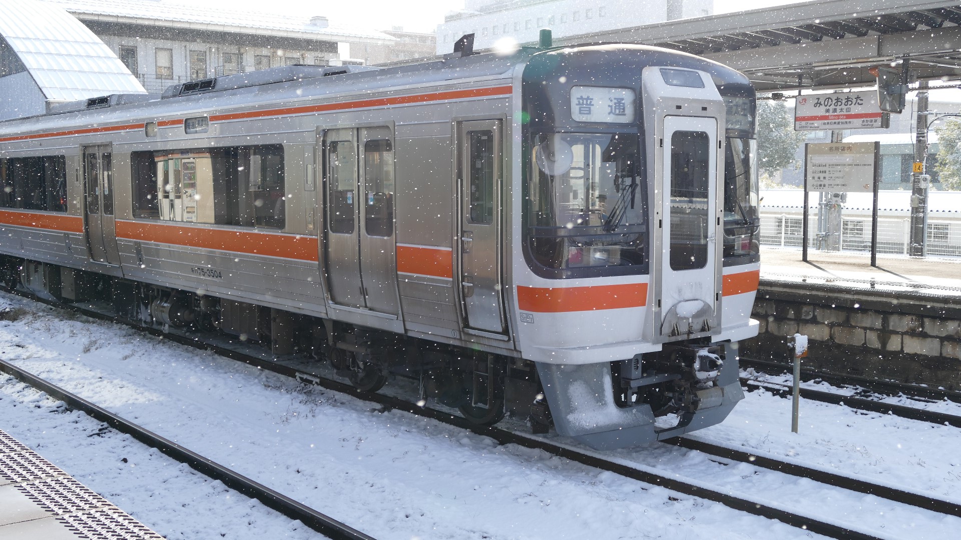 | 尾張一宮→岐阜は普通に乗車、雪のためダイヤ乱れていた。岐阜から「ワイドビューひだ3」最後尾パノラマ普通車自由席で景色を楽しみ、美濃太田には定刻922より約10分遅れで到着 | 出発を待つ「ゆら〜り眺めて清流列車1号」 青空が見える美濃太田駅 |