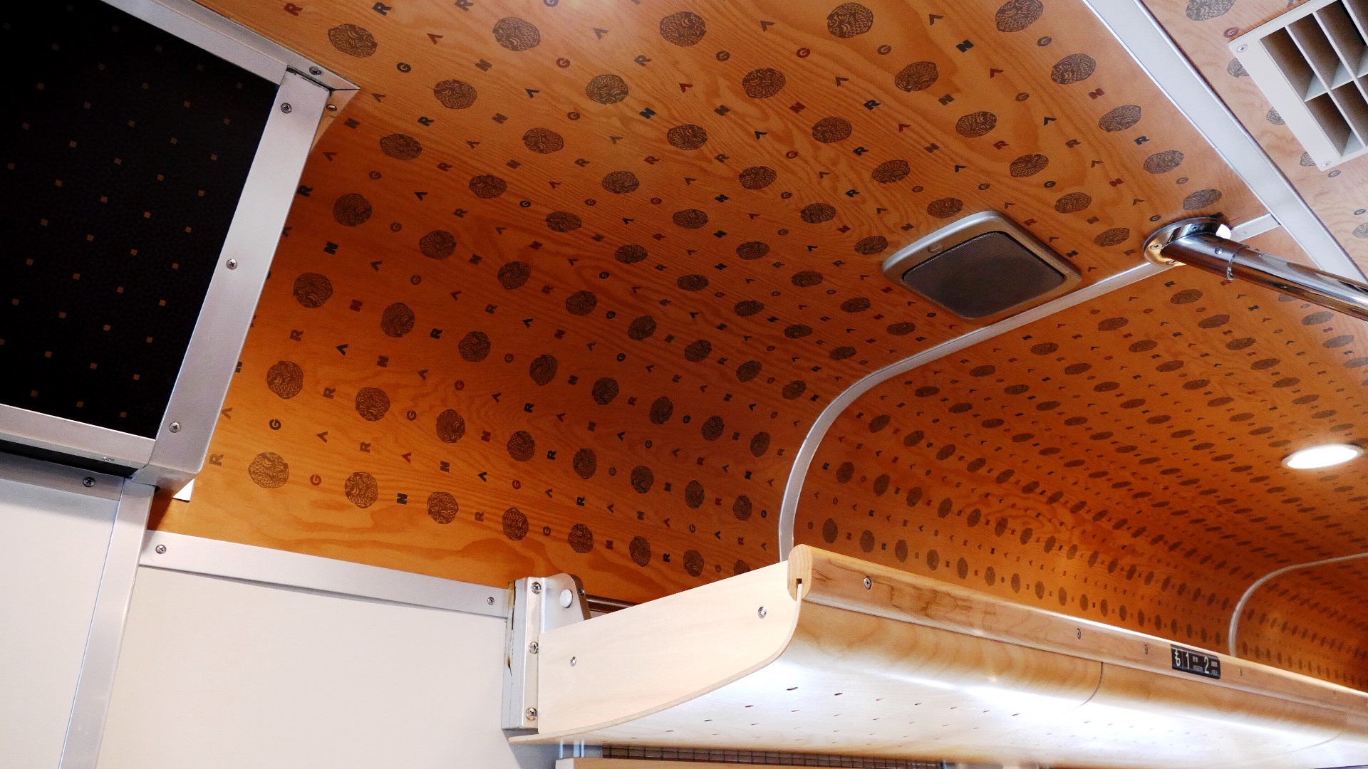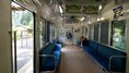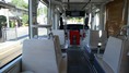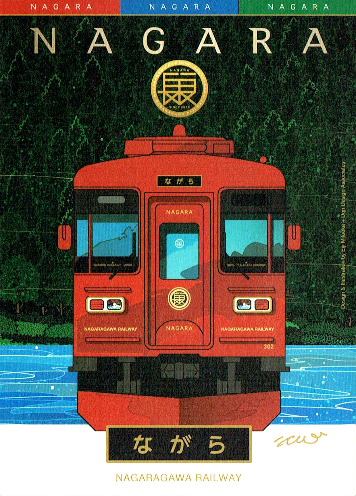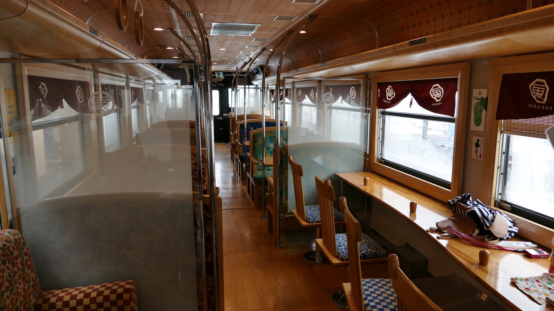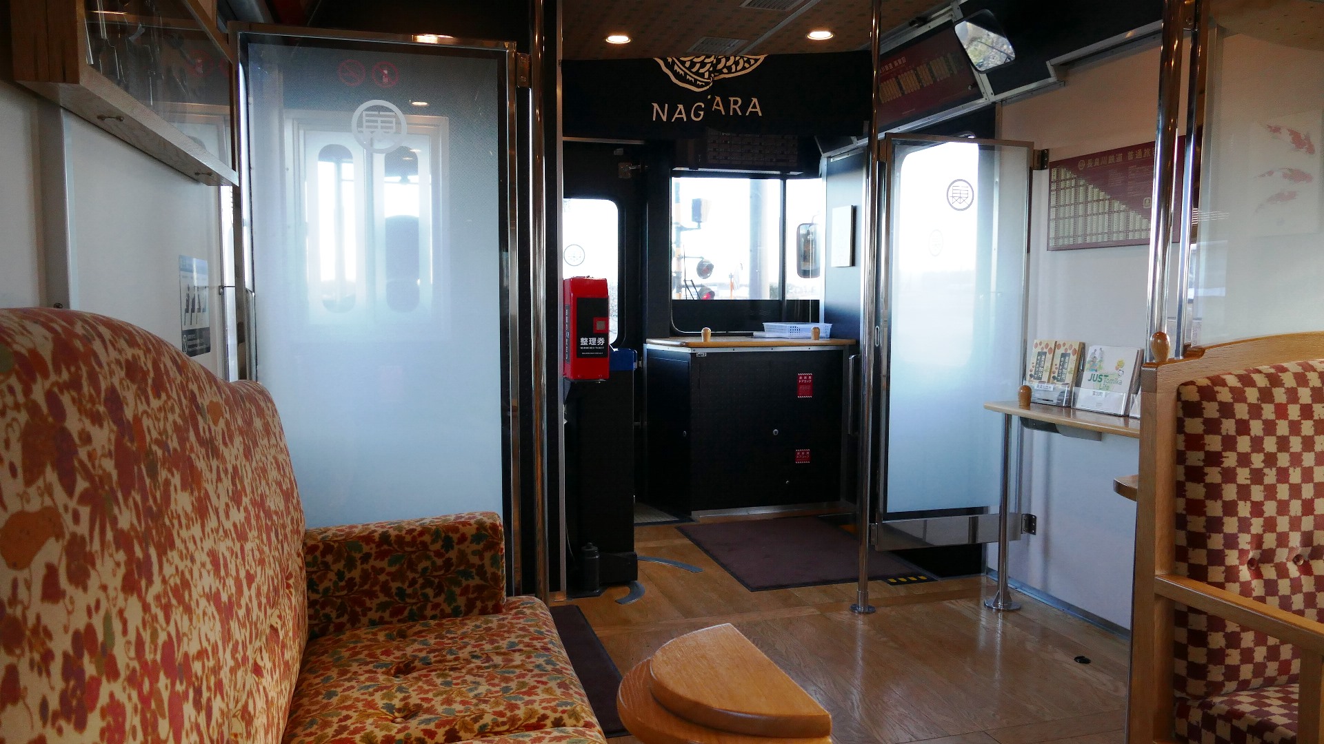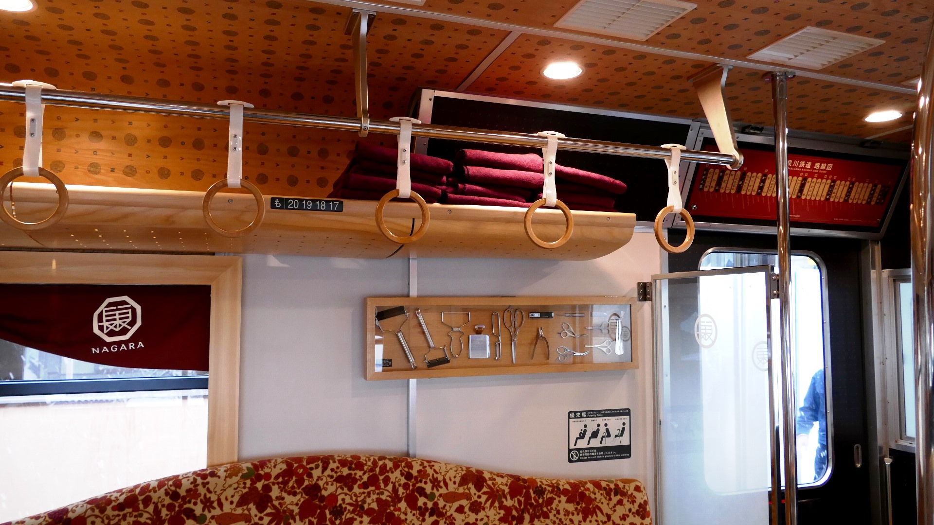 水戸岡さんデザイン。車内照明は電球色LEDダウンライト。 出発を待つ郡上八幡駅にて。 |