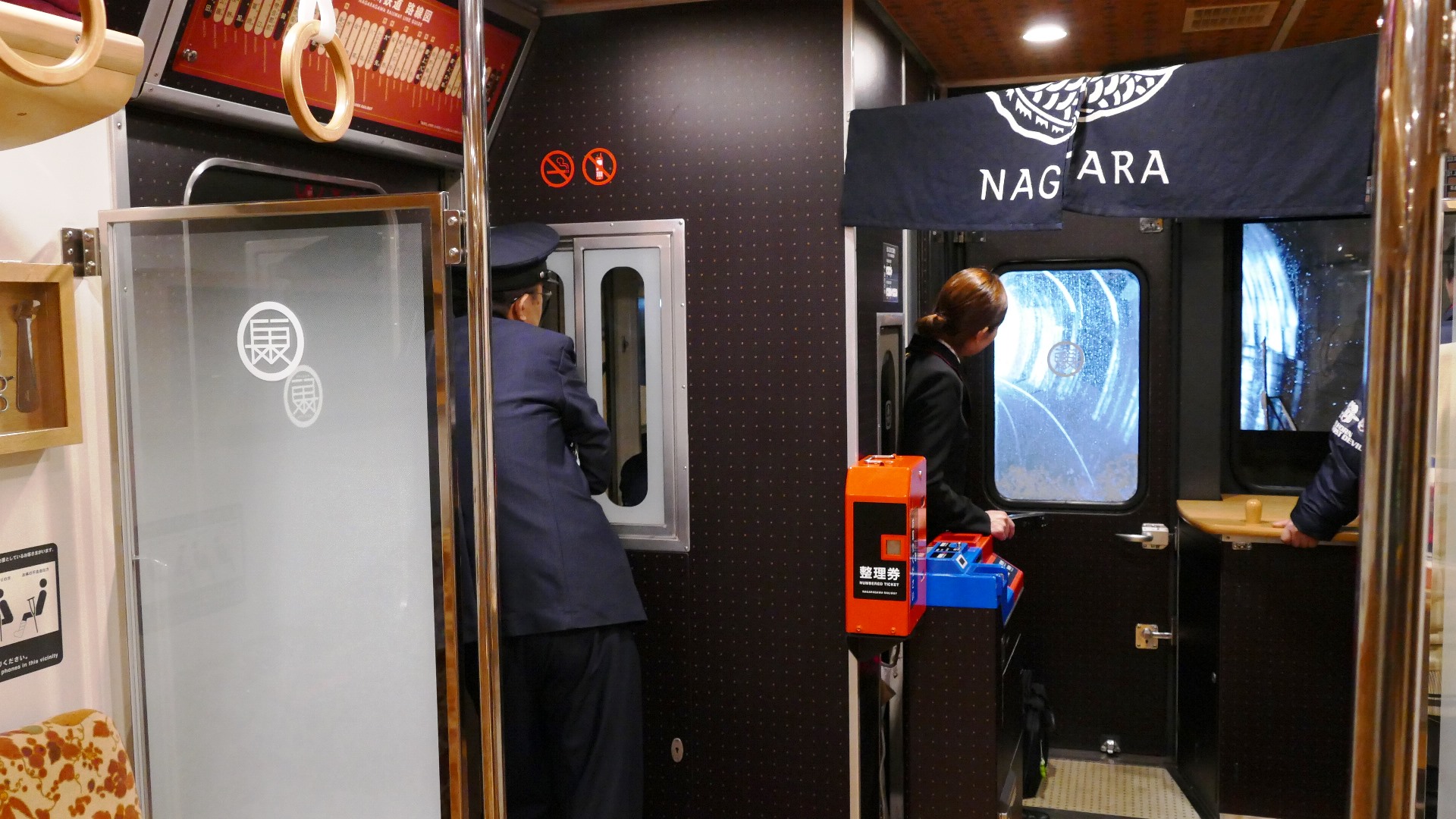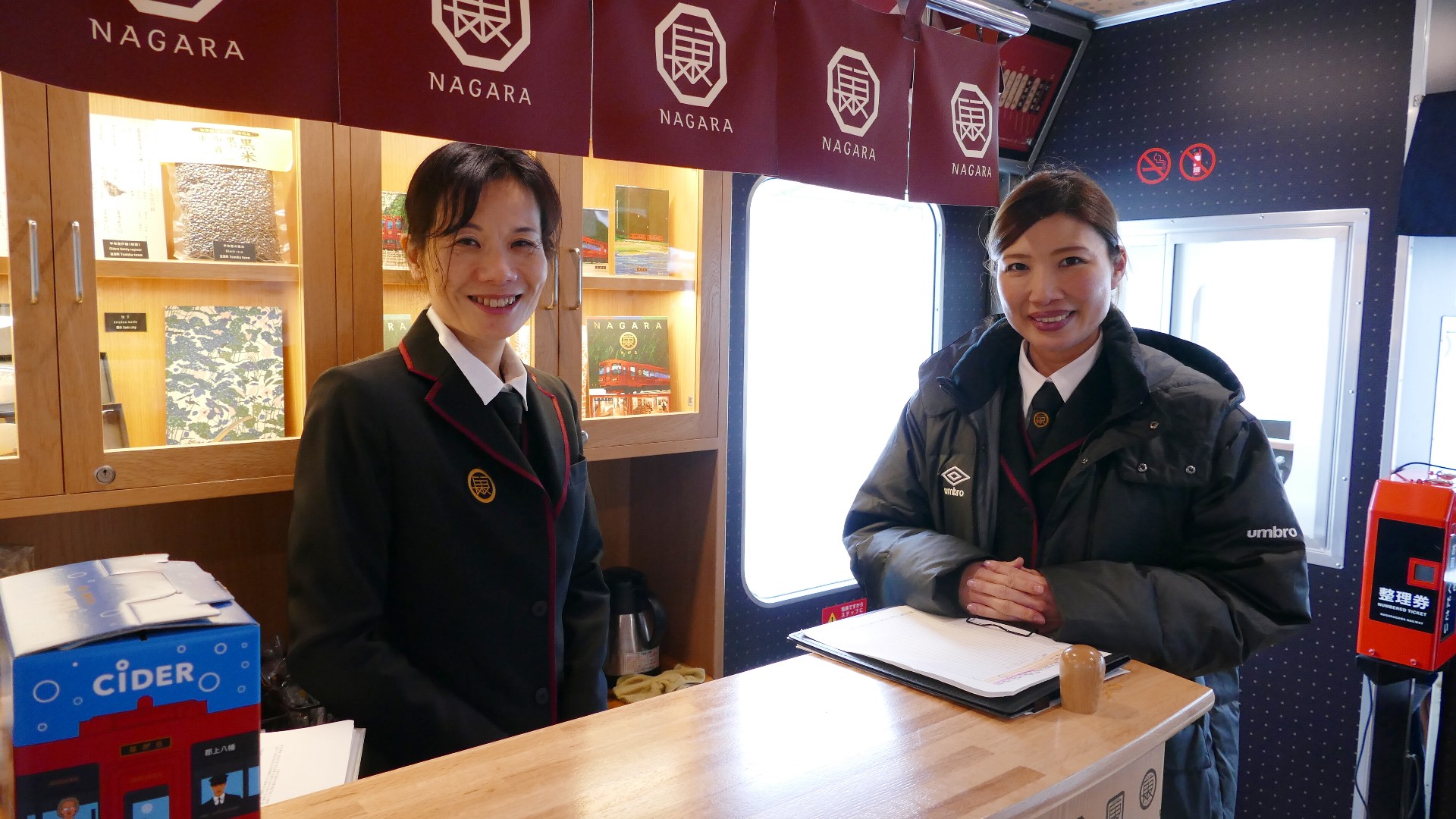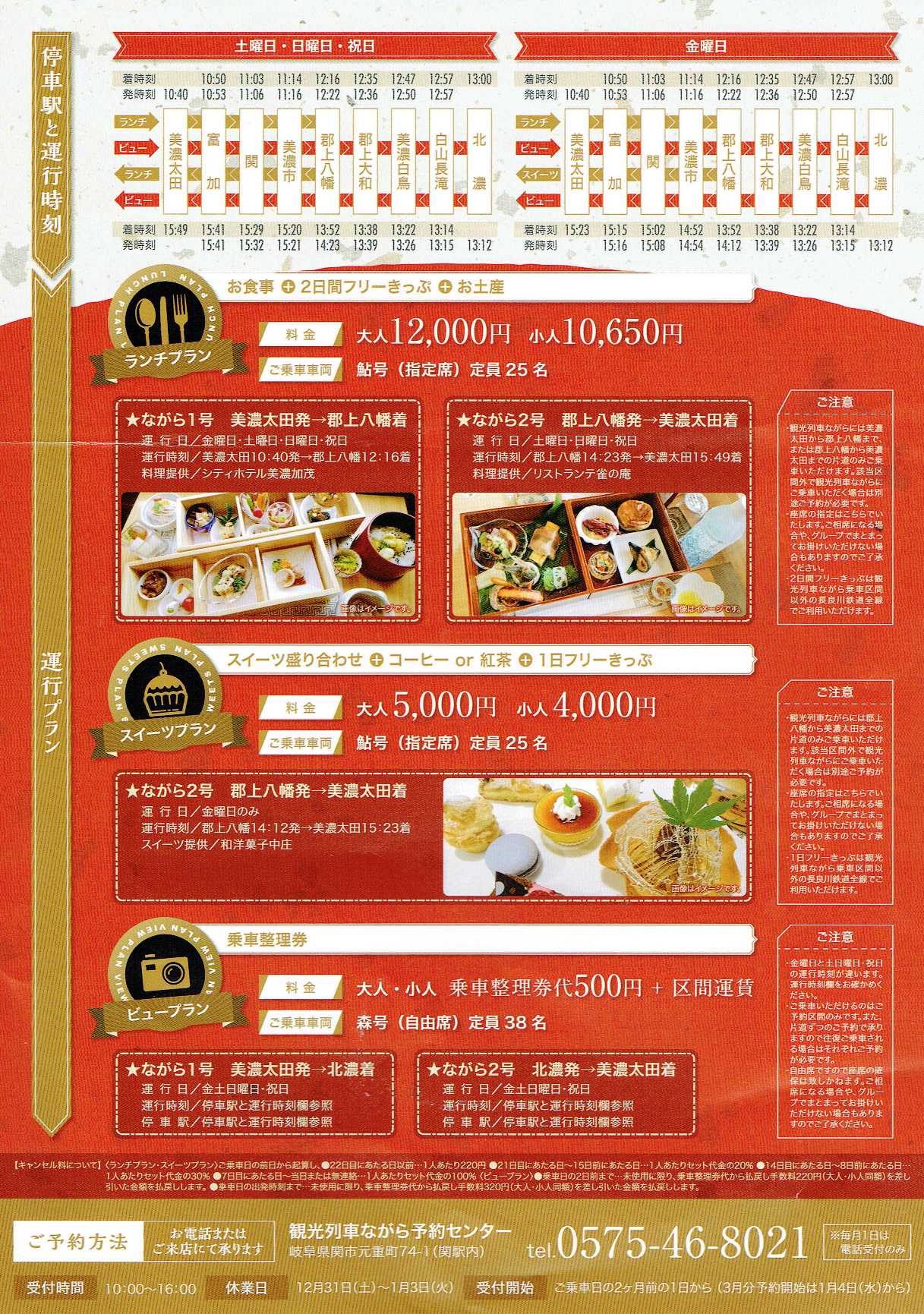 | 乗車整理券・アテンダントさん、連結し食材詰め込み。 | 「ながら2号」は郡上八幡駅を 1352着1423出発 パンフ |