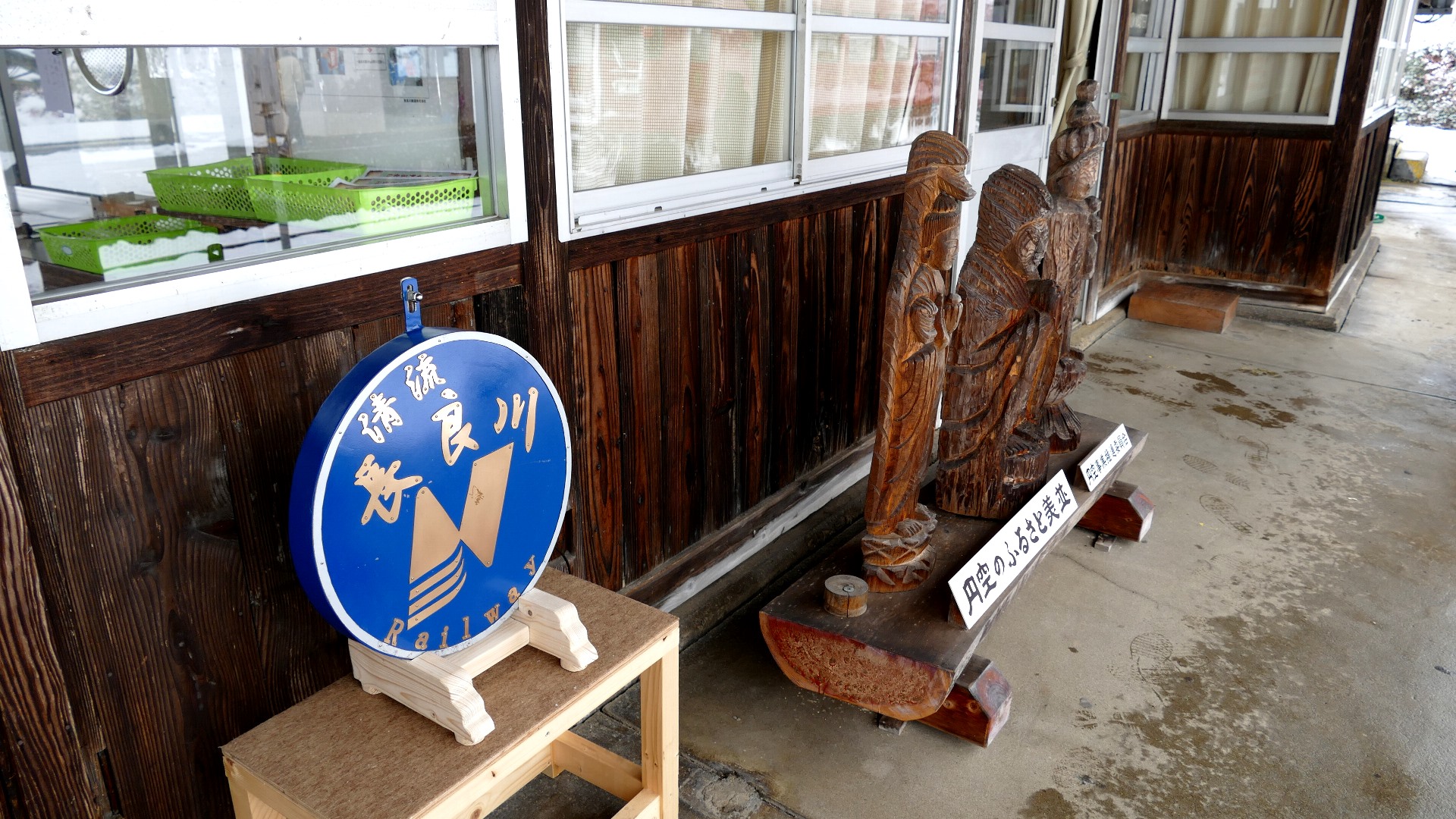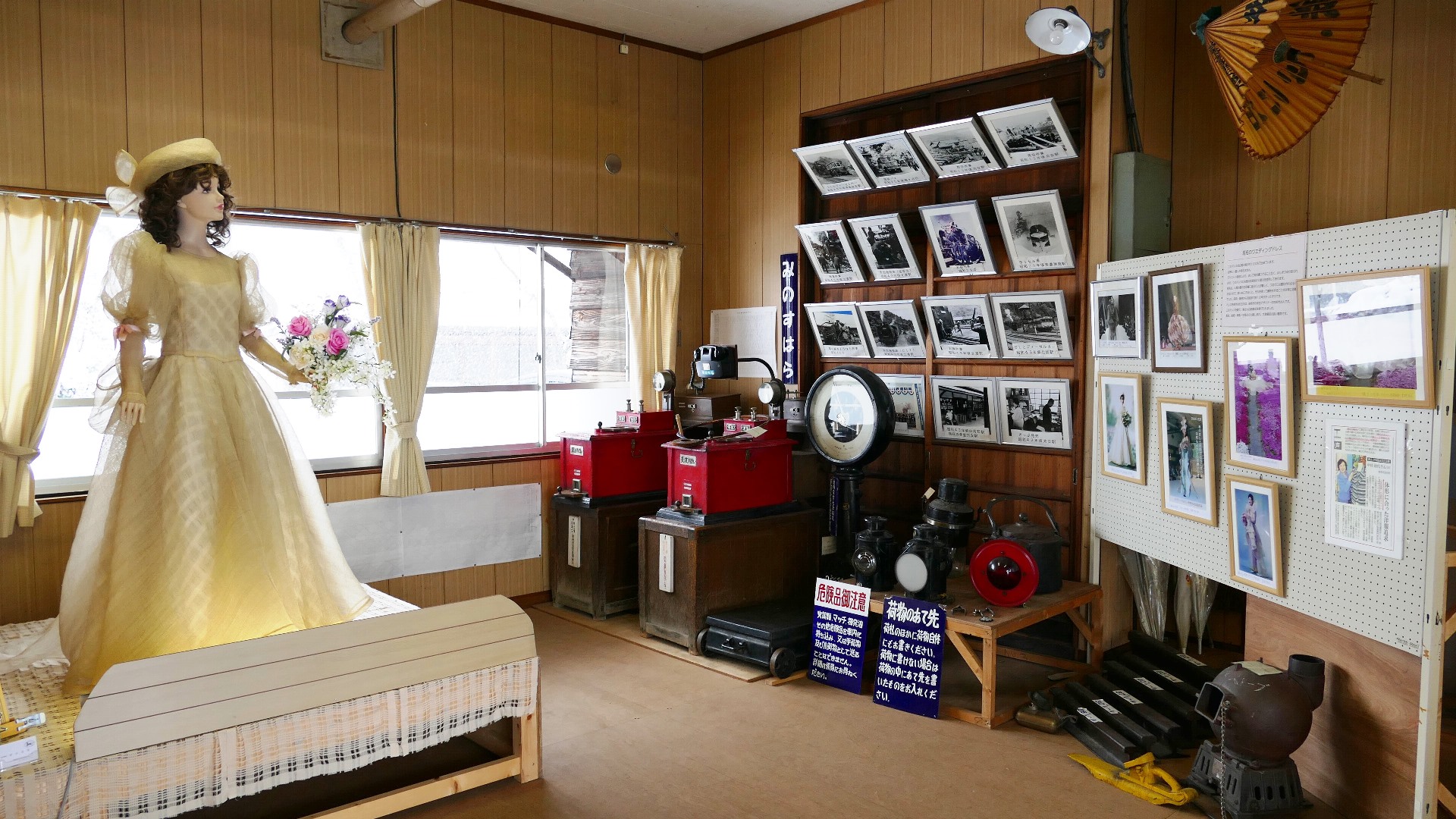 | 大矢駅にて列車交換のためしばし停車。かつて郡上八幡駅にあった遺物や白馬の尻尾で作られたウエディングドレスが展示。 | 絶景車窓を堪能。時折のアテンダントさんのガイドあり。関駅では残雪も少なくなってきた。 美濃太田1549着。 |