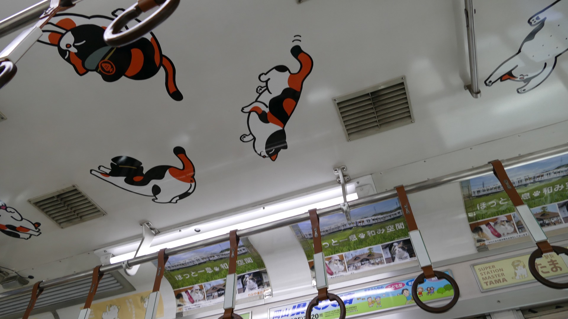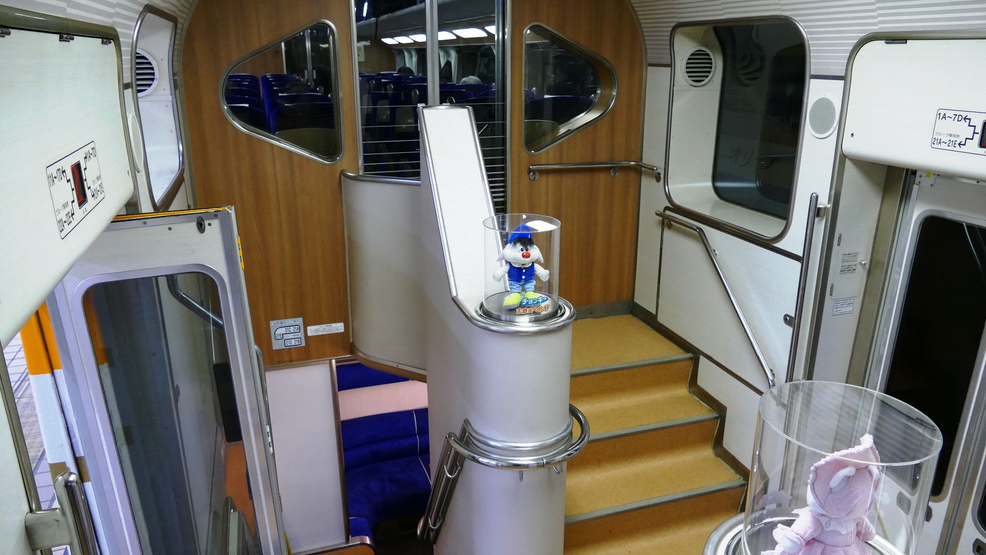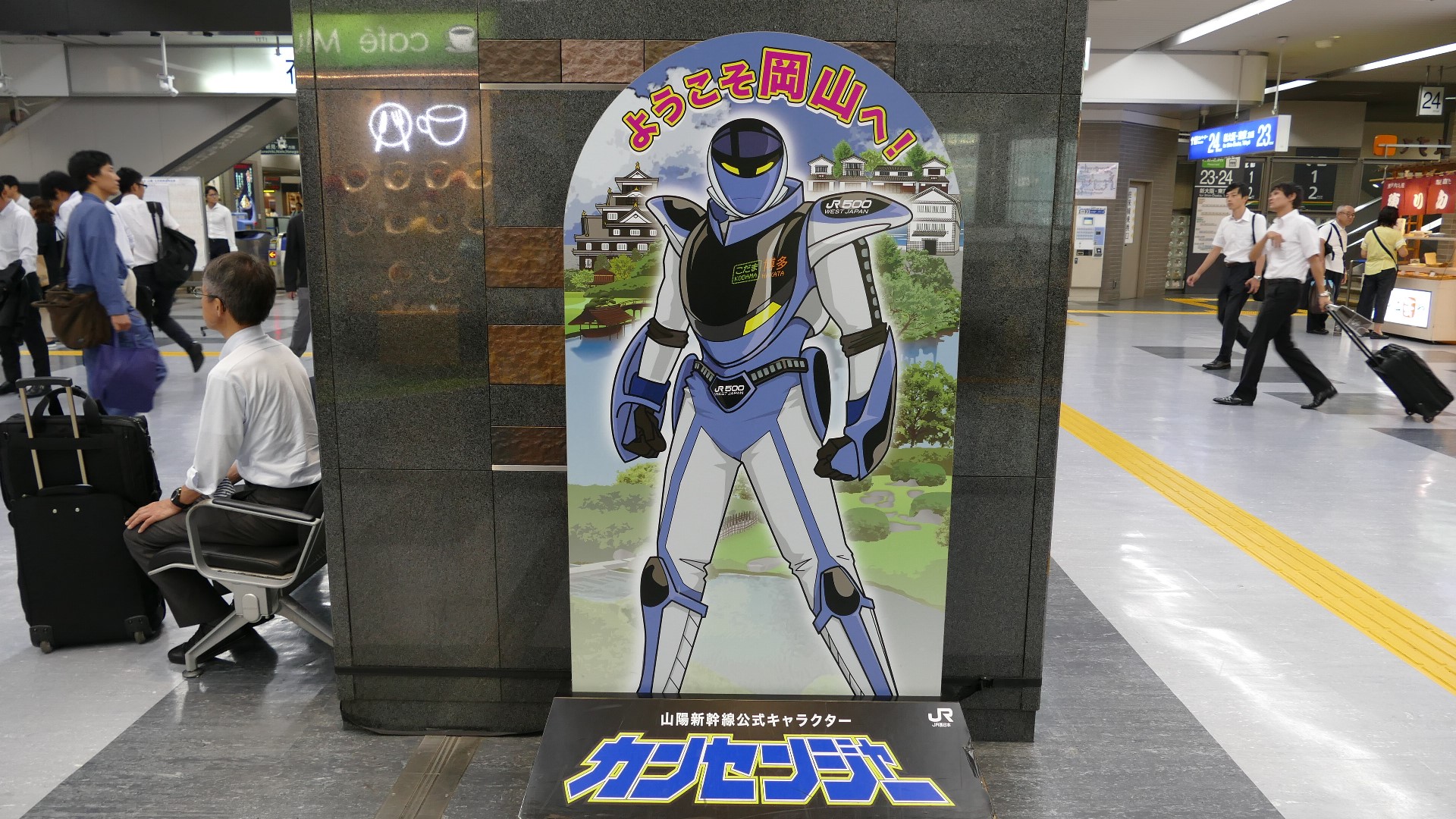 水戸岡さんデザインのMOMO電に乗って。 右下は岡山駅構内のカンセンジャー |