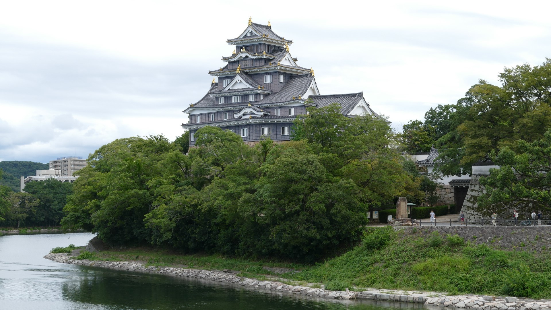 立派な天守・岡山城。天守の中の茶店に「コナン」がやってきた。 後楽園から見る岡山城。売店で買った「梅ジャムソフト」は美味! |