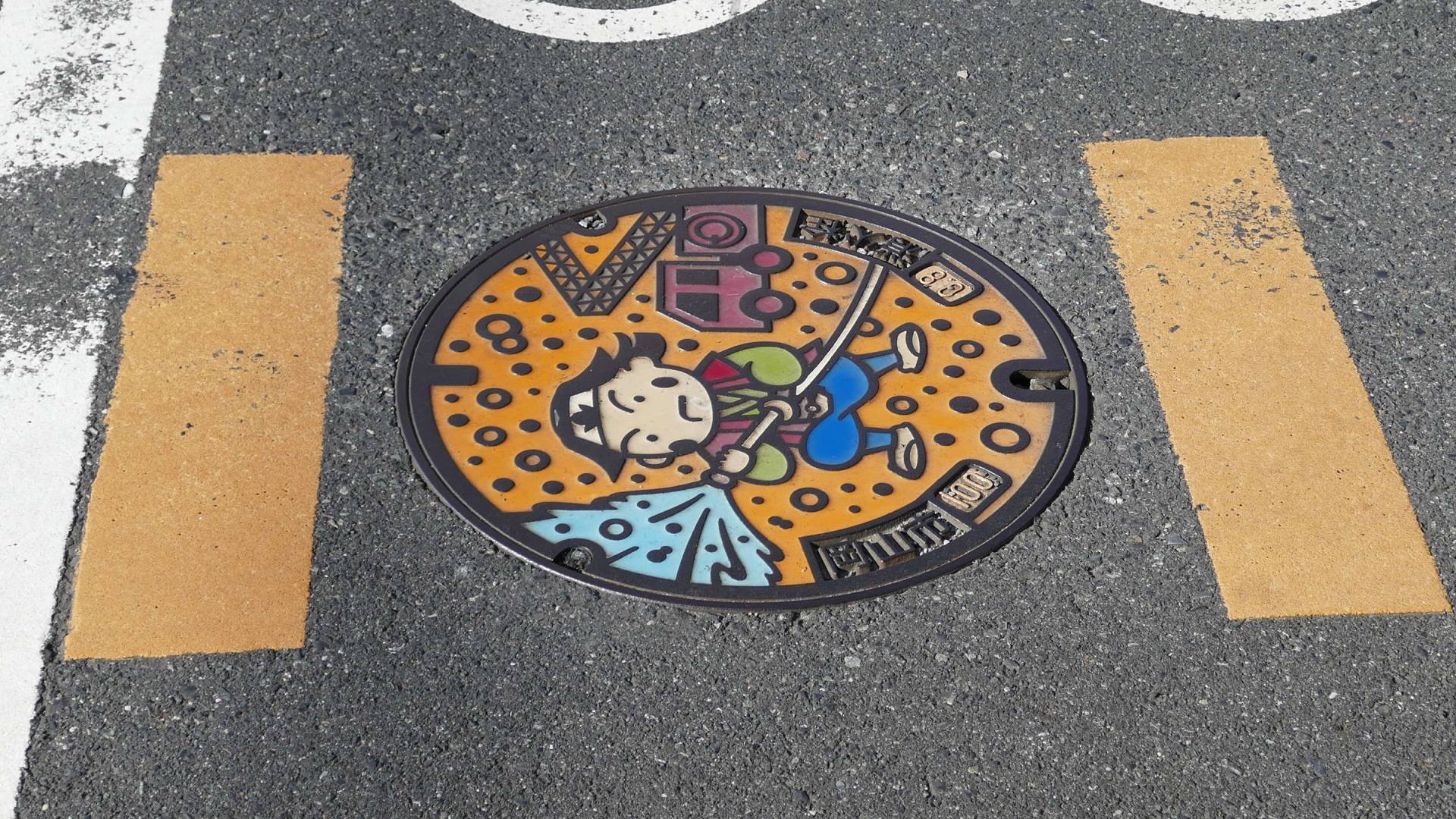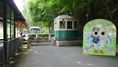 | 東山電停すぐにある「おかでんミュージアム」はソフトオープン期間。2016年秋にグランドオープン予定。 右下は桃太郎マンホール |