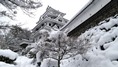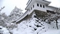 | 絶景車窓を堪能。郡上八幡1120着 | 雪のため頂上までタクシーで行けず。山のふもとから歩いて郡上八幡城へ。 | 北濃から来た「もり」号。奥に見える「あゆ」号が後ろへ連結される。 | 乗車記念 ポストカード |