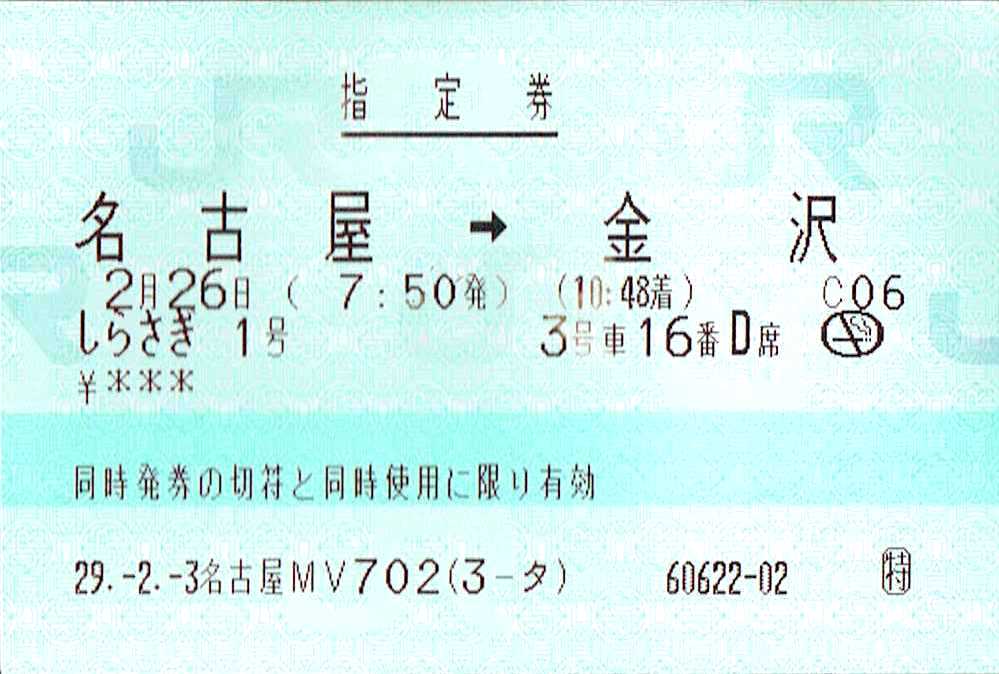 金沢観光紀行 2017.2.26 北陸往復割引きっぷ(名古屋〜米原間の新幹線自由席と米原〜金沢間の特急列車の普通車指定席を利用して往復するきっぷ)で、金沢市内観光や北陸鉄道を満喫。 |