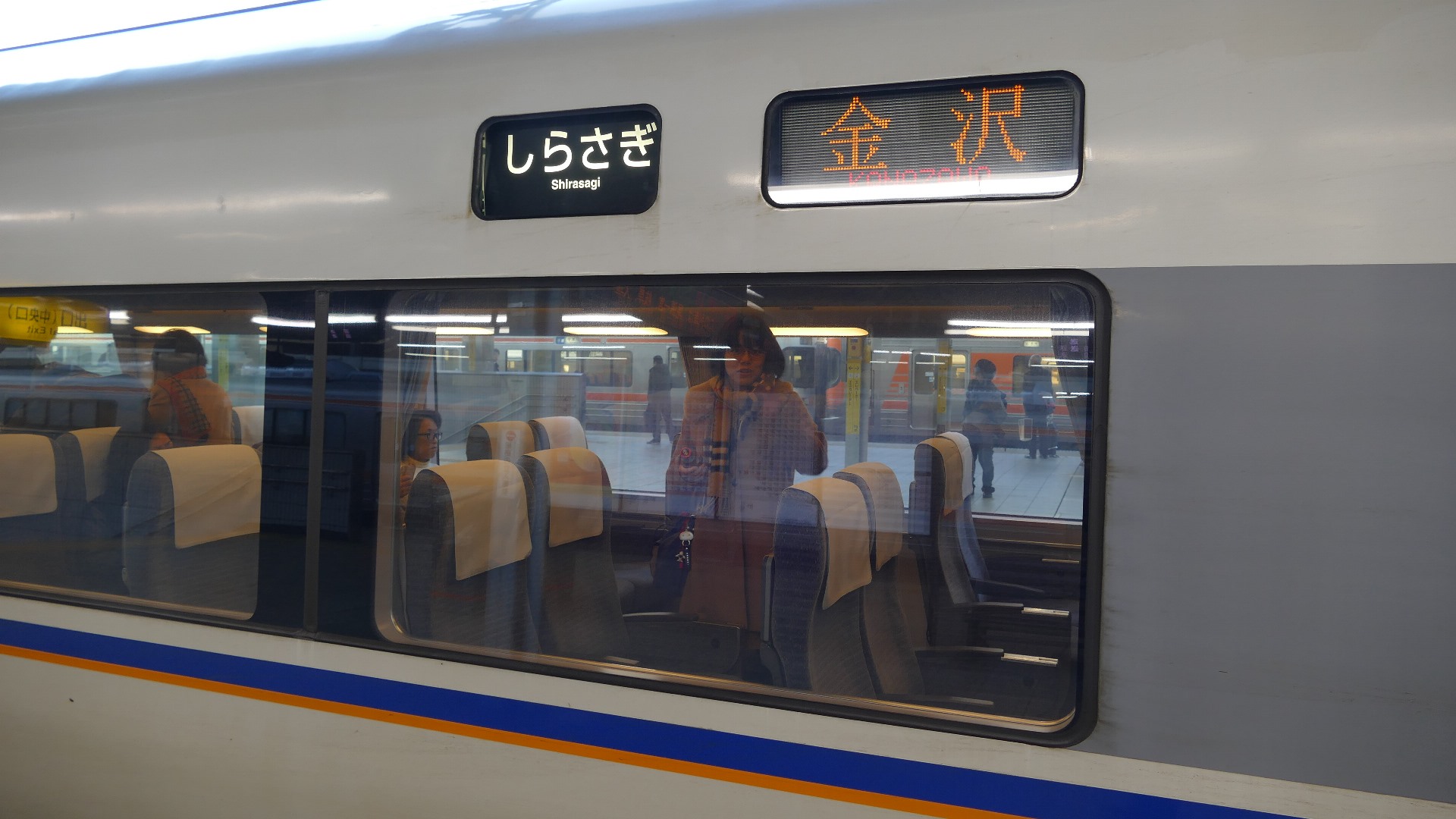 | 名古屋7:50→金沢10:48 しらさぎ1号 しらさぎロゴ消されていた。米原で3両増結。増結部内はクランク通路。 金沢駅ホームは段差大きい、ペッパーくんがお出迎え。 |