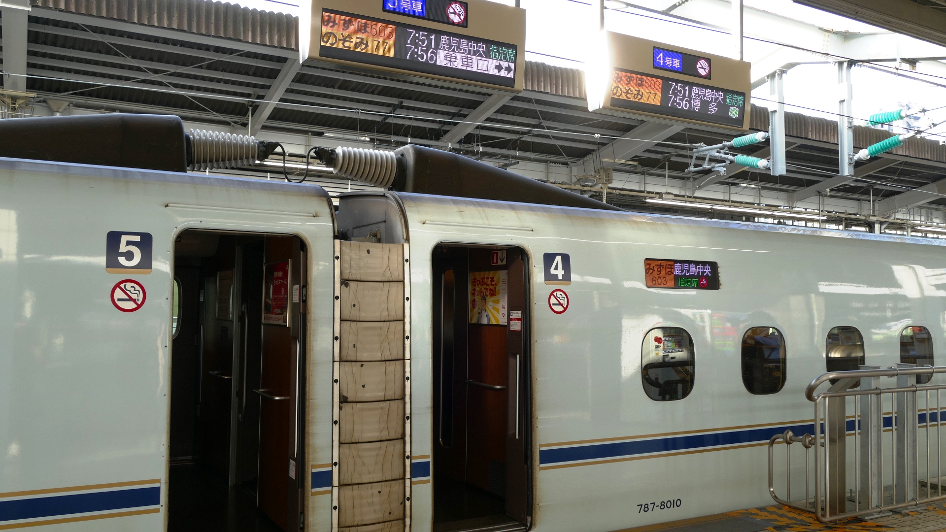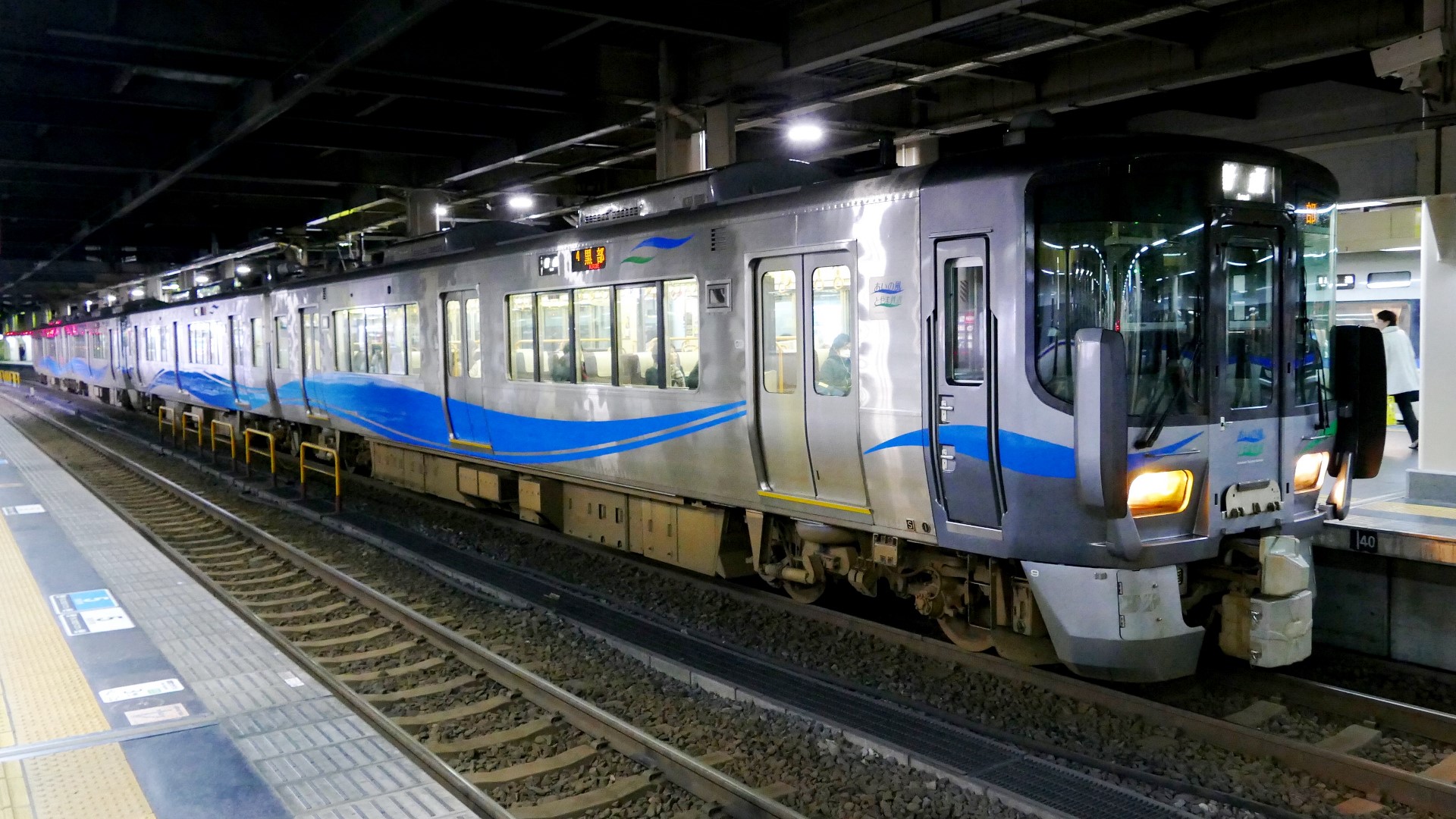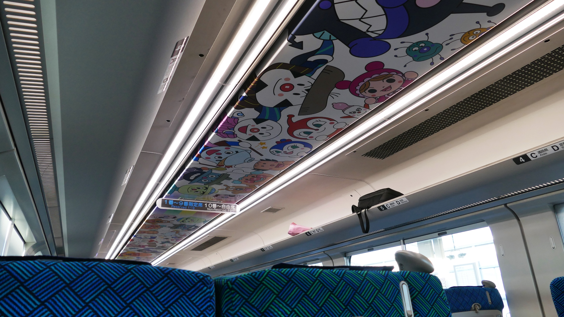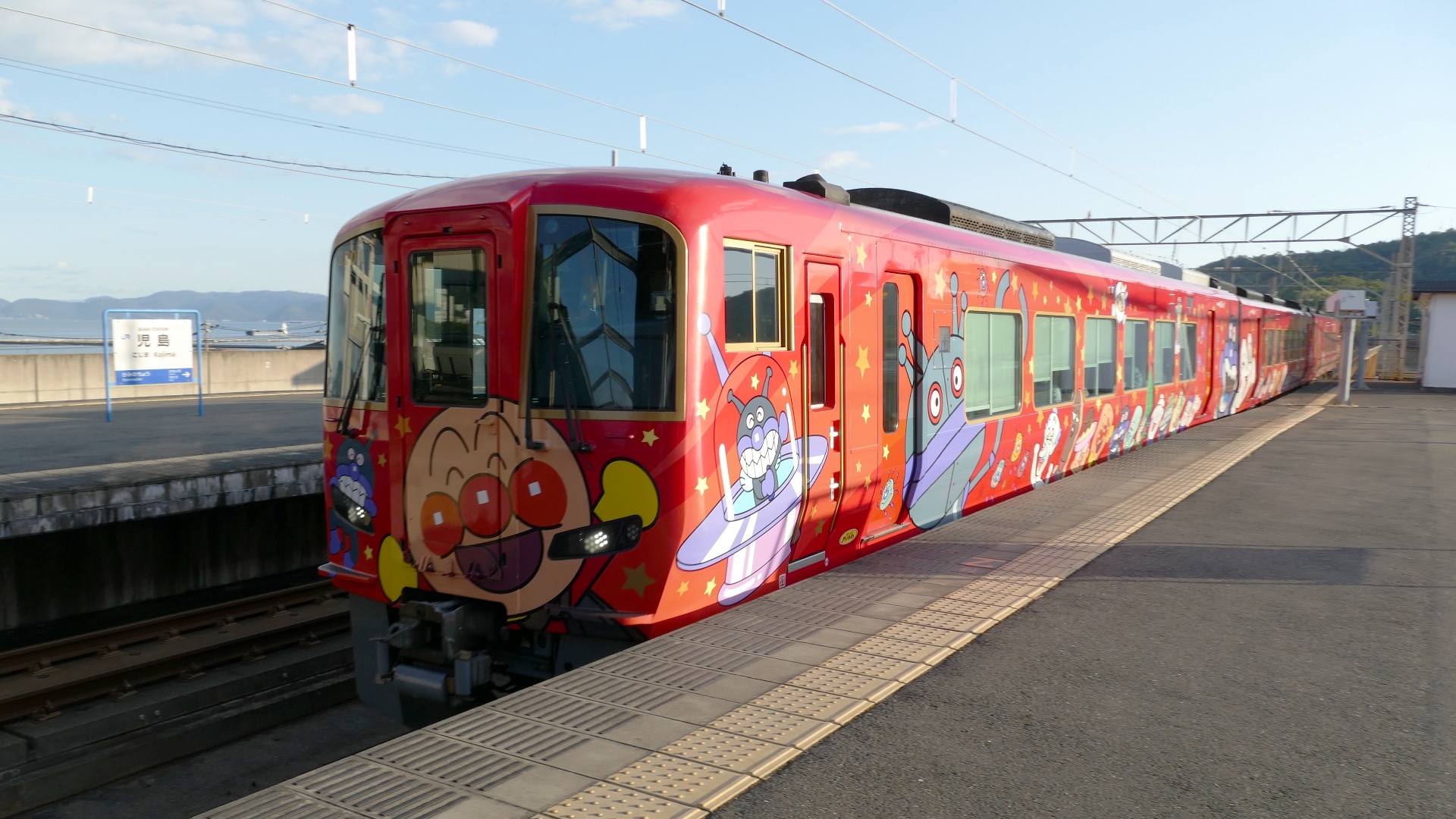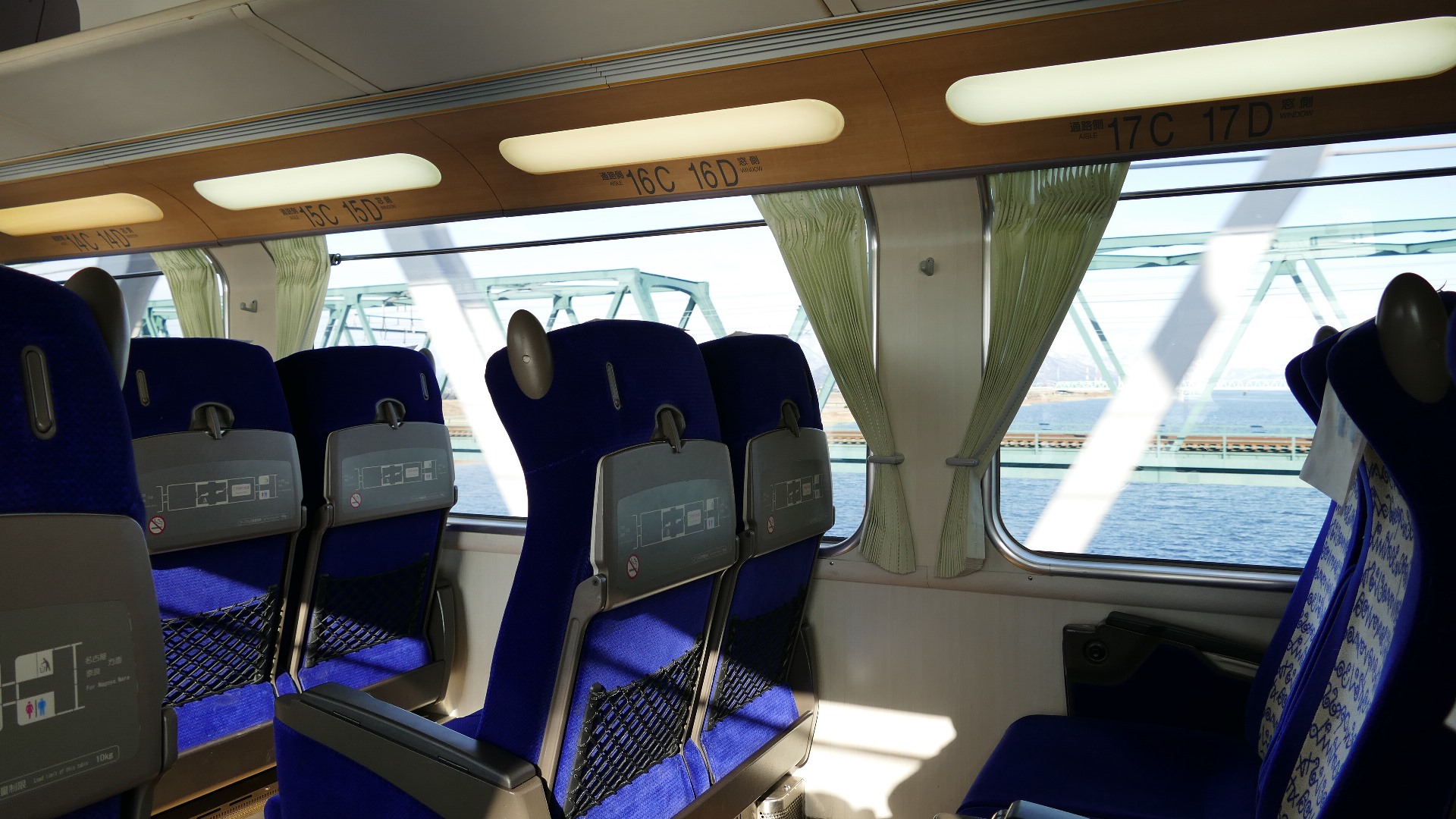 | 通勤特急びわこエクスプレスで旅のはじまり。683系サンダーバード車両。新大阪駅ではN700Sを見かける。 | みずほ603号で岡山へ。指定席は2-2列のゆったりシート | 南風2700系気動車アンパンマン列車指定席で児島駅へ。 児島はジーンズの聖地としてアピールしている。 |