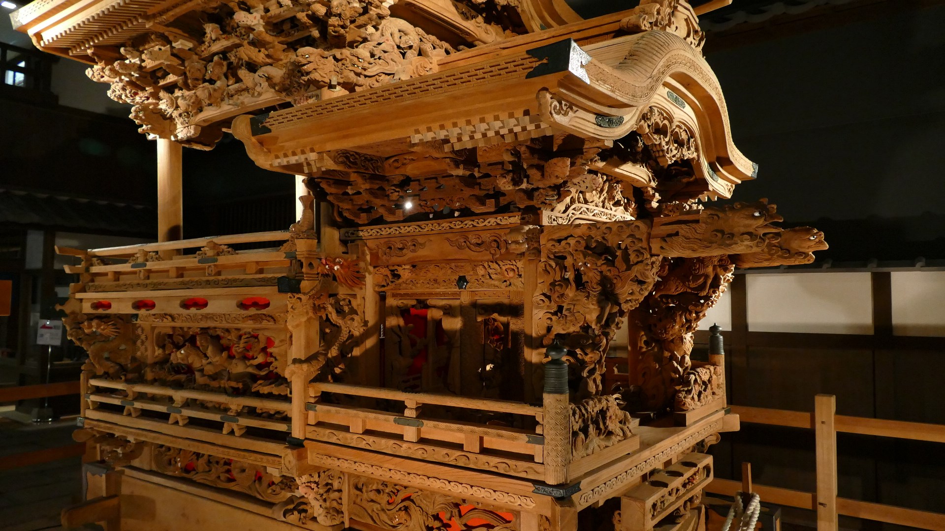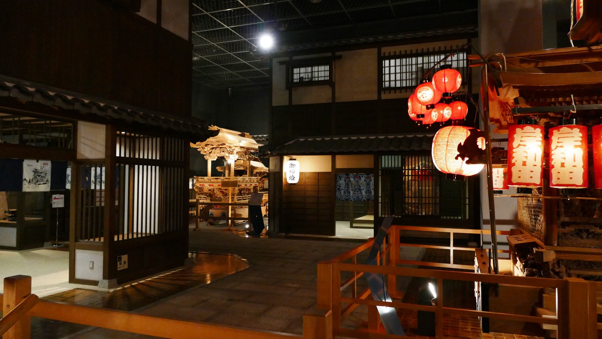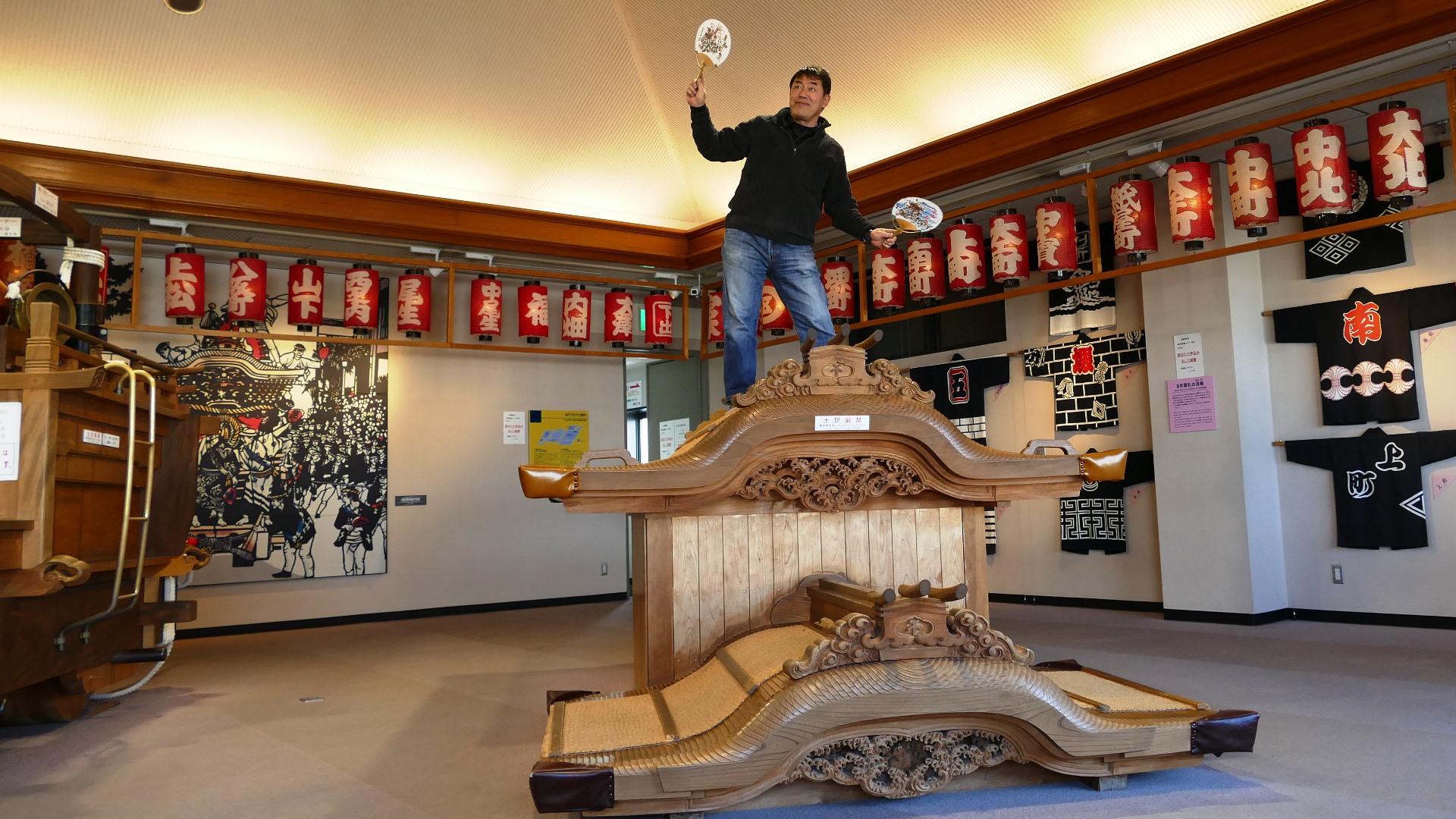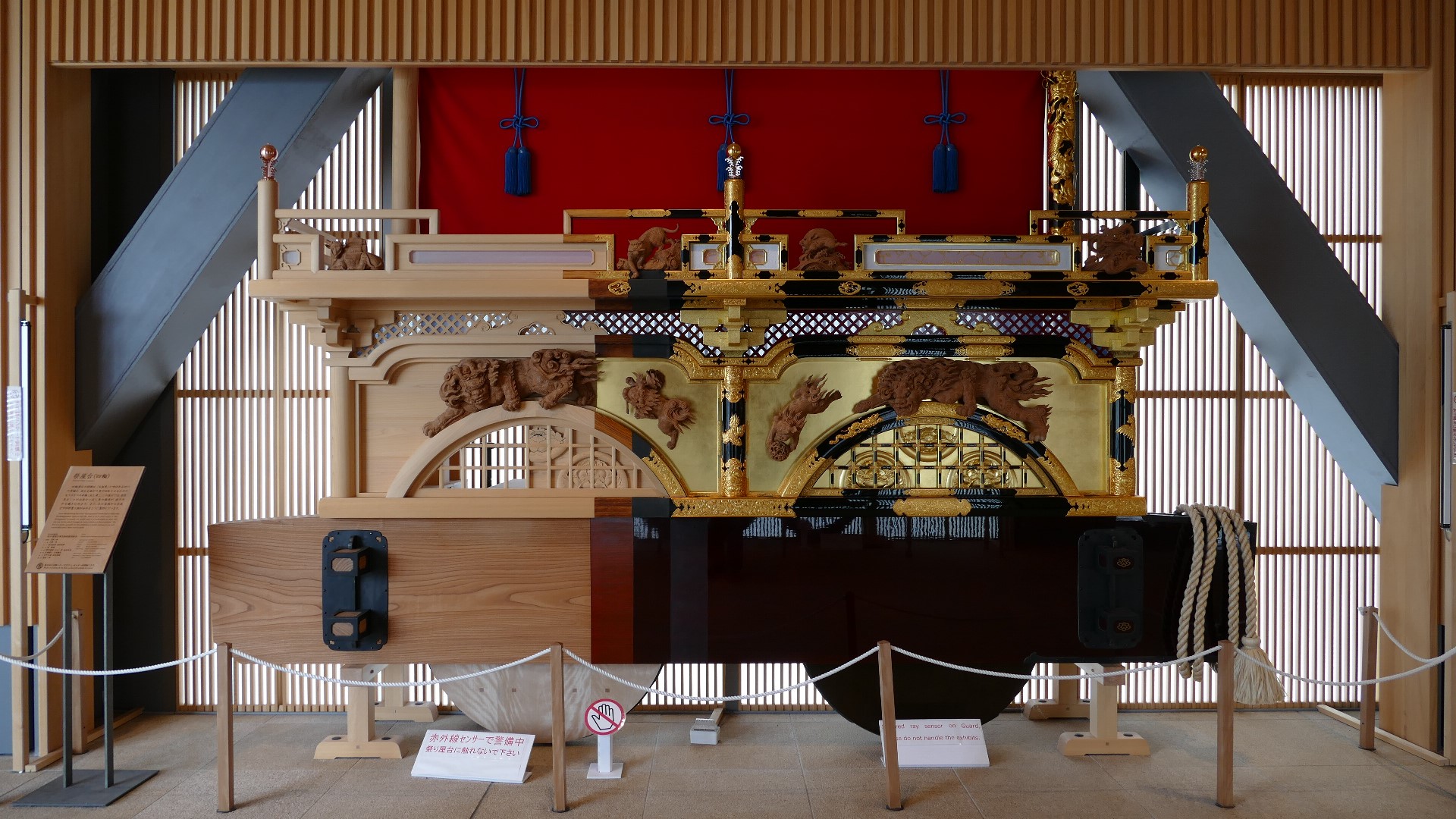 | 天守からの眺望。「明石大橋」や「あべのハルカス」も見える。 | 岸和田と言えば「だんじり」。城そばにある「だんじり会館」 3Dだんじりシアターは迫力。 だんじり体験コーナーも面白い。 |