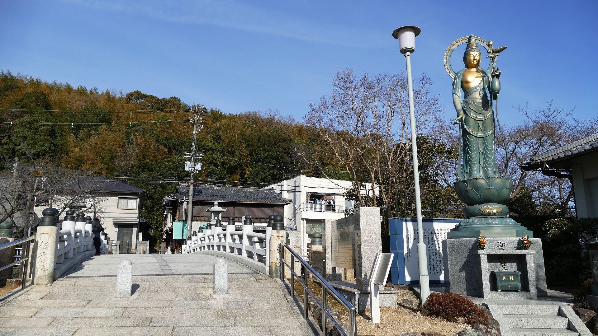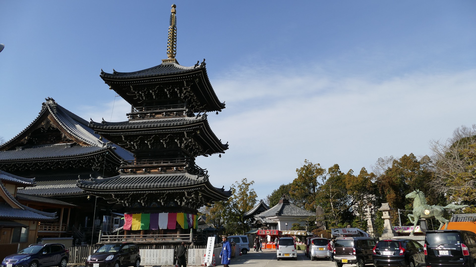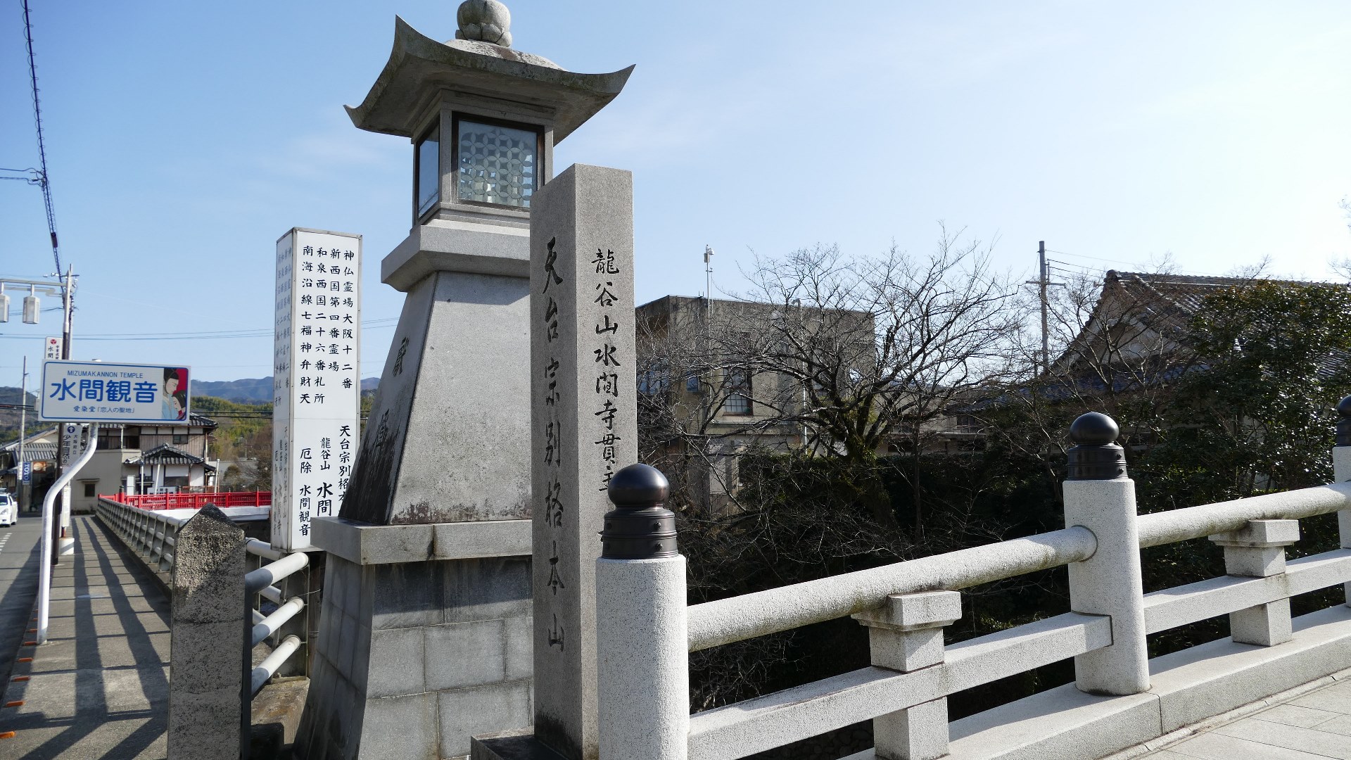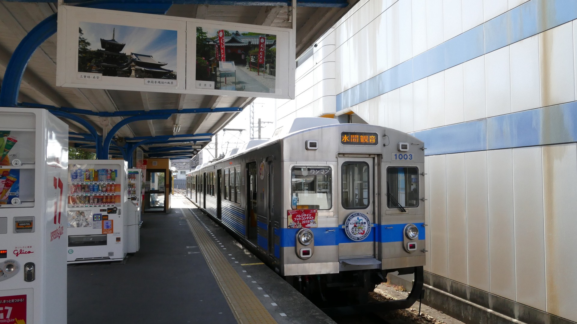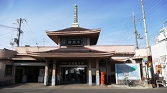 | 水間鉄道は女性パワーが大きいと聞いていたが日曜は男性ばかりなのか? ワンマン運転でも交通系ICカードが使える。 近畿の駅百選の水間駅舎。 | 水間寺(通称:水間観音) 本堂や三重塔は立派。 |