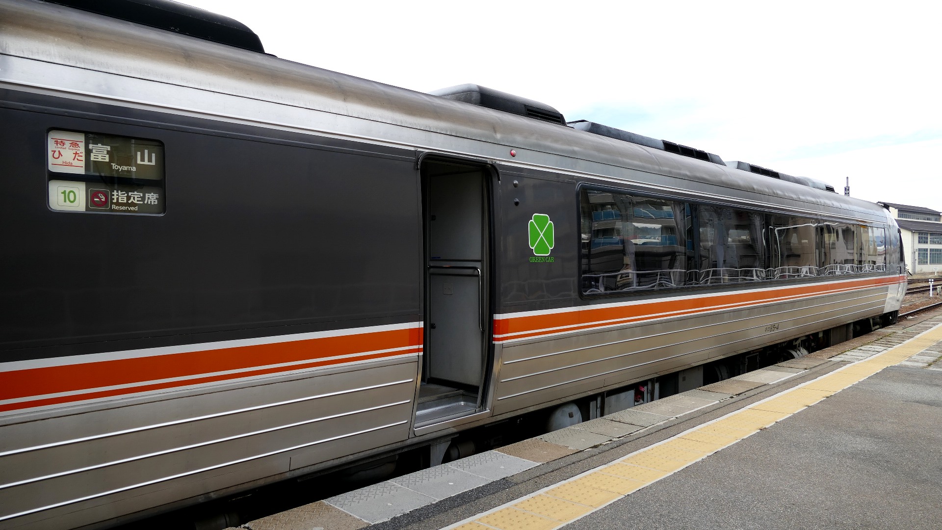 | 高山1101→富山1229 ひだ3号パノラマグリーン車。追い金してても乗りたかった。 | ひだ8と交換 猪谷で交代、 富山平野展望 まもなく富山 |