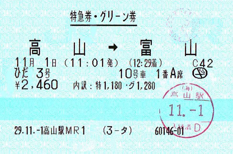 | 出発は、名古屋745→高山1016 ひだ1号指定席。普通車でも座り心はイイ。 | 高山駅は知らぬ間に建て替えられていた。二階に改札があり、ホームは一階。 | ひだ3号到着 | |||||
