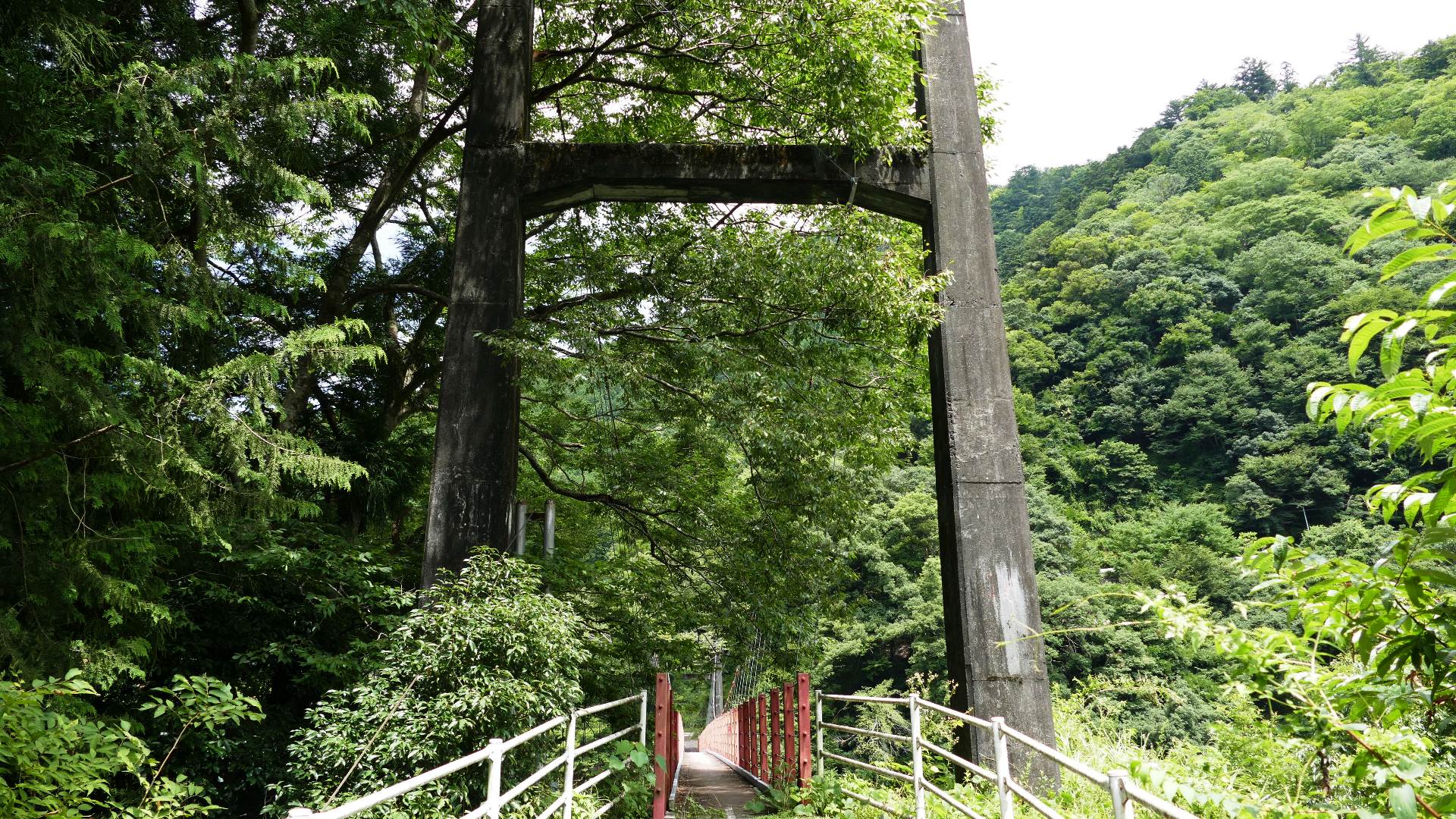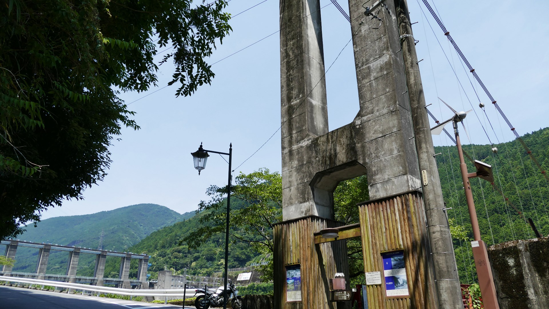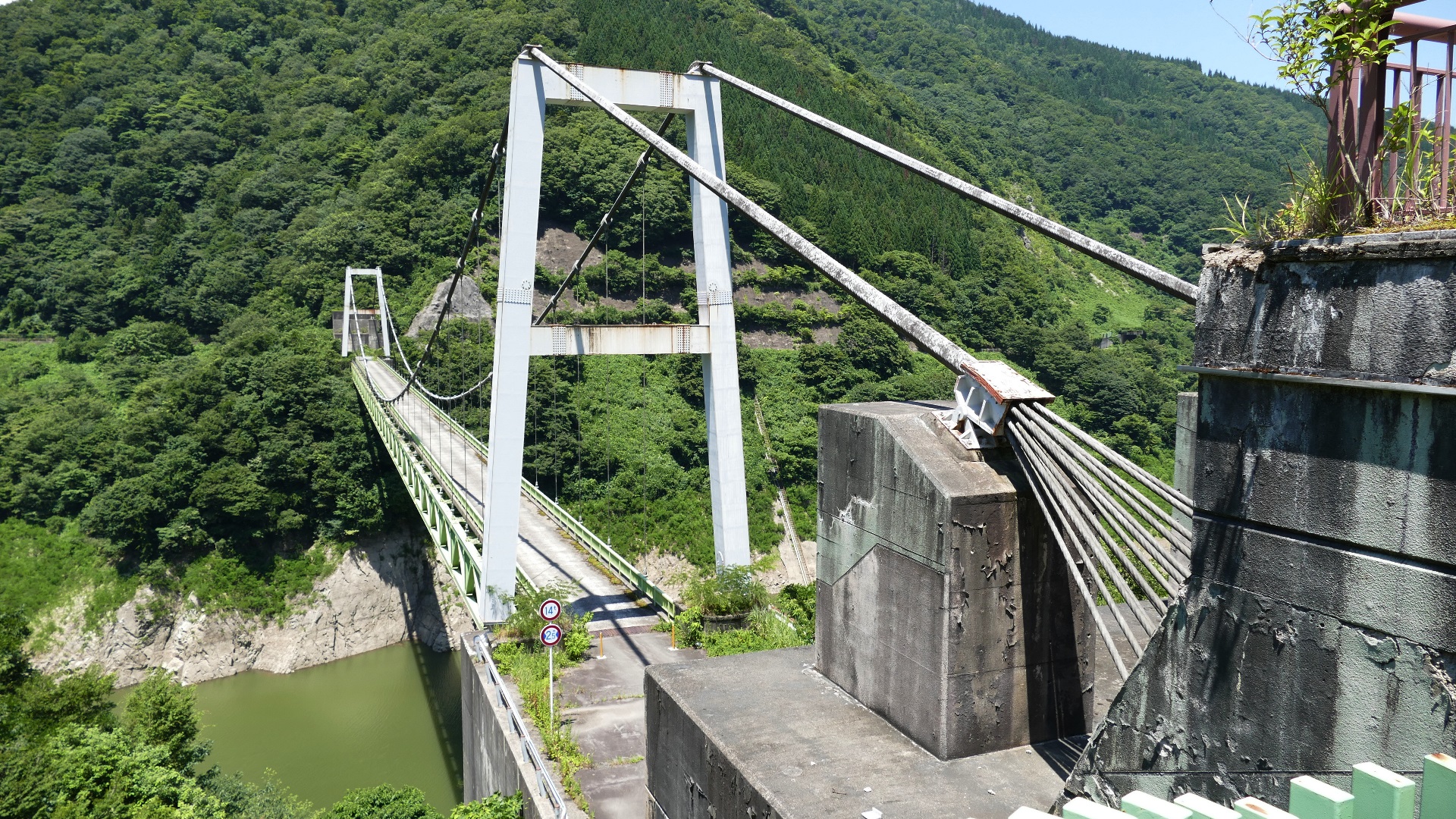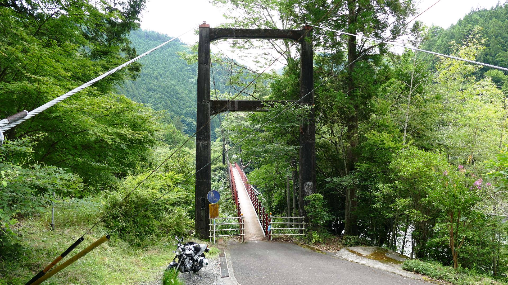 | 風屋ダム北部にある集落と二村小学校(現廃校)とつなぐ生活橋。橋長62m。 橋を渡ったすぐ先は何とトンネルになっている。 |