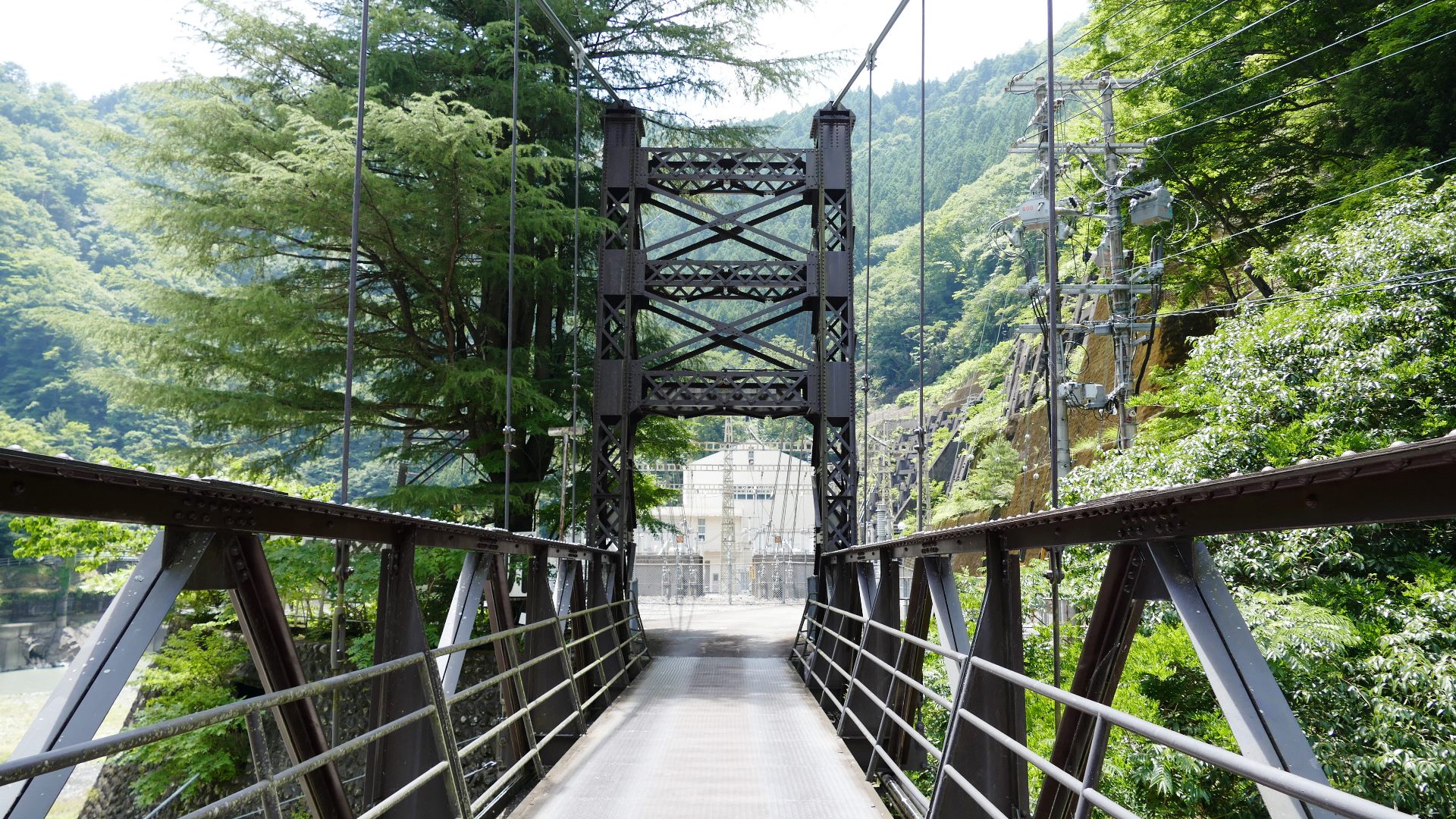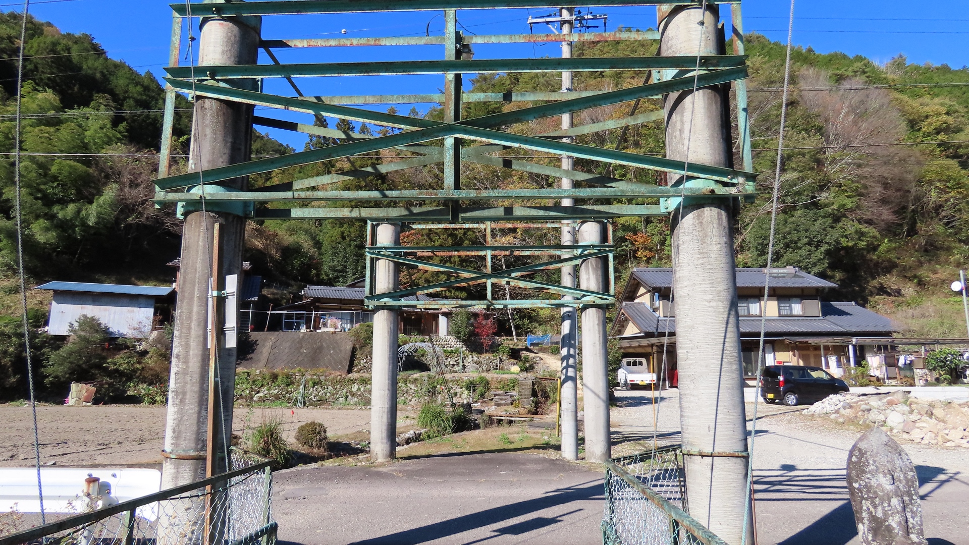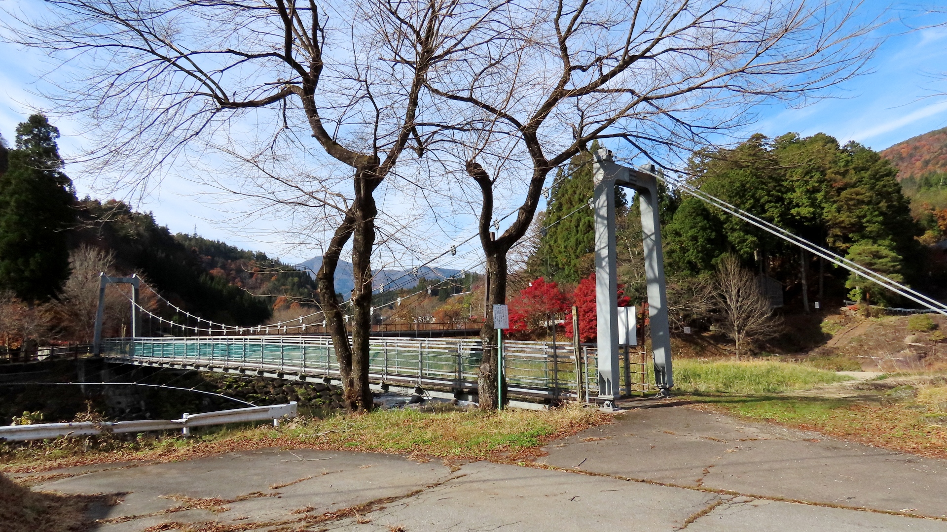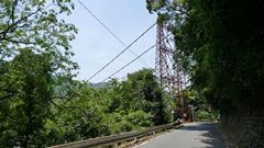 | JR高山本線敷設工事により白川口駅が開業した同い年の大正15年に完成した鋼製の吊り橋。珍しい鋼主塔トラス構造で、欧米風の洗練された美しく安定感があるデザイン。案内板 2017.11.19 | 上麻生ダムの北にある、国道41号を跨ぎ飛騨川に架かる 関係者以外立入禁止の吊橋 2025.9 |