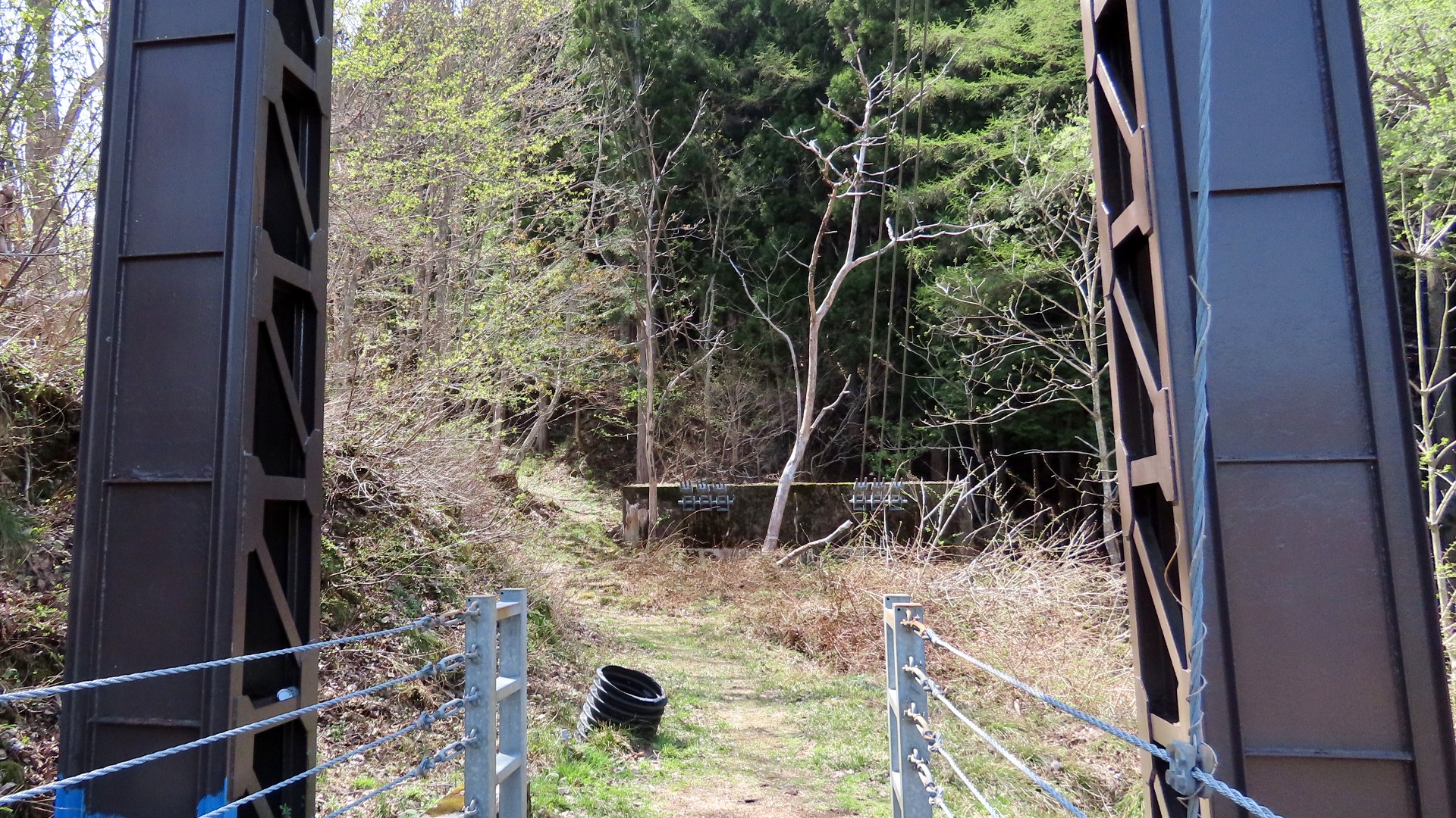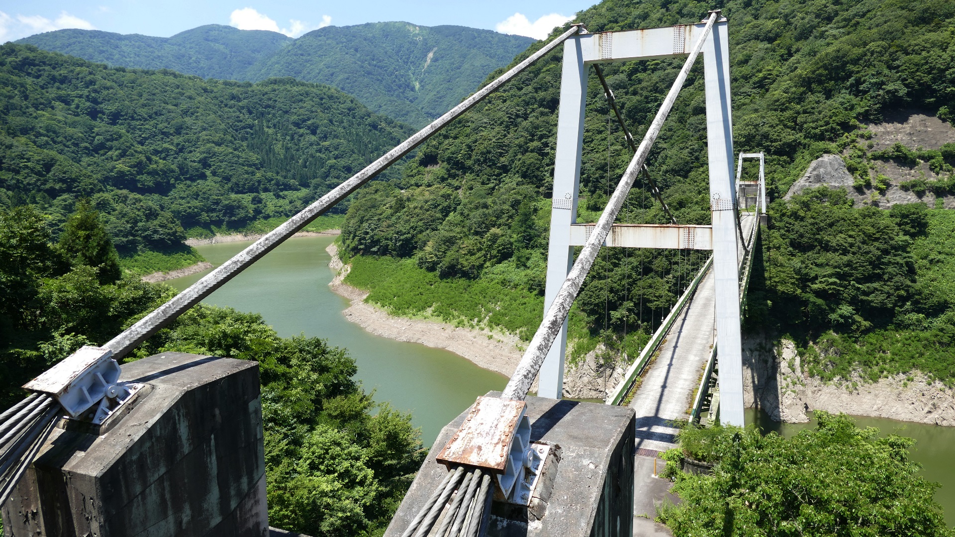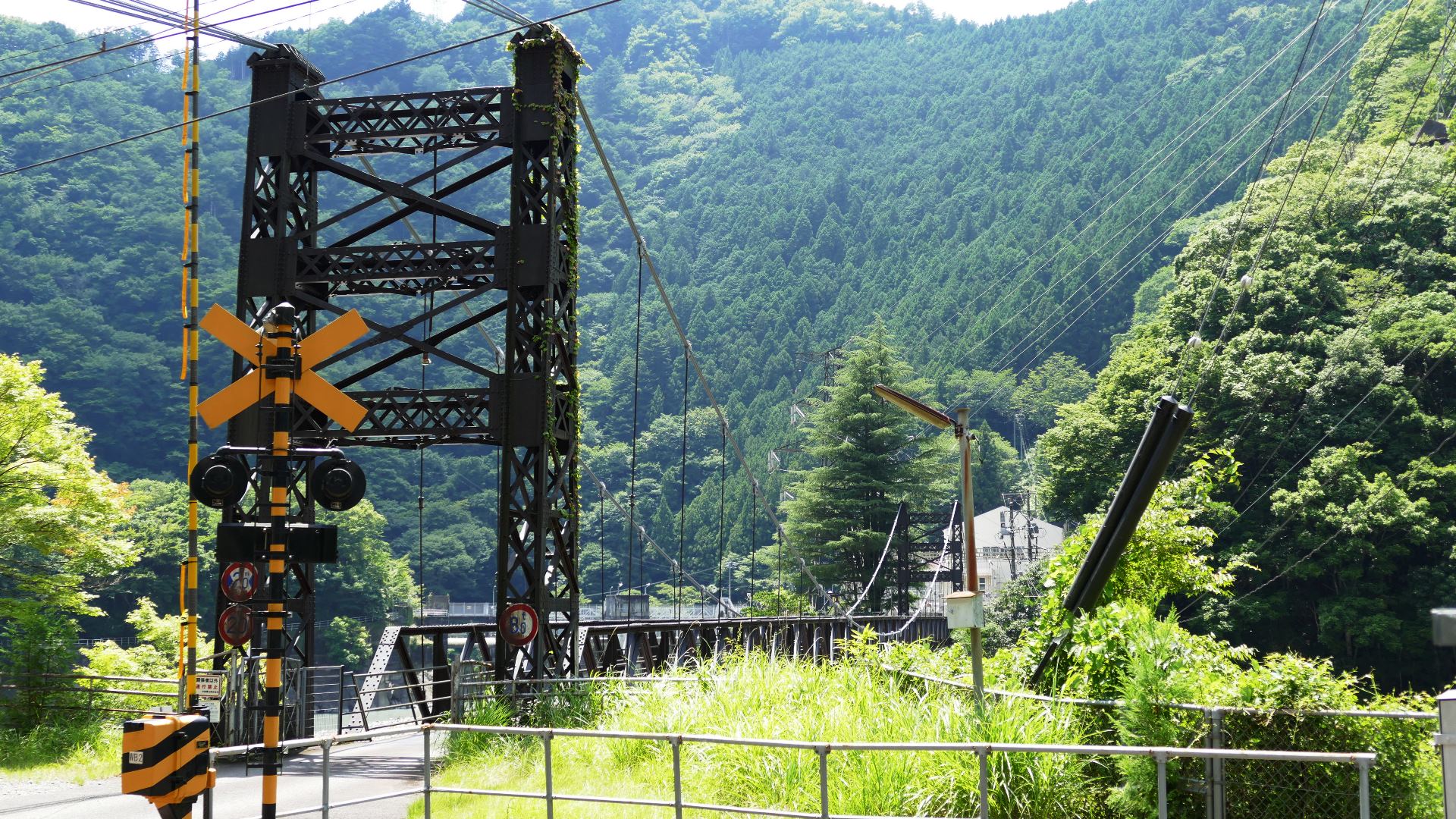 | JR高山本線敷設工事により白川口駅が開業した同い年の大正15年に完成した鋼製の吊り橋。珍しい鋼主塔トラス構造で、欧米風の洗練された美しく安定感があるデザイン。案内板 2017.11.19 | 上麻生ダムの北にある、国道41号を跨ぎ飛騨川に架かる 関係者以外立入禁止の吊橋 2025.9 |