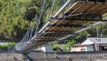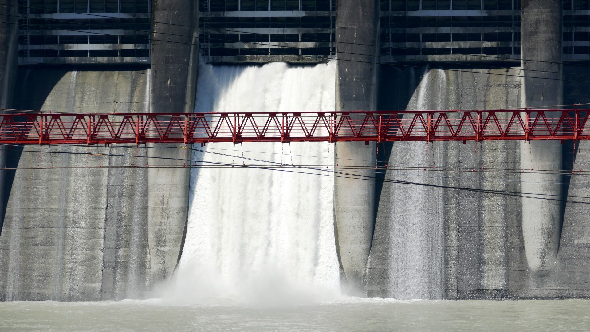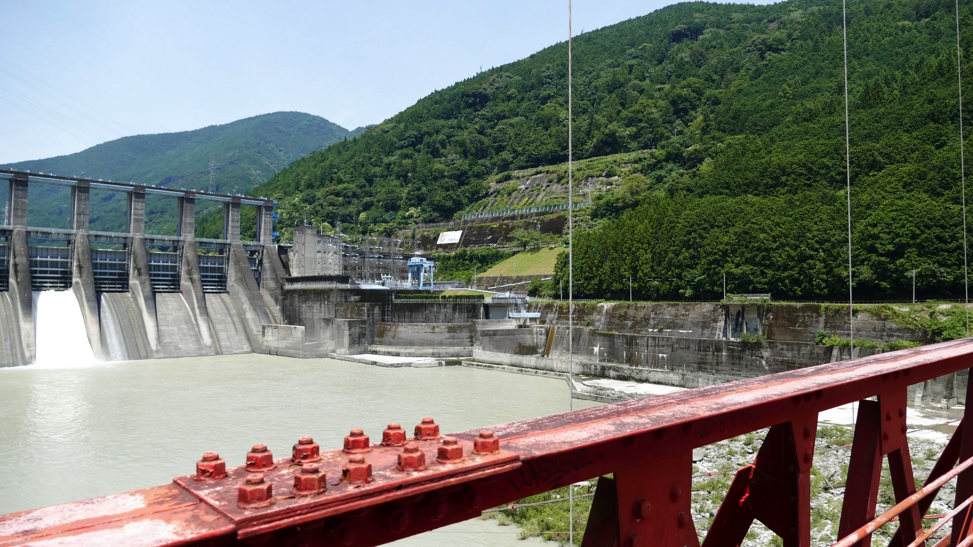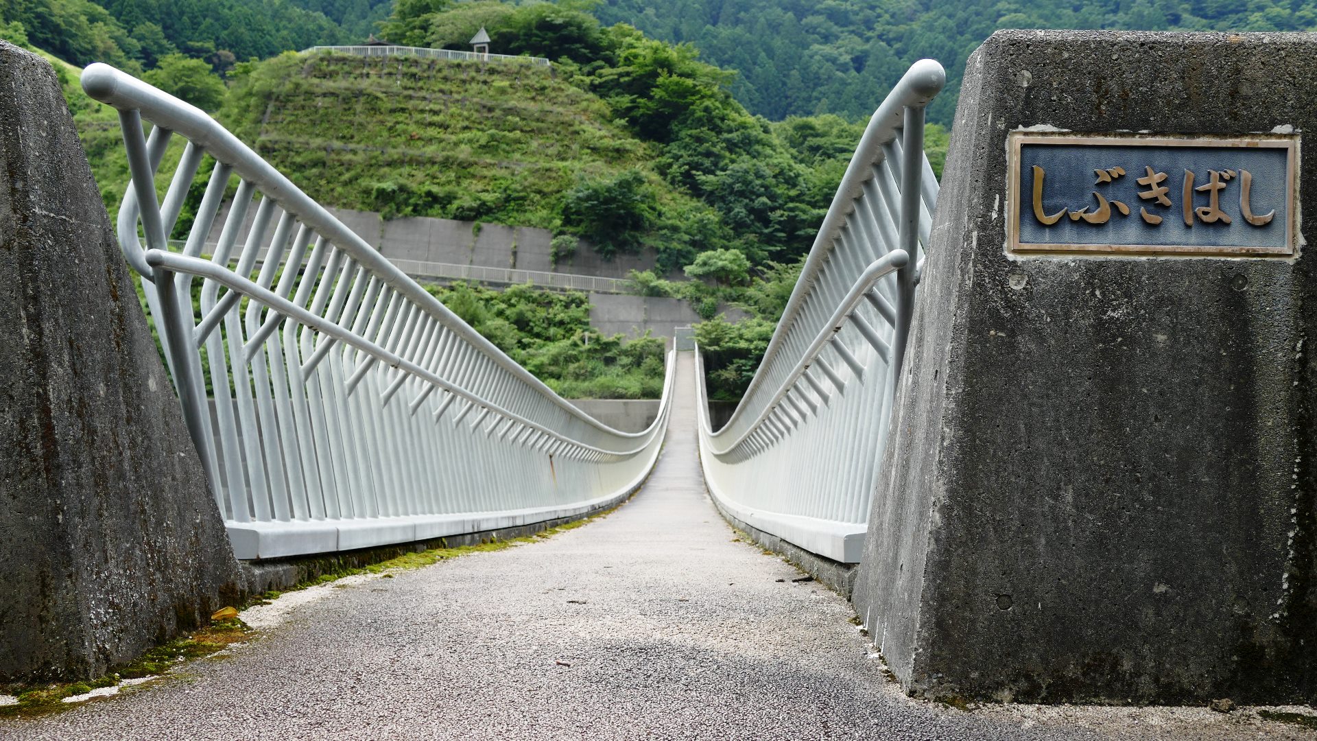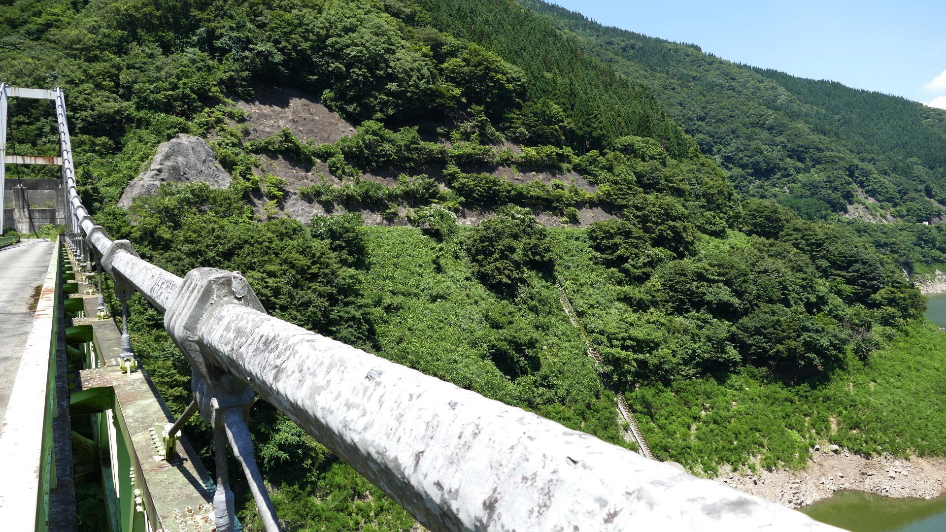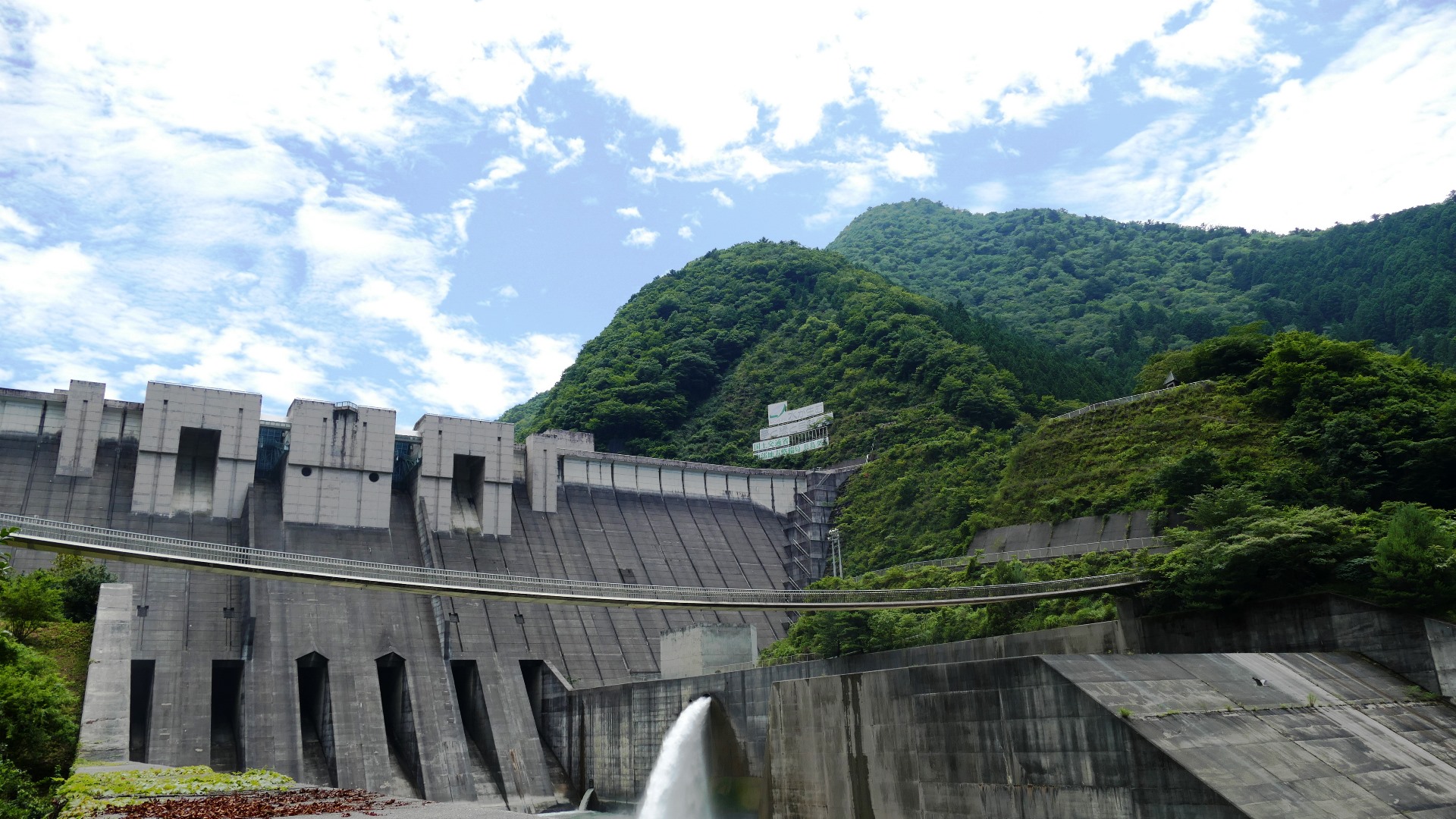 | 吊橋のようにたわんでいるコンクリート製の橋 ダムからの放水しぶきがかかることはまず無い 2024.7 |